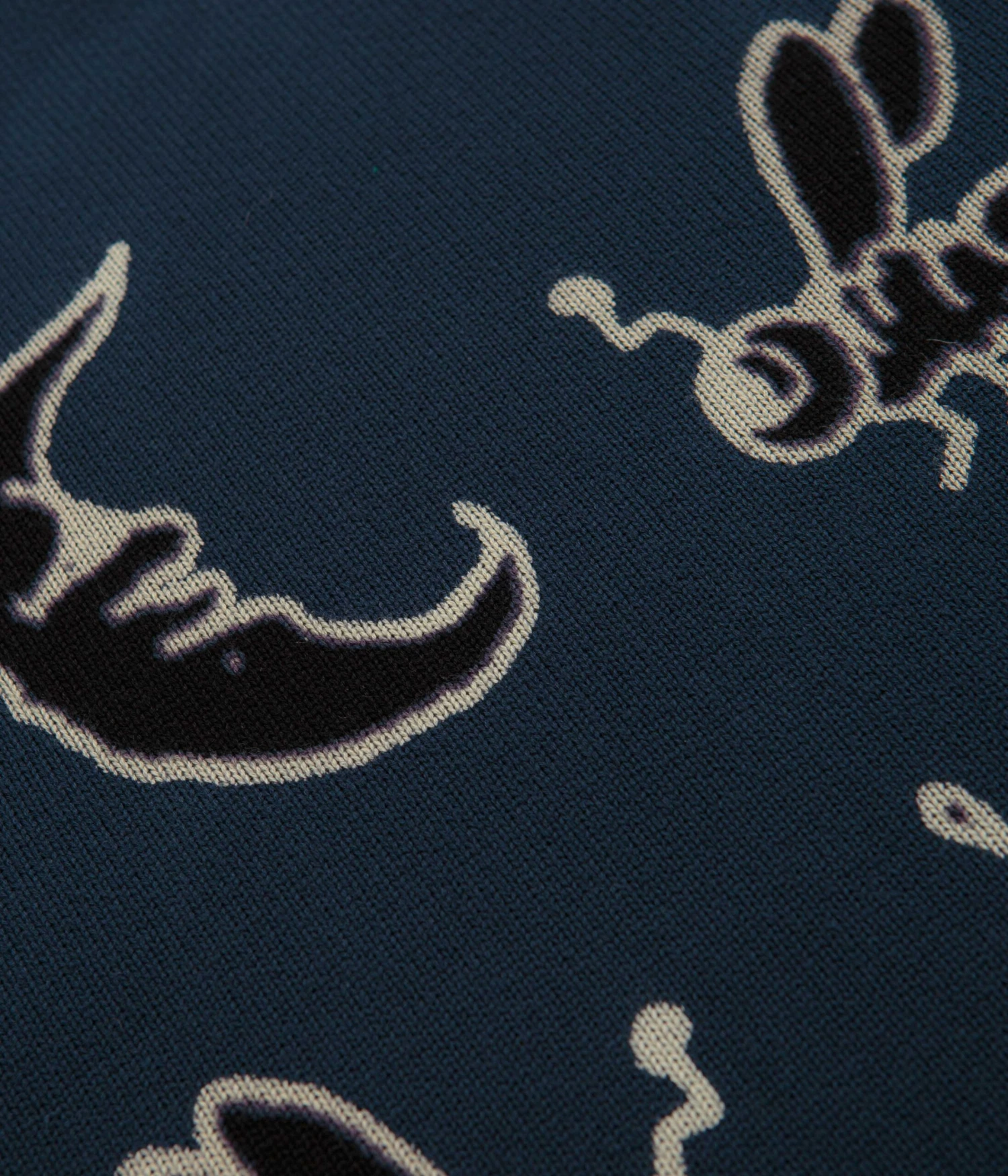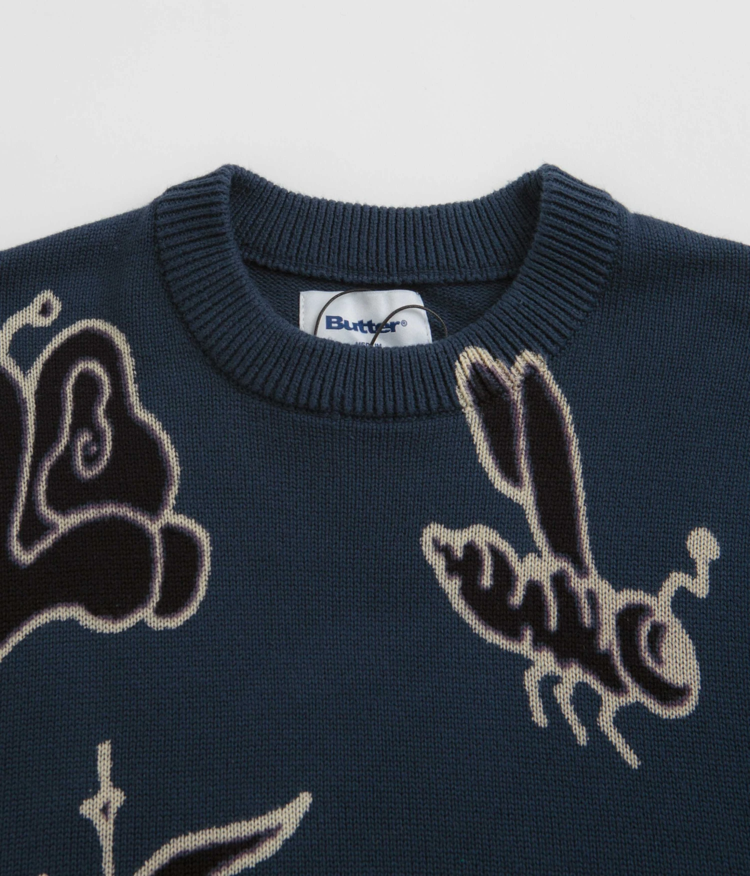 Butter Goods Critter Knitted Sweatshirt in Slate. Tailored to a regular fitting from 100% acrylic, this Butter Goods sweatshirt is designed with an all-over discharge graphic. Featuring a flexible rib knit collar, ribbed cuffs and a woven elastic hem, this blue grey Butter Goods sweater is finished with jacquard critter graphics and with woven flag label branding.