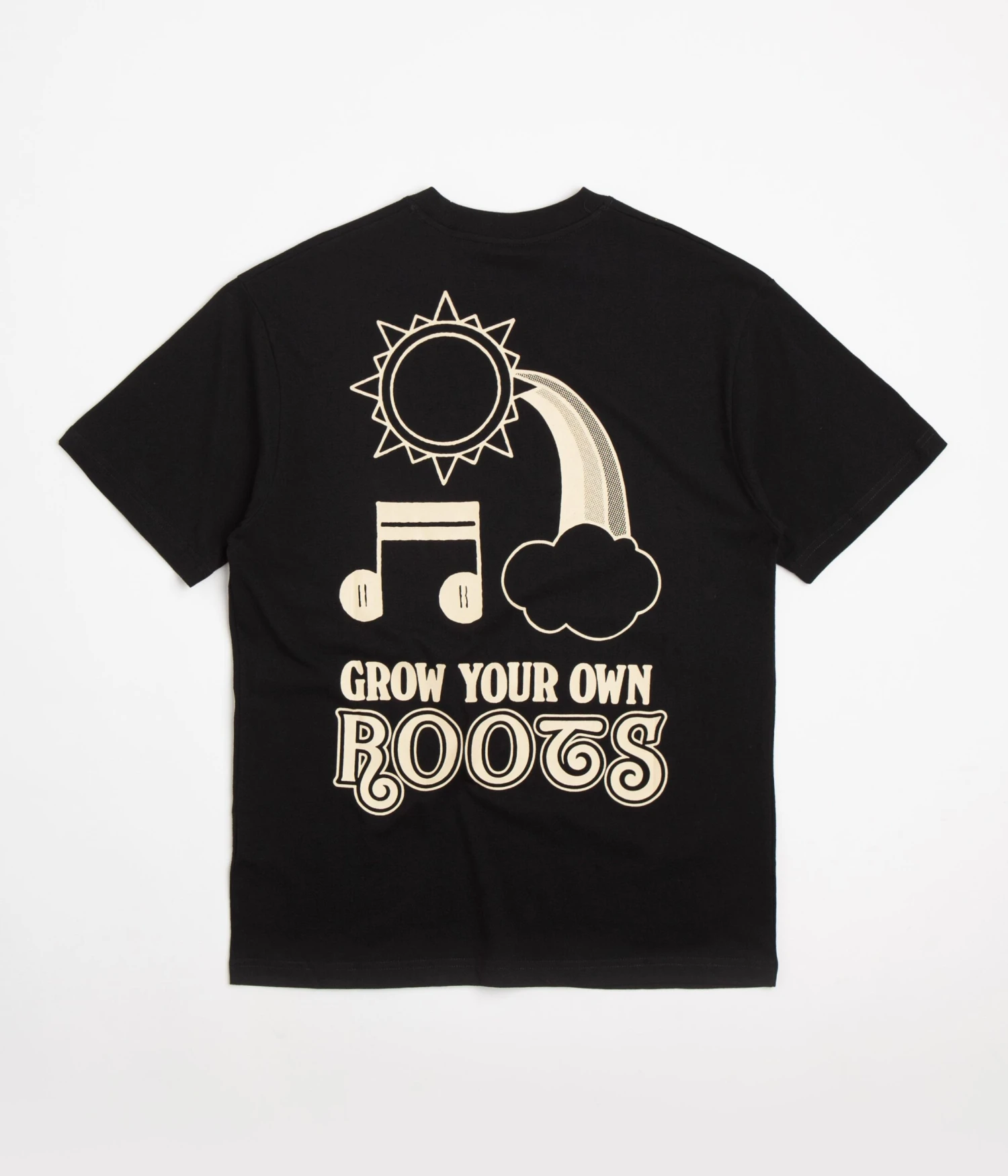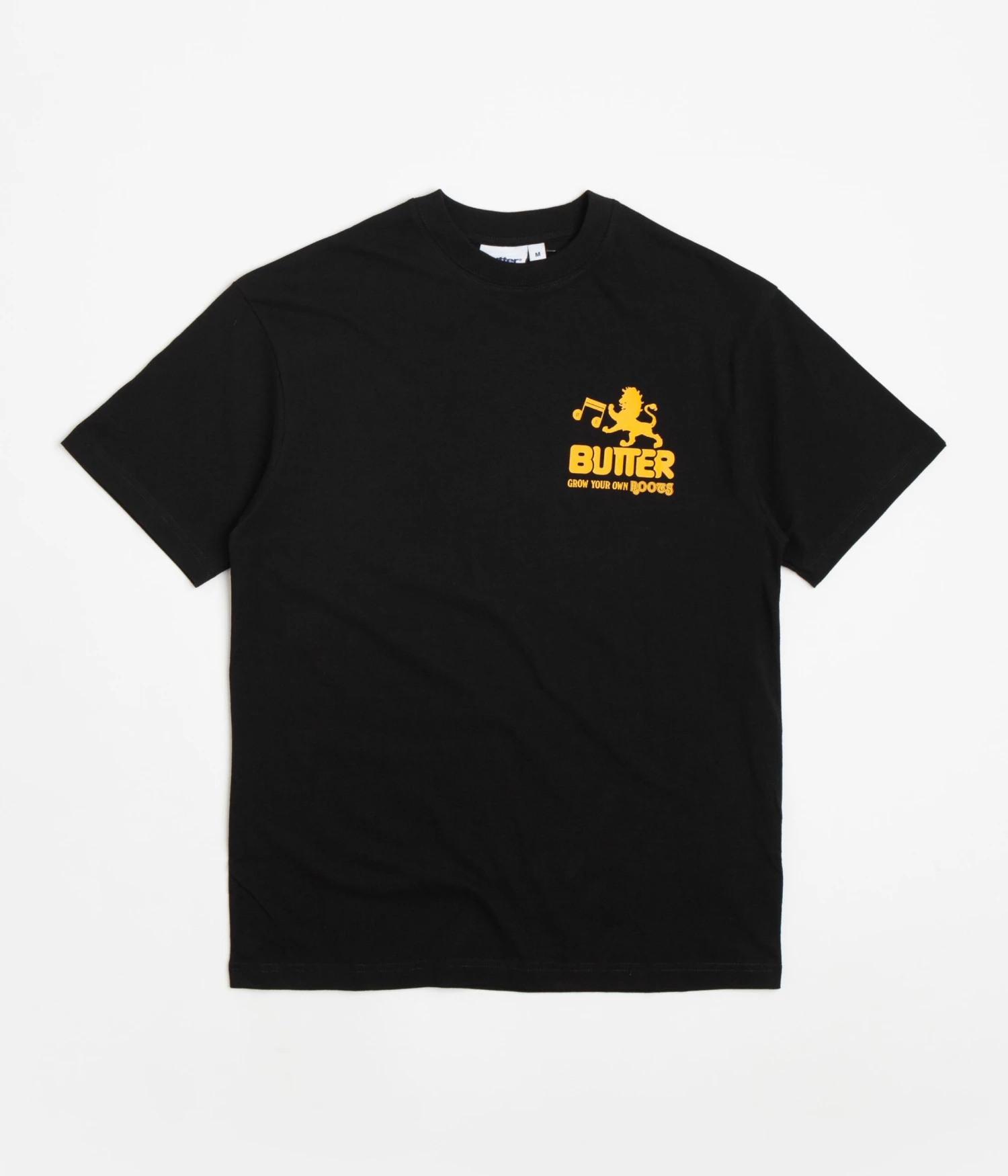 Butter Goods Grow T-Shirt in Black. Tailored to a regular fitting from 100% cotton, this new season Butter Goods t-shirt is styled with a flexible rib knit collar and a straight cut hem. Finished with tonal stitched seams, this black Butter Goods t-shirt is finished with screen printed ‘Grow Your Own Roots’ graphics displayed across both the left chest and reverse.Â