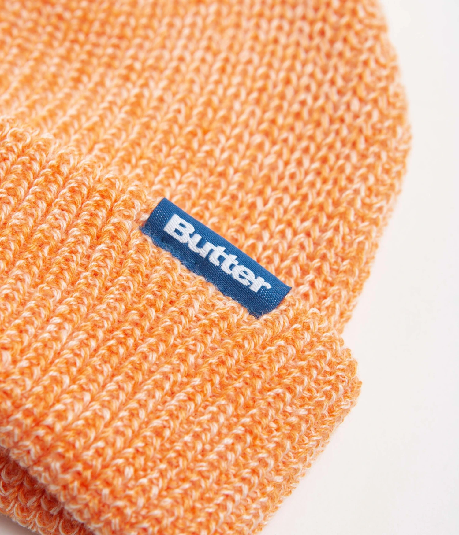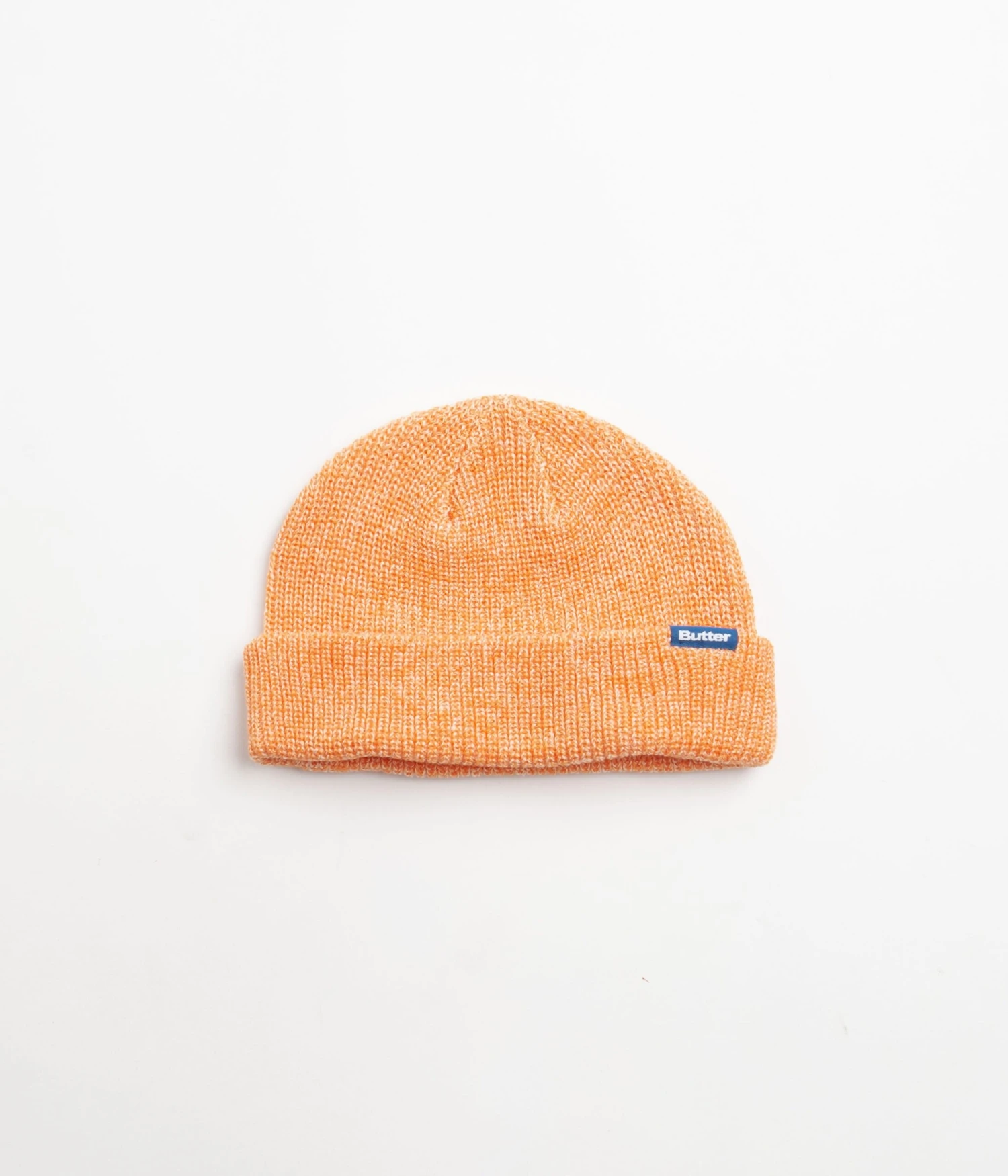 Butter Goods Marle Beanie in Orange. Made from 100% acrylic, this single sized Butter Goods beanie is styled with a short cut and a marled fabrication. Featuring tonal stitched seams, this orange Butter Goods beanie is finished with a turn-over cuff with woven flag label branding.Â