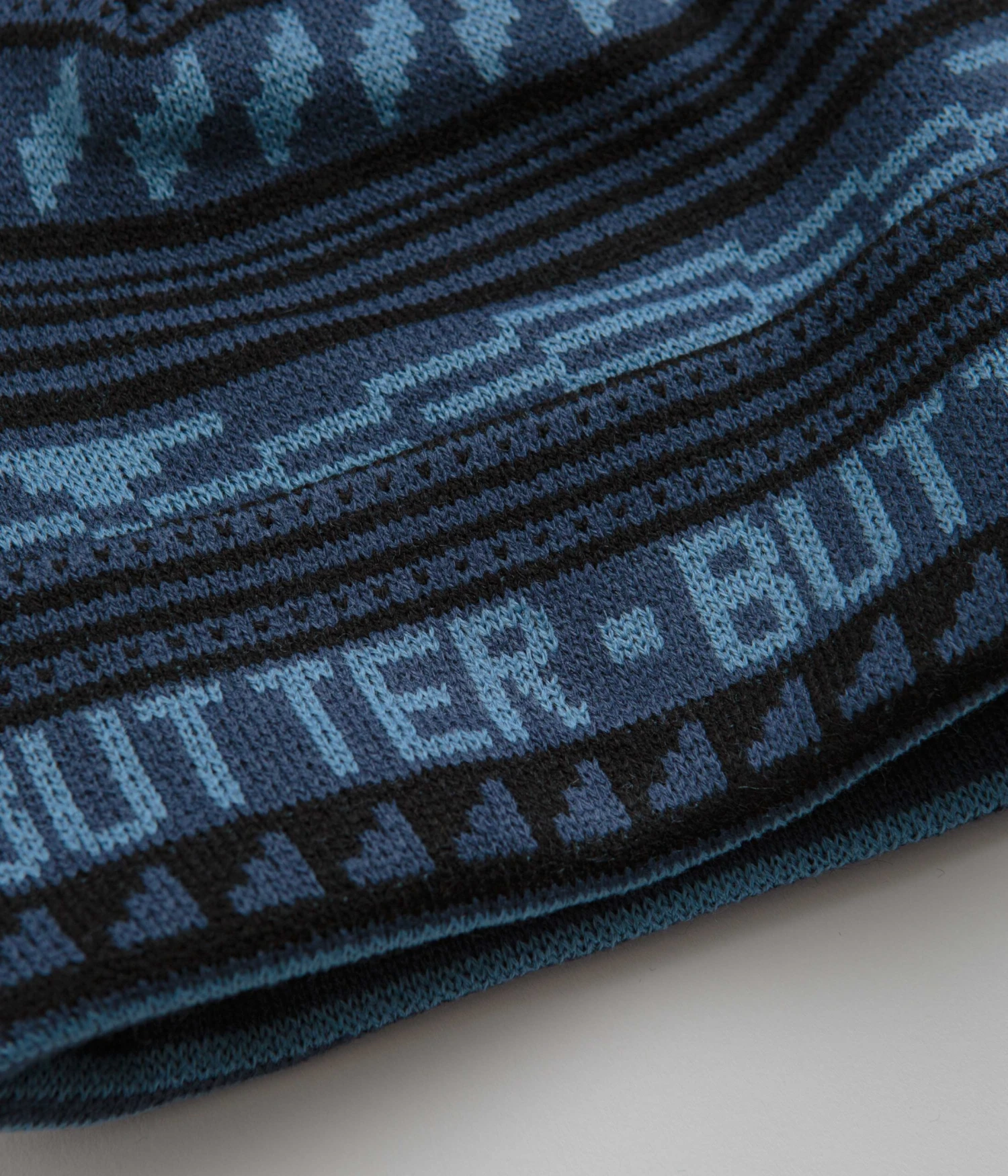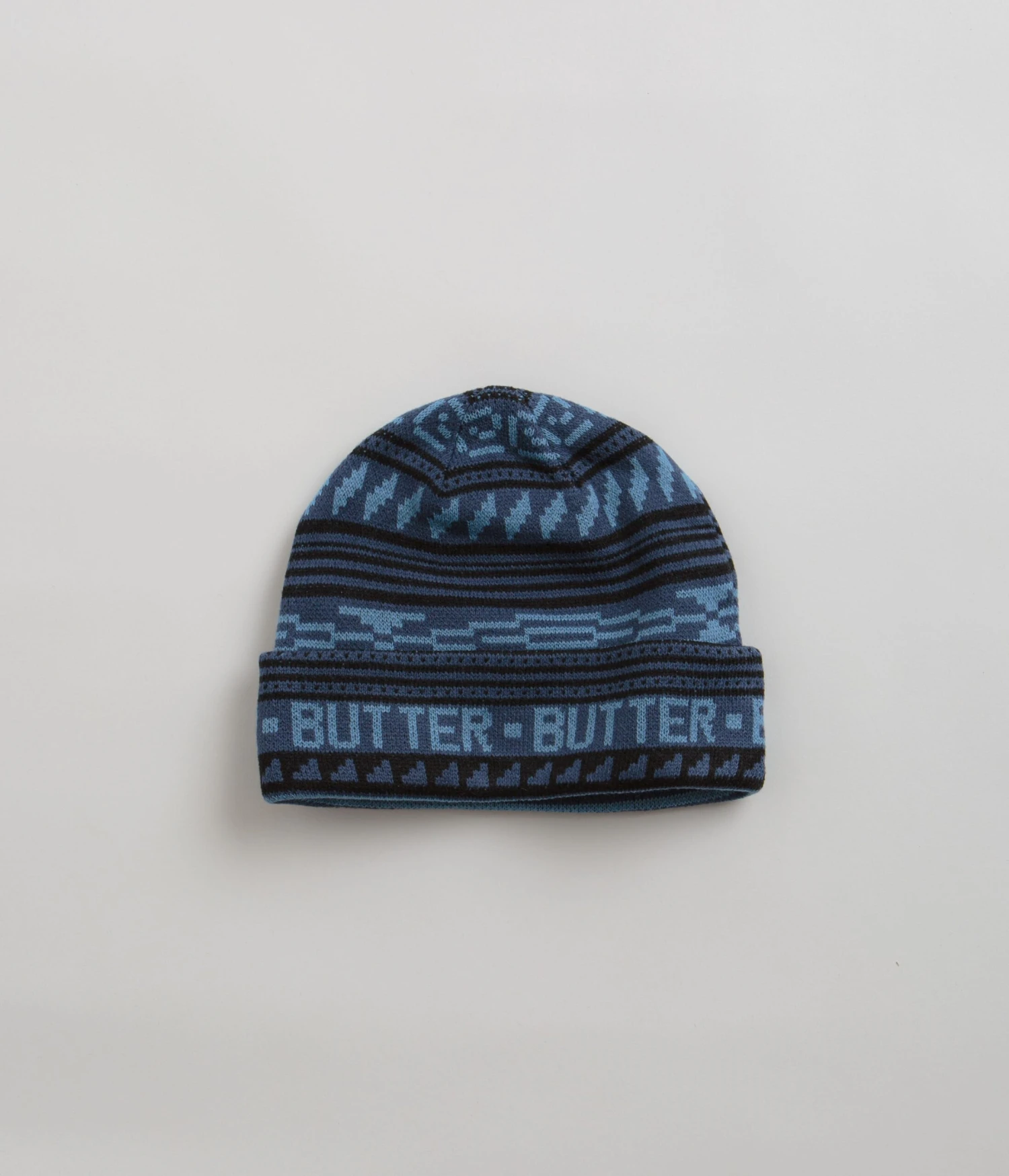 Butter Goods Porto Beanie in Navy. Part of the brand’s latest release, this single sized Butter Goods beanie is made from 100% acrylic with an all-over jacquard graphic. Featuring a stretchy rib knit face and an adjustable fold-over cuff, this navy Butter Goods beanie is finished with a regular cut and geometric details.