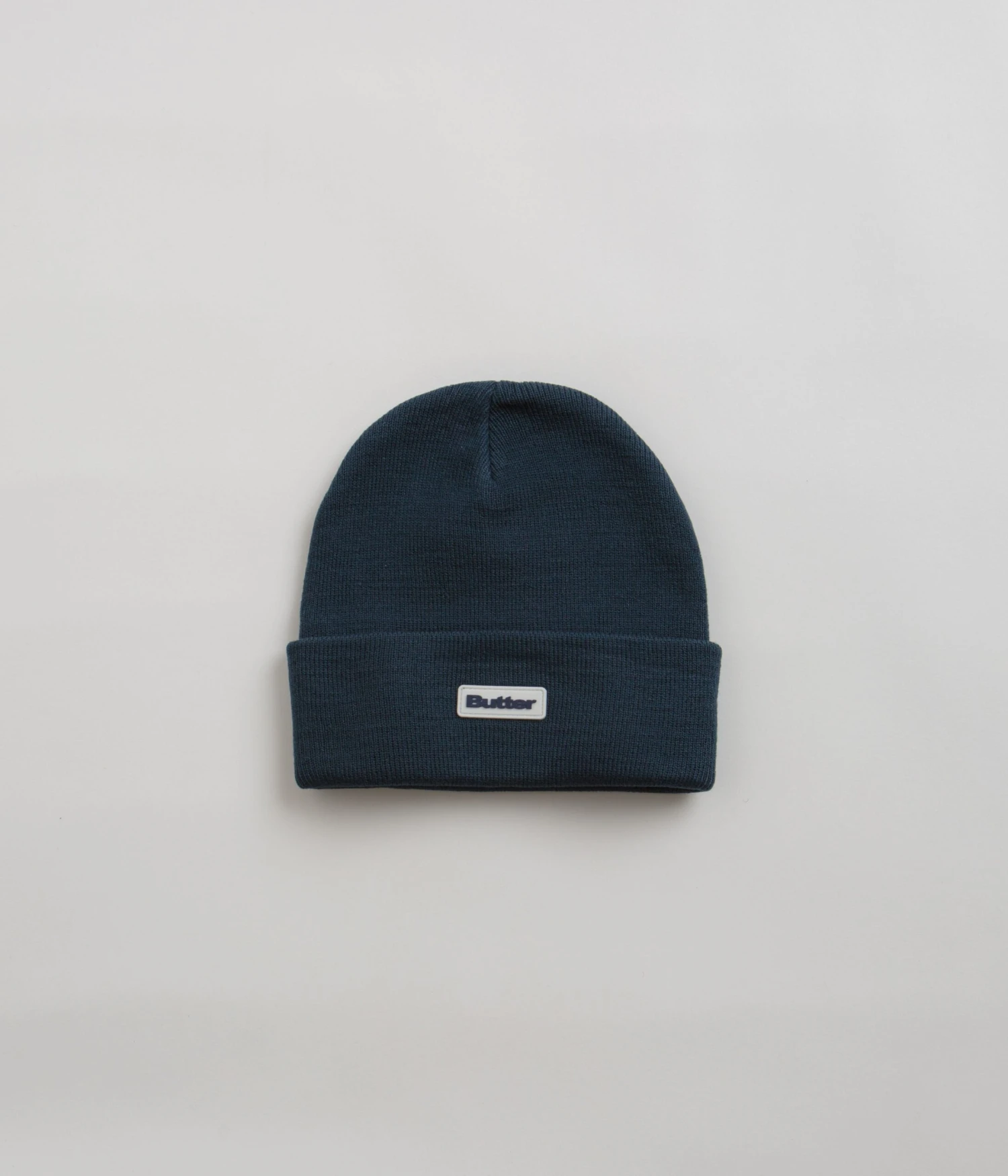 Butter Goods Tall Cuff Beanie in Navy. Made from 100% acrylic, this colour block Butter Goods beanie is designed with a tall cut and a stretchy rib knit face. Finished in a shade of navy with an adjustable fold-over cuff and an embroidered rubber patch logo.