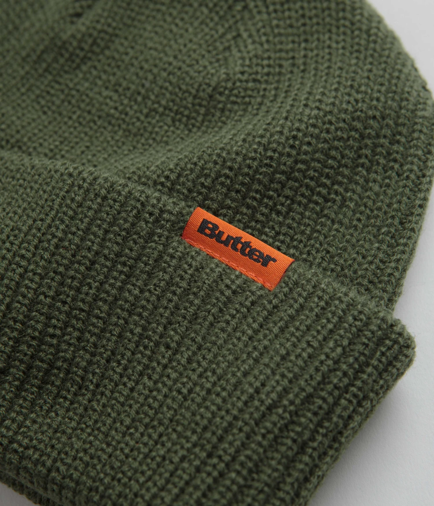 Butter Goods Tall Wharfie Beanie in Army. Single sized and made from 100% acrylic, this colour block Butter Goods beanie is designed with a medium style cut. Featuring a stretchy rib knit face and a fold-over cuff, this green Butter Goods beanie is finished with woven flag label branding.