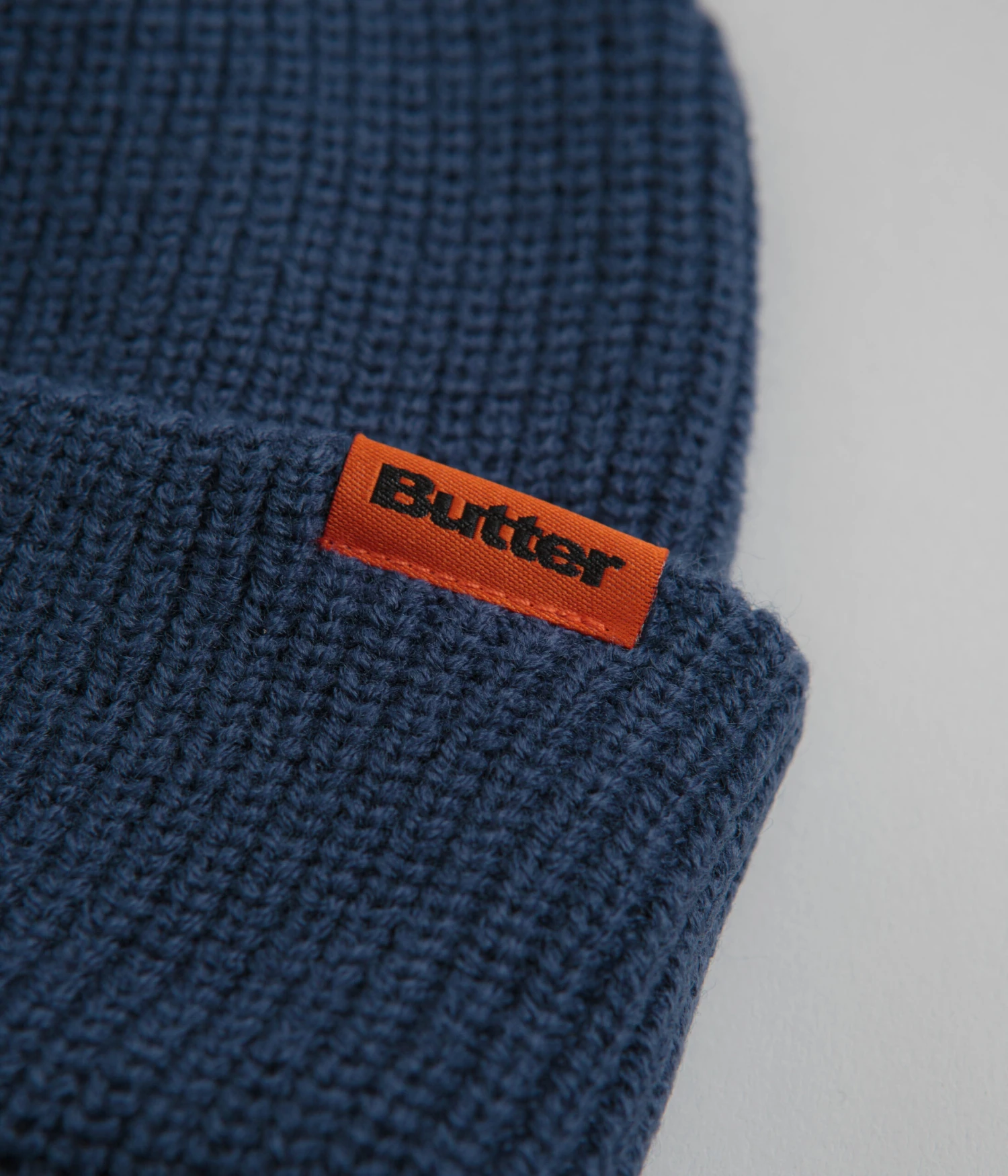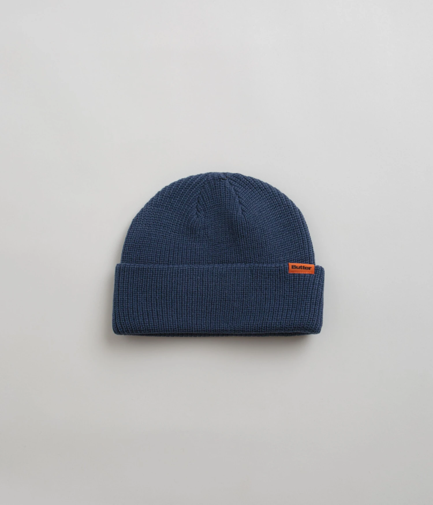 Butter Goods Tall Wharfie Beanie in Navy. Part of the brand’s latest release, this single sized Butter Goods beanie is made from 100% acrylic. Featuring a tall cut, a stretchy rib knit face and with a fold-over cuff, this navy Butter Goods beanie is finished with woven flag label branding.