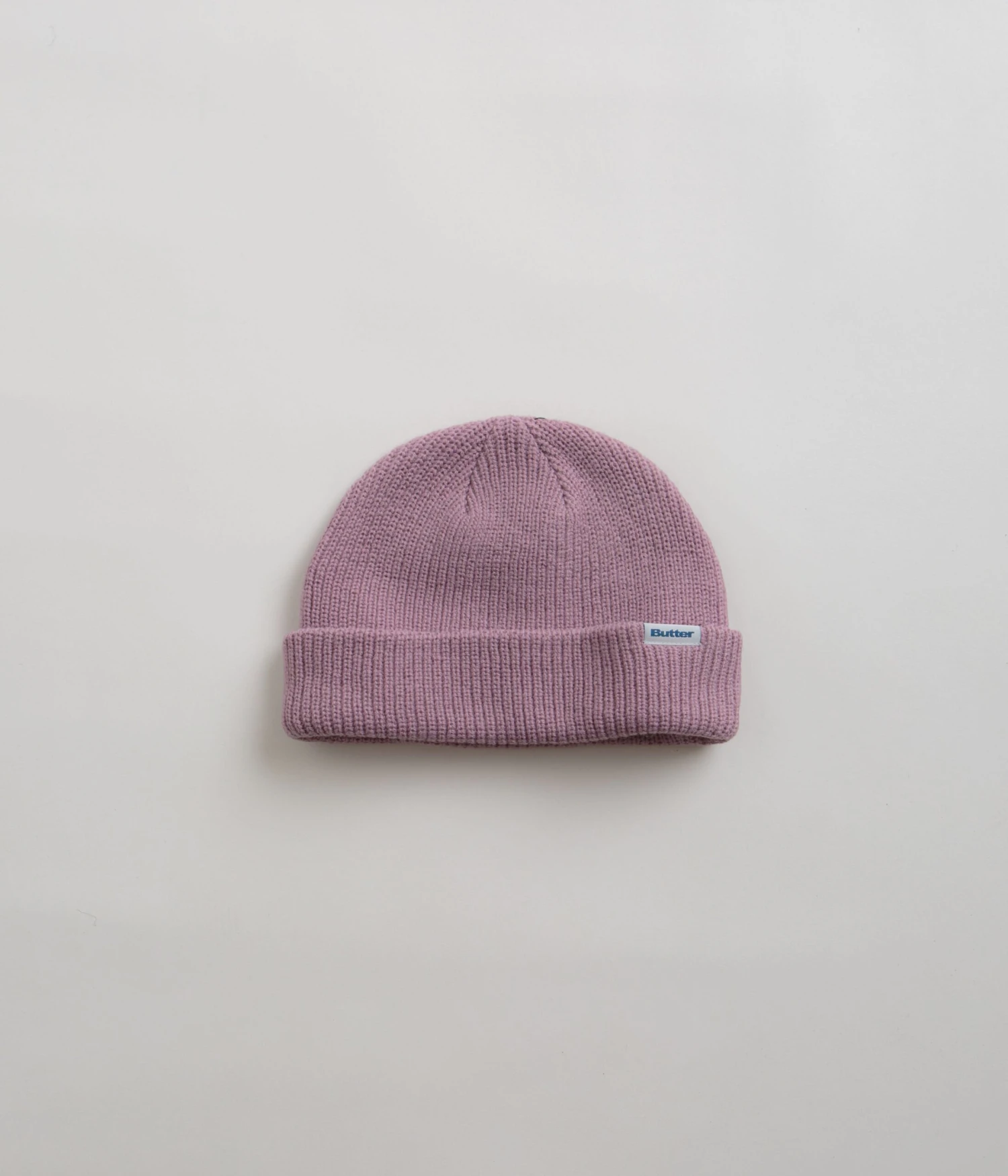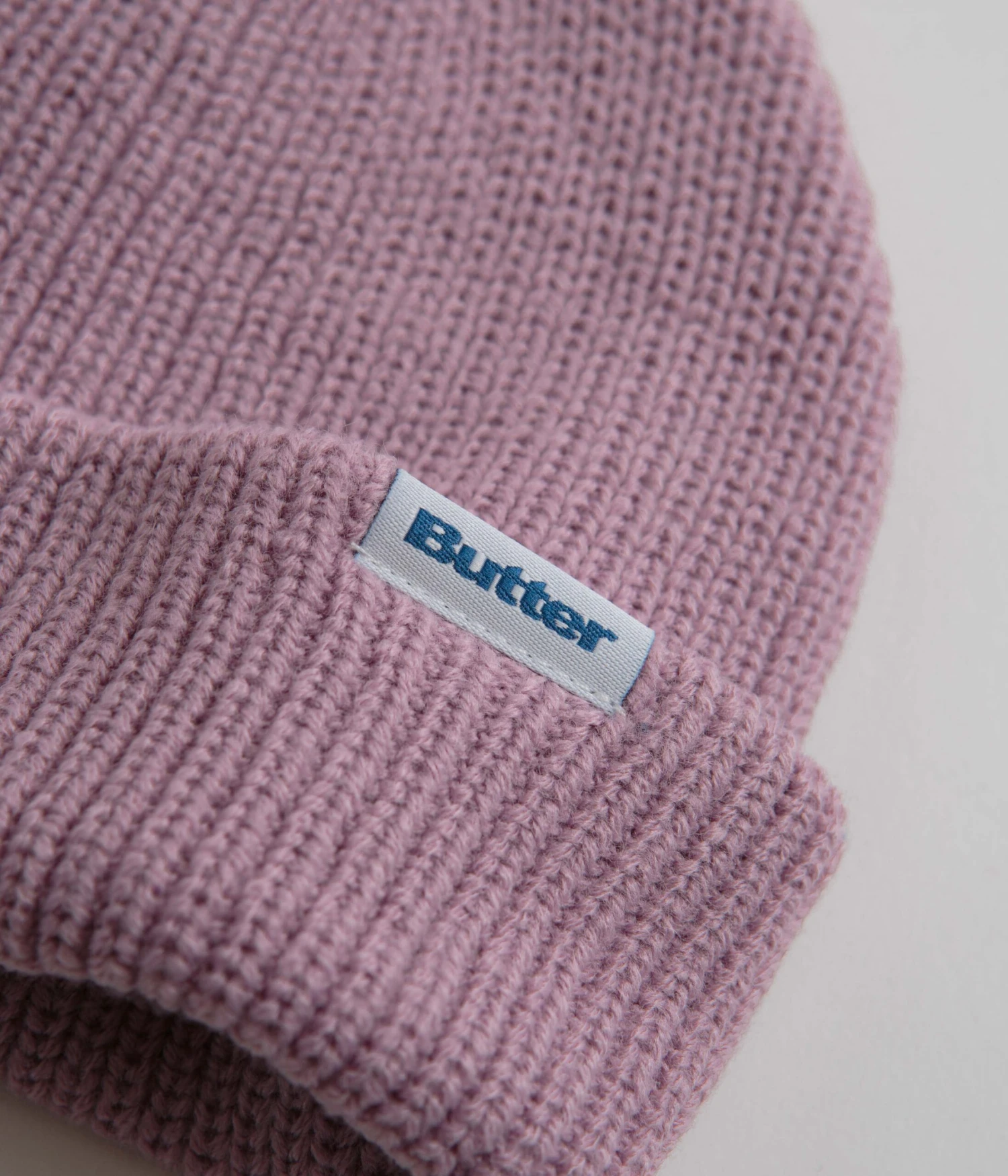 Butter Goods Wharfie Beanie in Mauve and White. Single sized and made from 100% acrylic, this colour block Butter Goods beanie is designed with a loose knit and a short cut. Finished in a shade of purple mauve with an adjustable turn-up cuff and woven flag label branding.