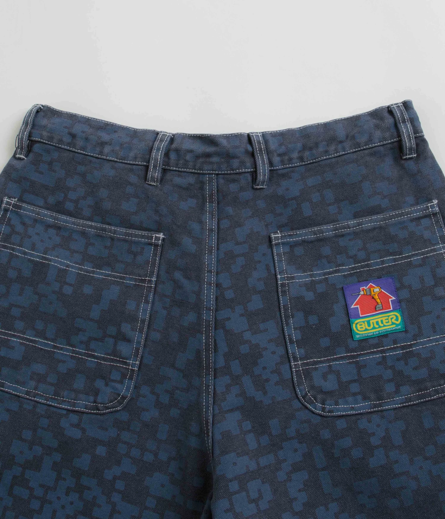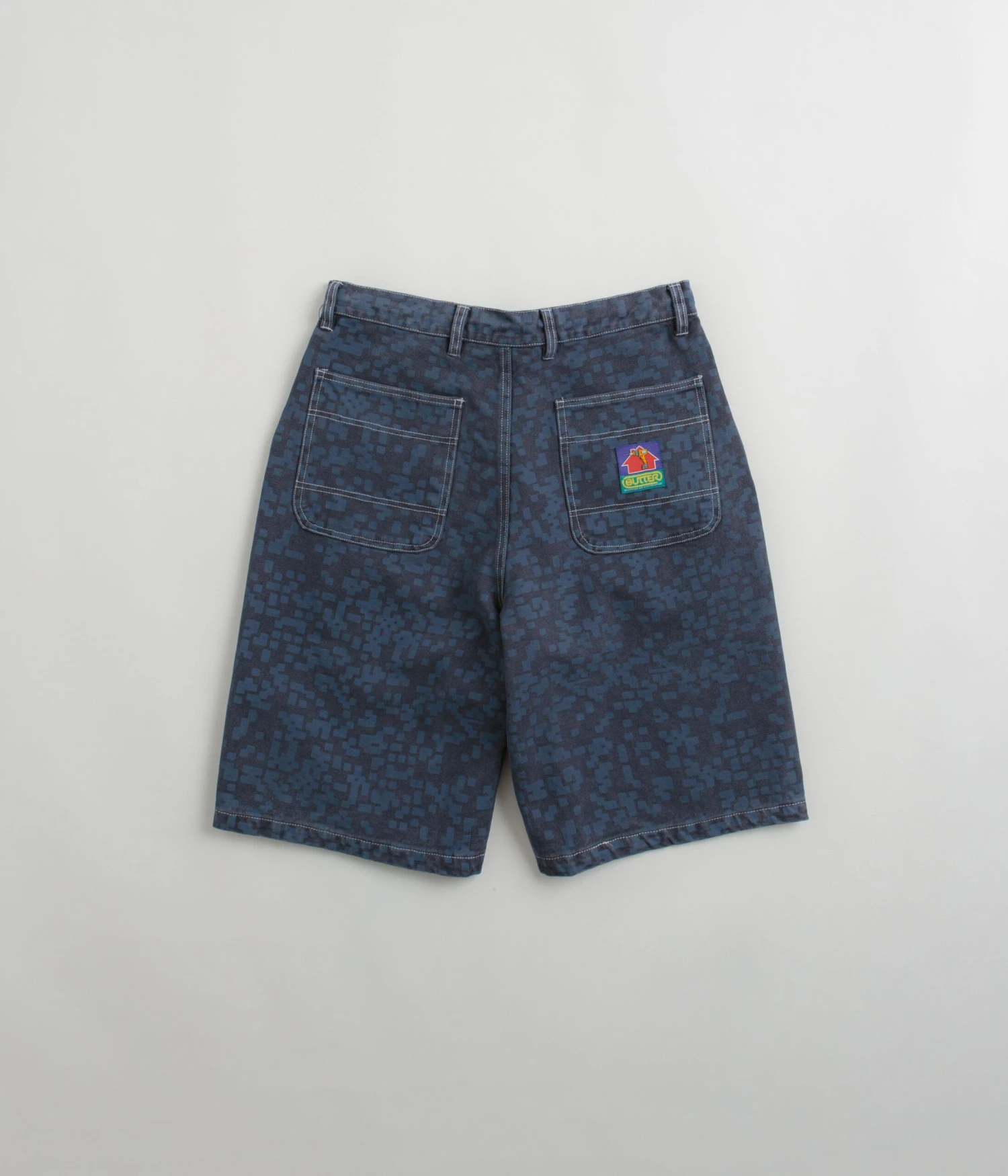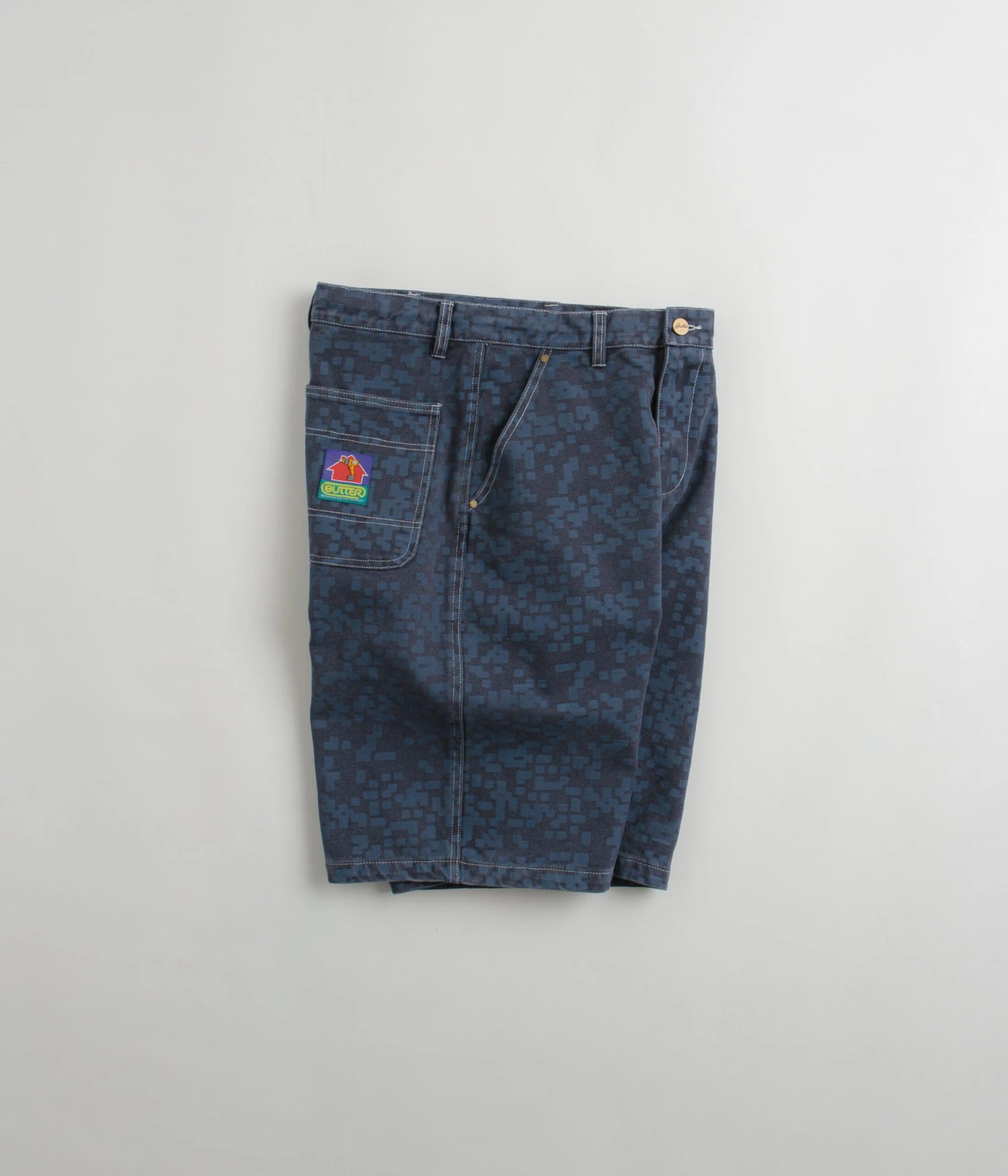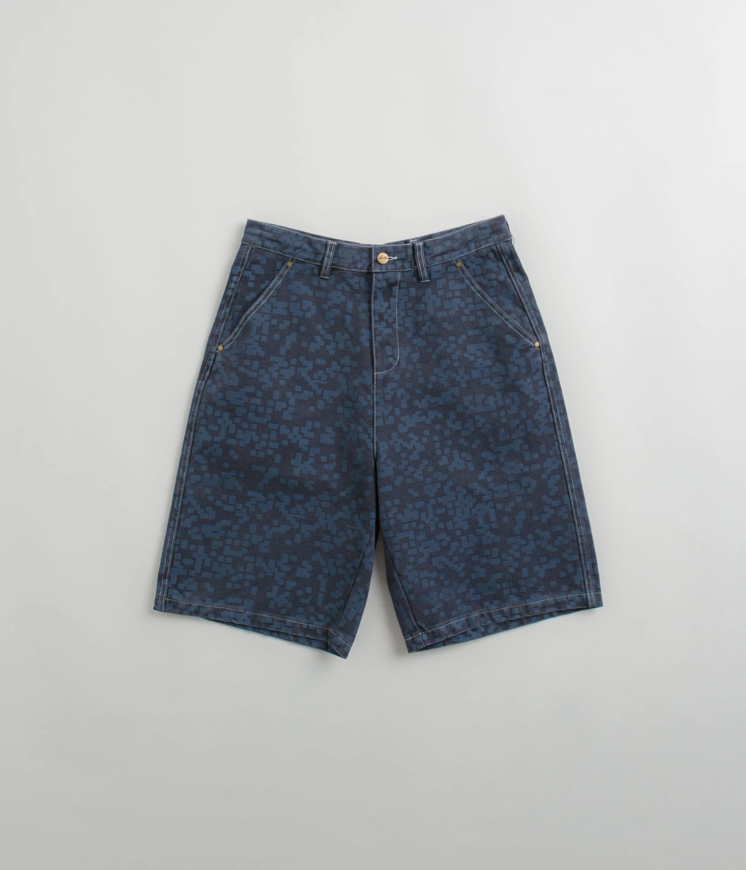 Butter Goods Work Shorts in Slate Blue. Baggy fitting and made from 100% cotton canvas, these below-knee Butter Goods shorts are designed with an all-over water based print. Featuring a belt loop waistband, an inner drawstring adjuster and a single button secured zipper fly, these blue Butter Goods shorts are finished with contrast stitching, two front pockets, two rear pockets and with woven flag label branding.
