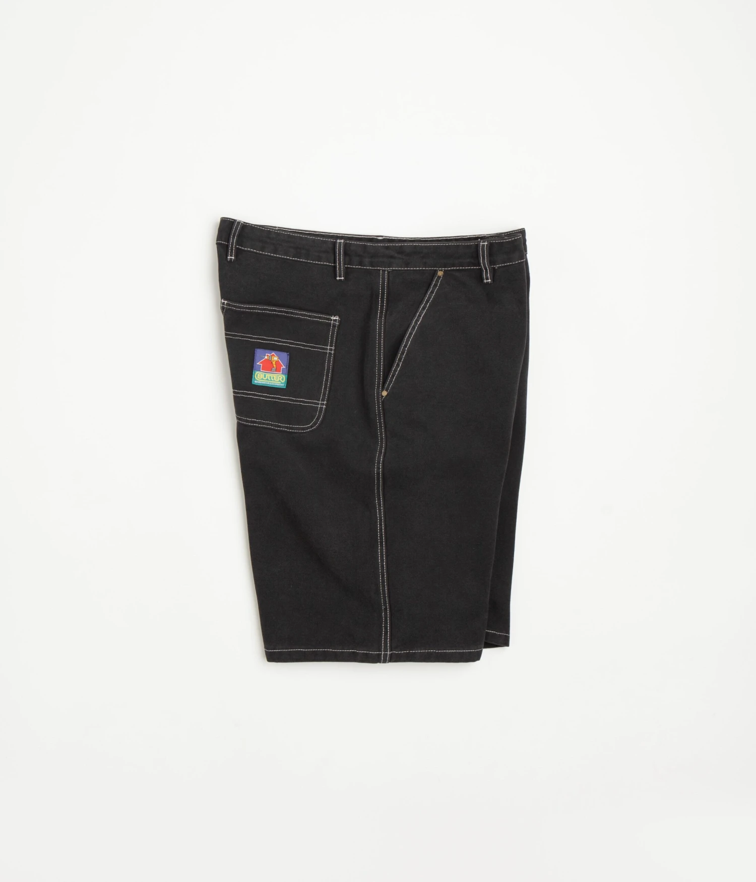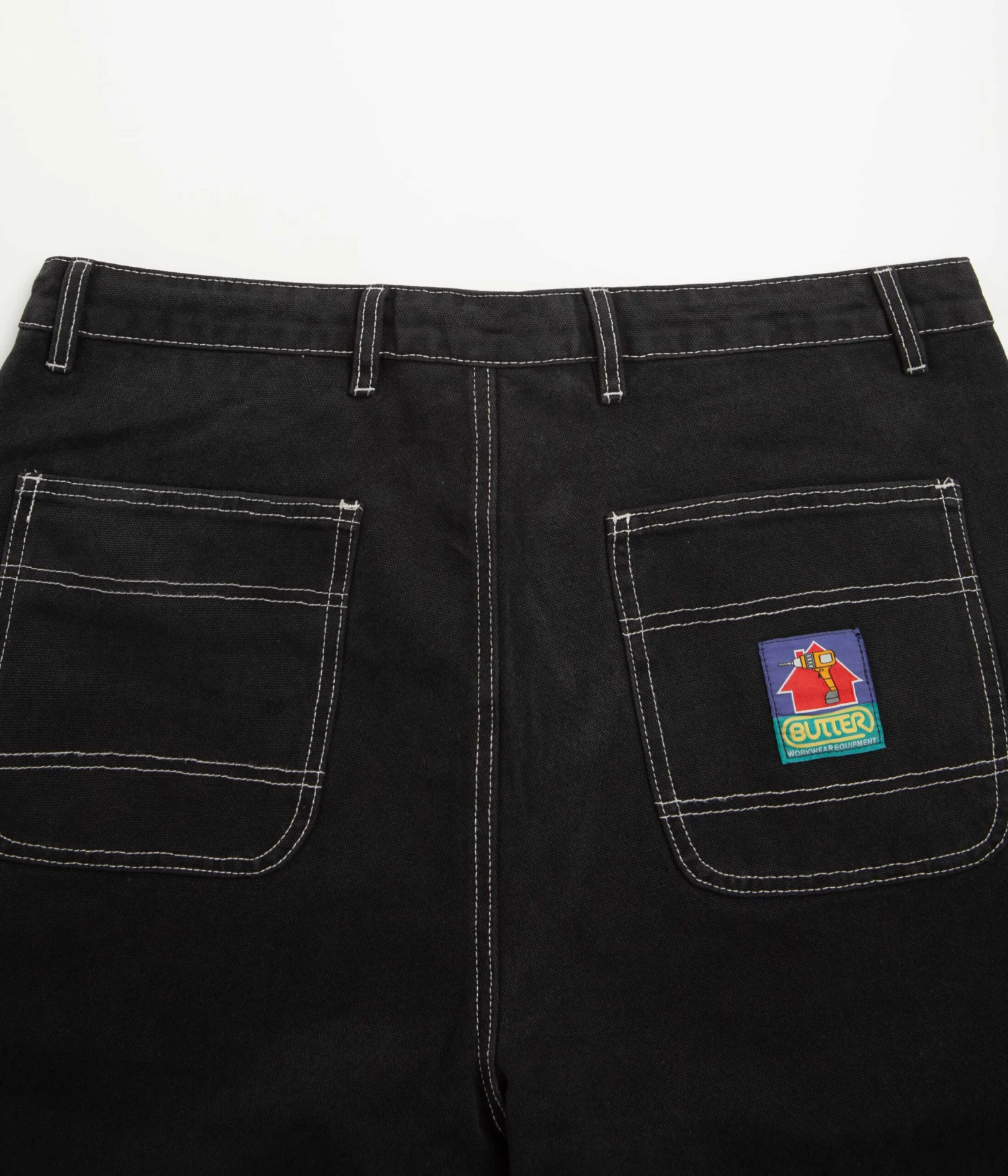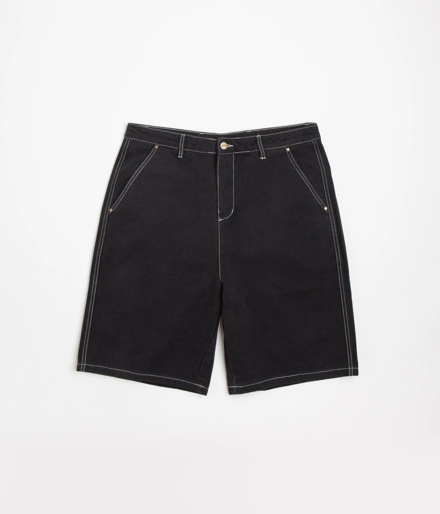 Butter Goods Work Shorts in Washed Black. Cut to a below-knee length and baggy fitting, these Butter Goods shorts are made from 100% heavyweight cotton canvas. Styled with contrast stitch detailing and a custom dye, these washed black Butter Goods shorts also feature a drawstring waistband, two front pockets and two rear pockets. Finished with a custom top button zipper fly with a woven Butter flag label sewn across the rear.Â