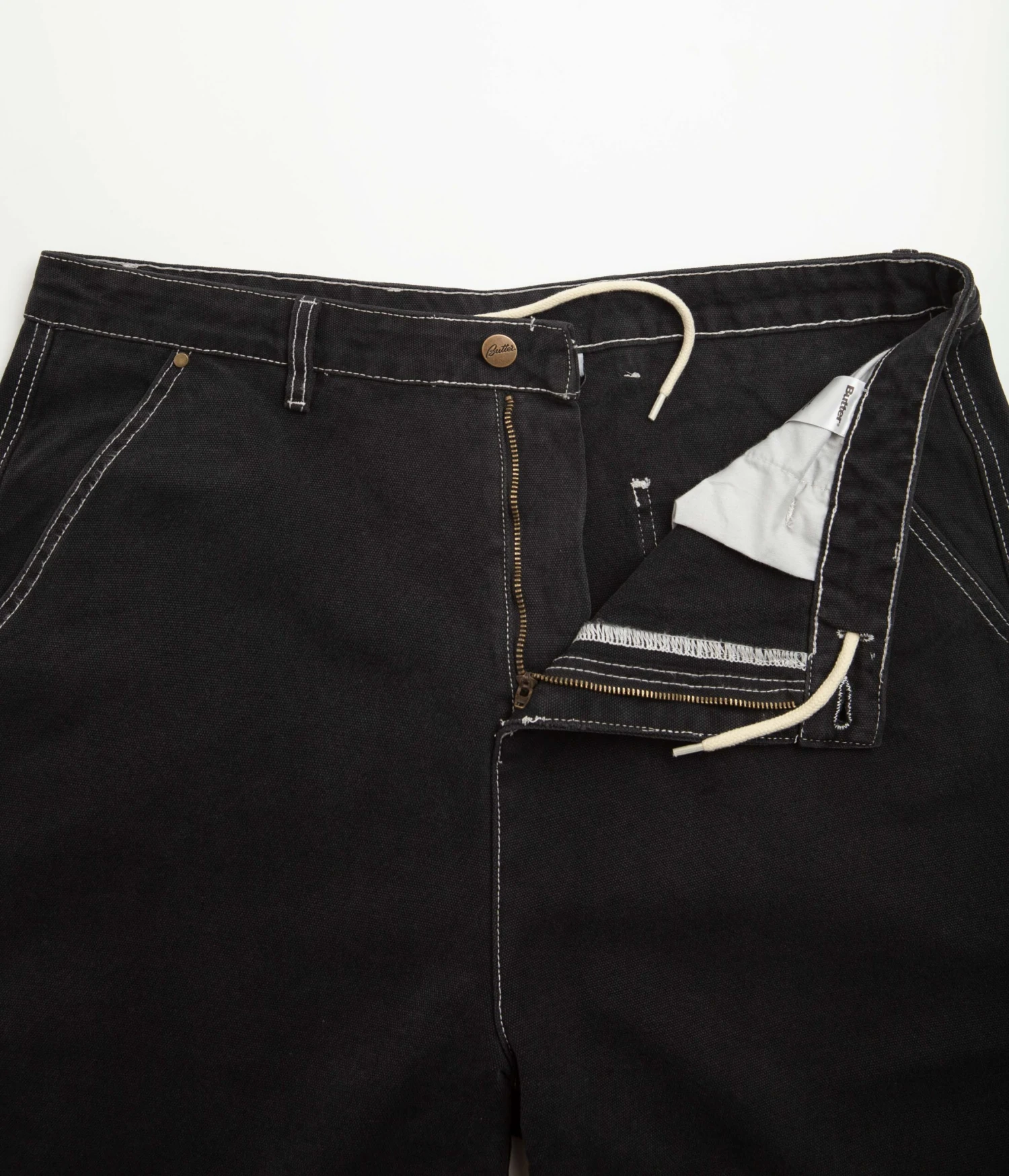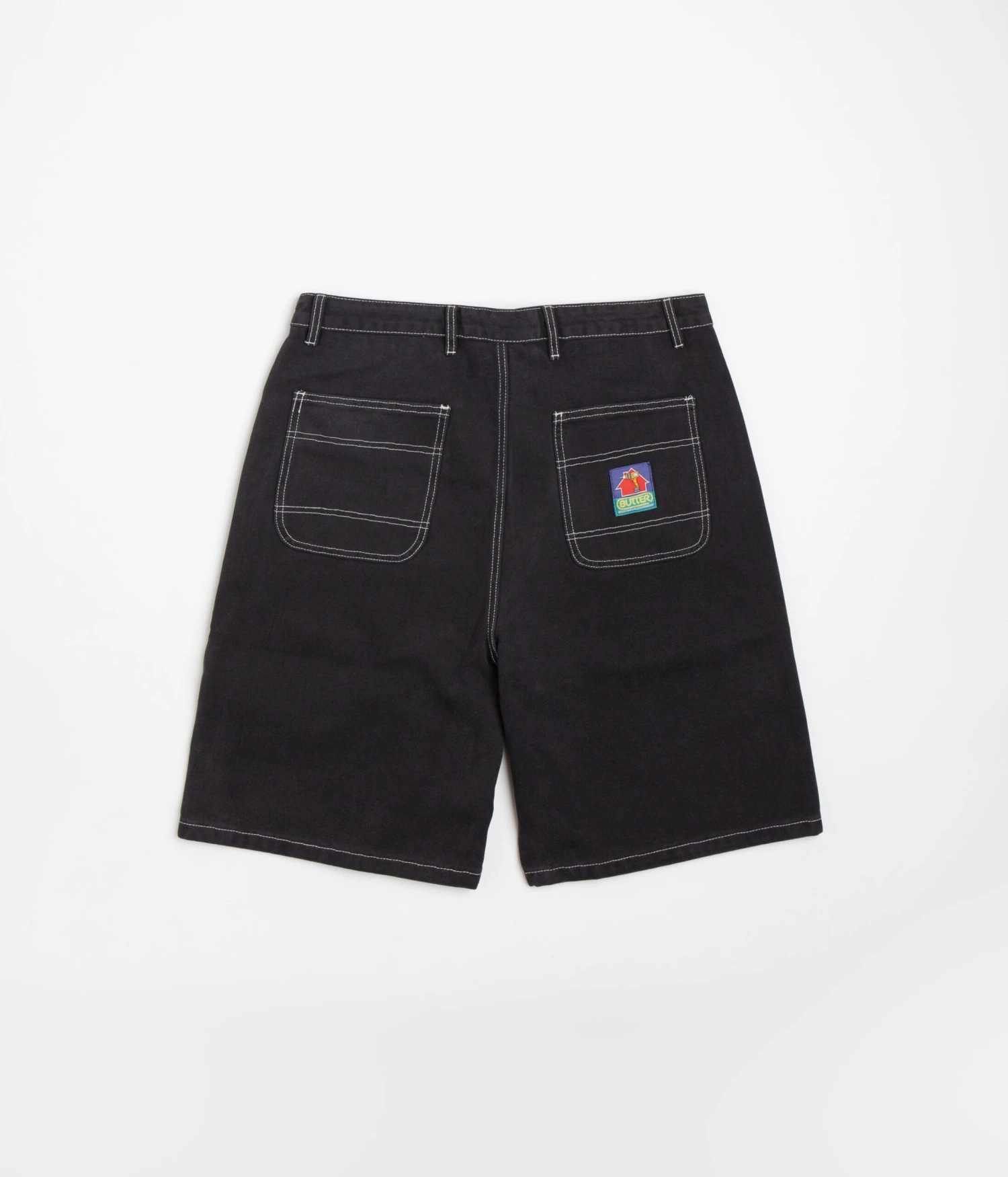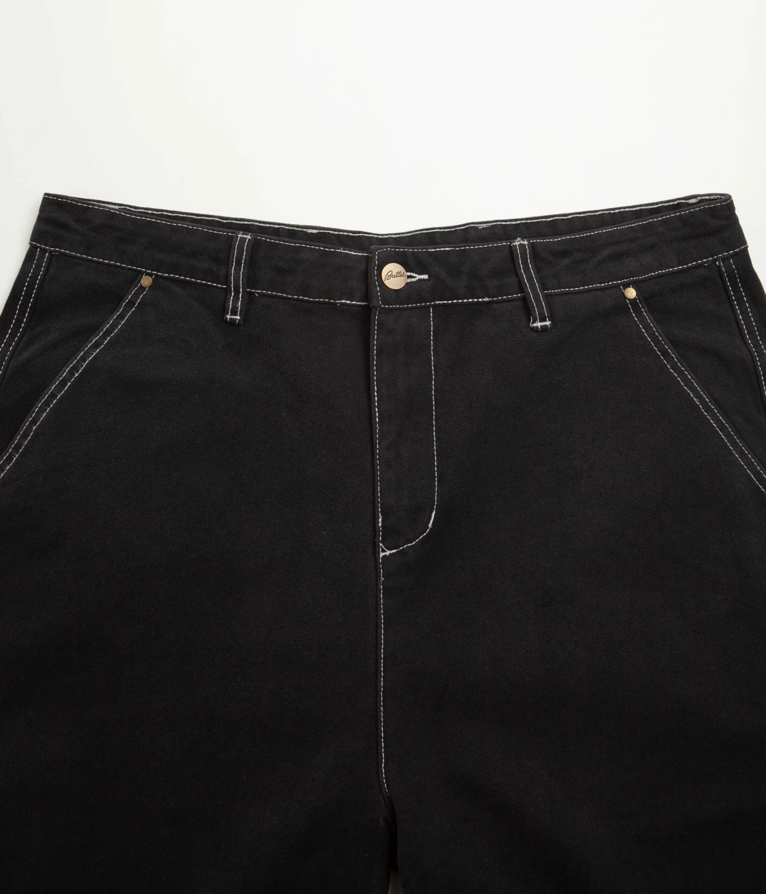 Butter Goods Work Shorts in Washed Black. Cut to a below-knee length and baggy fitting, these Butter Goods shorts are made from 100% heavyweight cotton canvas. Styled with contrast stitch detailing and a custom dye, these washed black Butter Goods shorts also feature a drawstring waistband, two front pockets and two rear pockets. Finished with a custom top button zipper fly with a woven Butter flag label sewn across the rear.Â