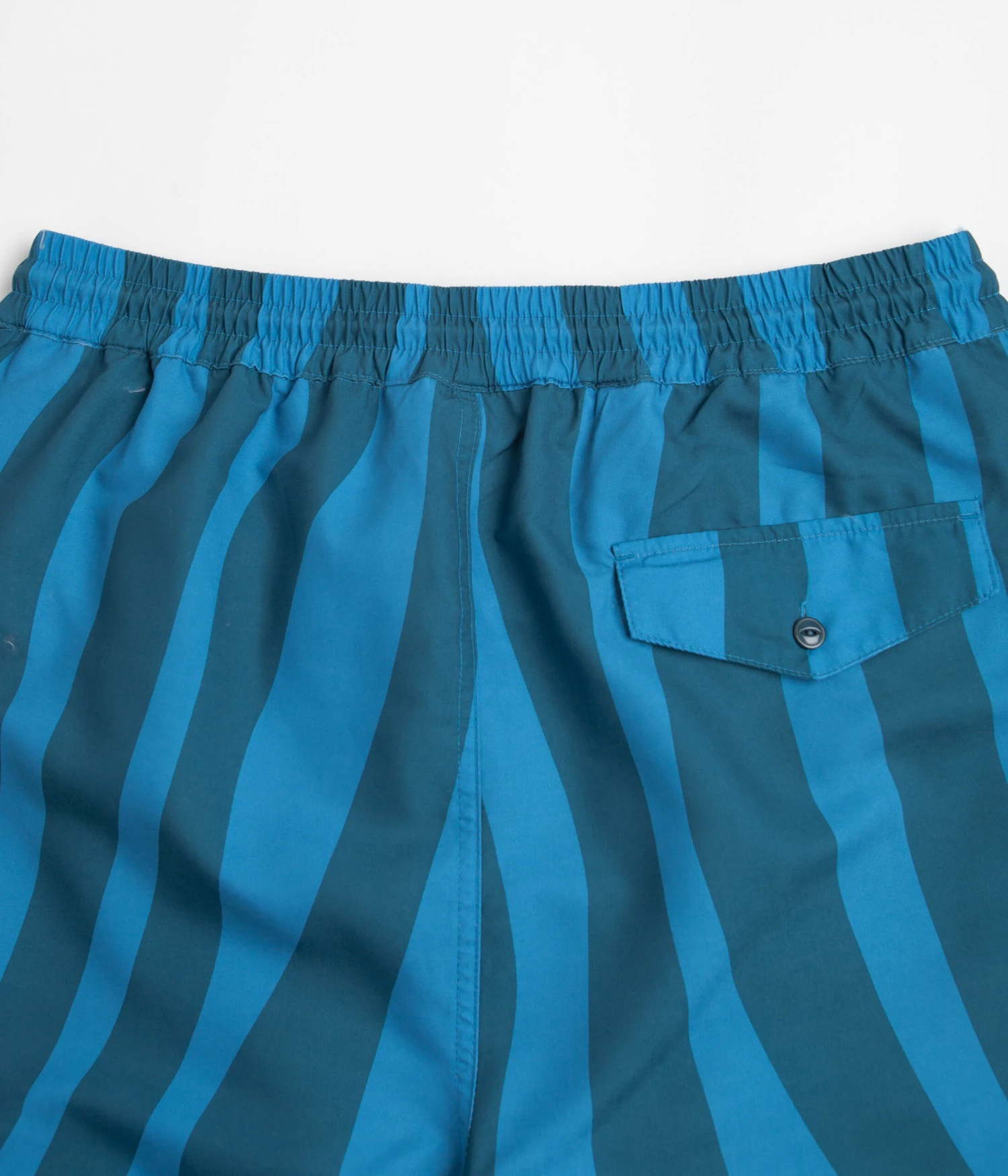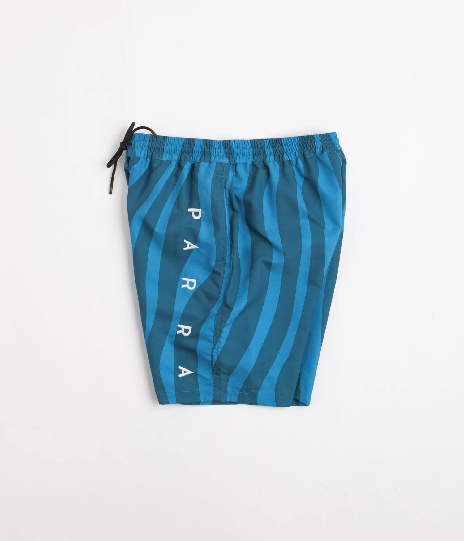 by Parra Aqua Weed Waves Swim Shorts in Greek Blue. Made from 100% cotton with a breathable mesh liner, these by Parra swim shorts are tailored to a regular fitting with a woven elastic waistband. Featuring external drawstring ties and two side pockets, these weed wave green blue by Parra shorts are finished with a single rear pocket and with embroidered ‘Parra’ branding.Â