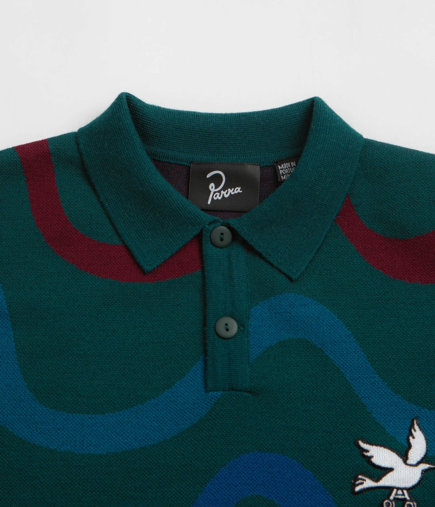 by Parra Colored Soundwave Knitted Polo Sweatshirt in Green. Tailored to a regular fitting from an acrylic-merino wool blend, this by Parra sweatshirt is designed with an all-over jacquard knit pattern. Featuring a double button placket, a classic stand collar, ribbed cuffs and a rib knit hem, this green by Parra sweatshirt is finished with an embroidered left chest graphic.