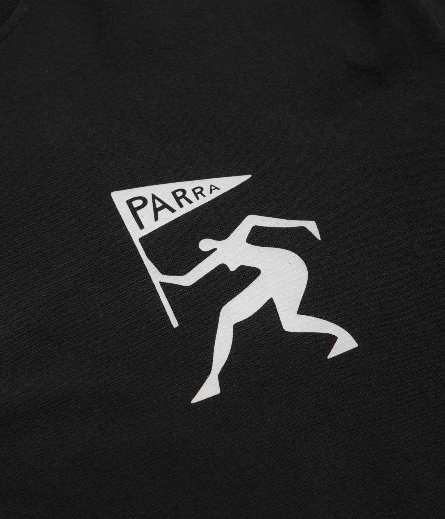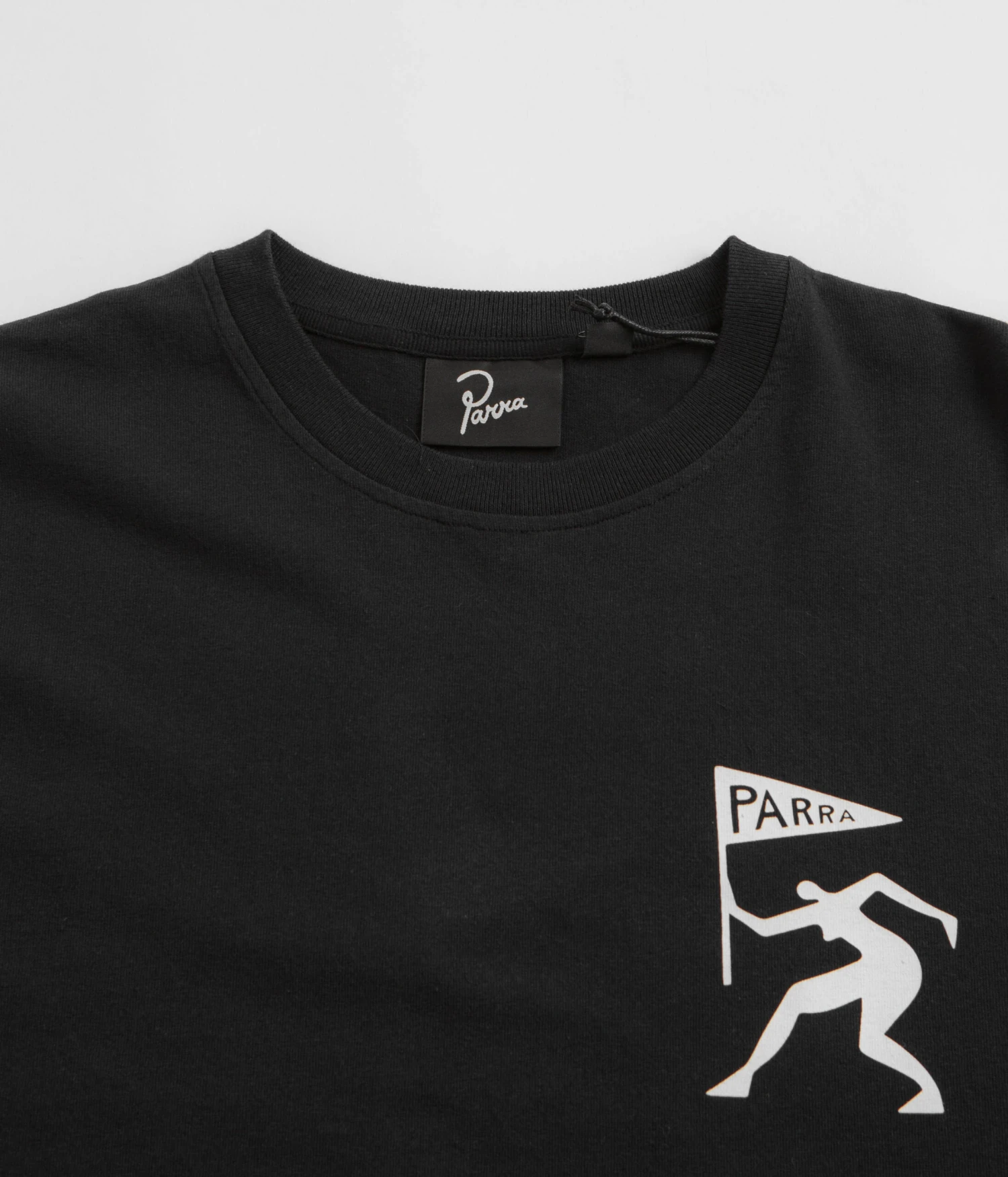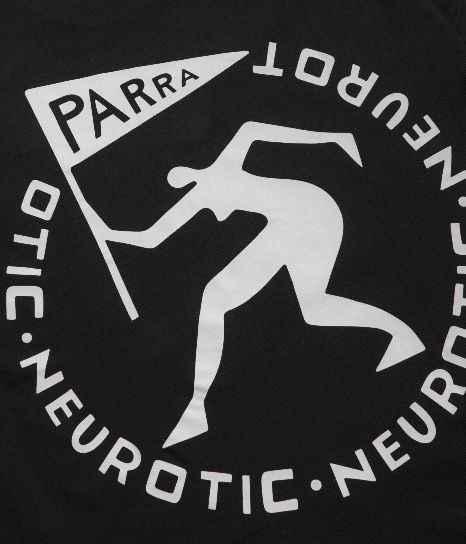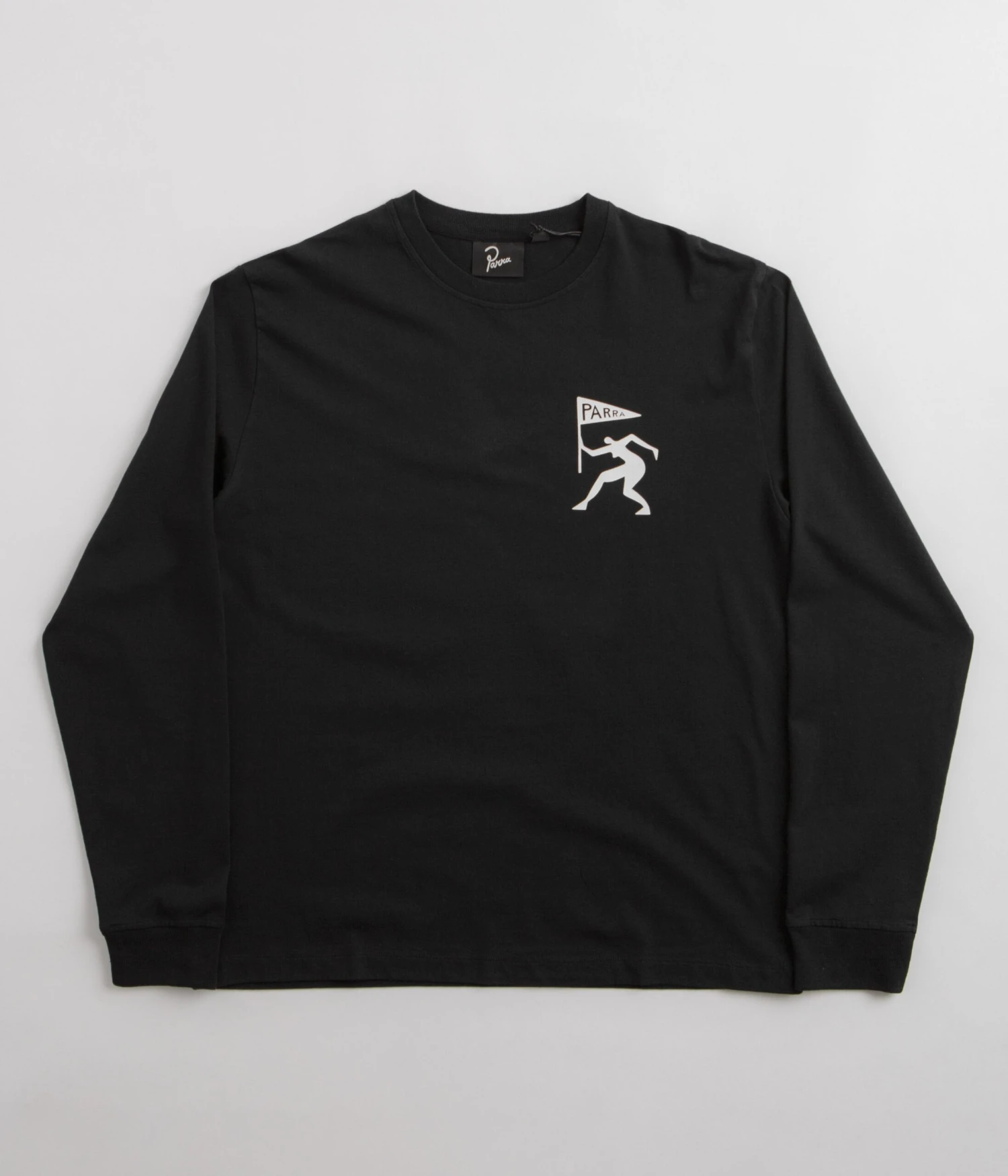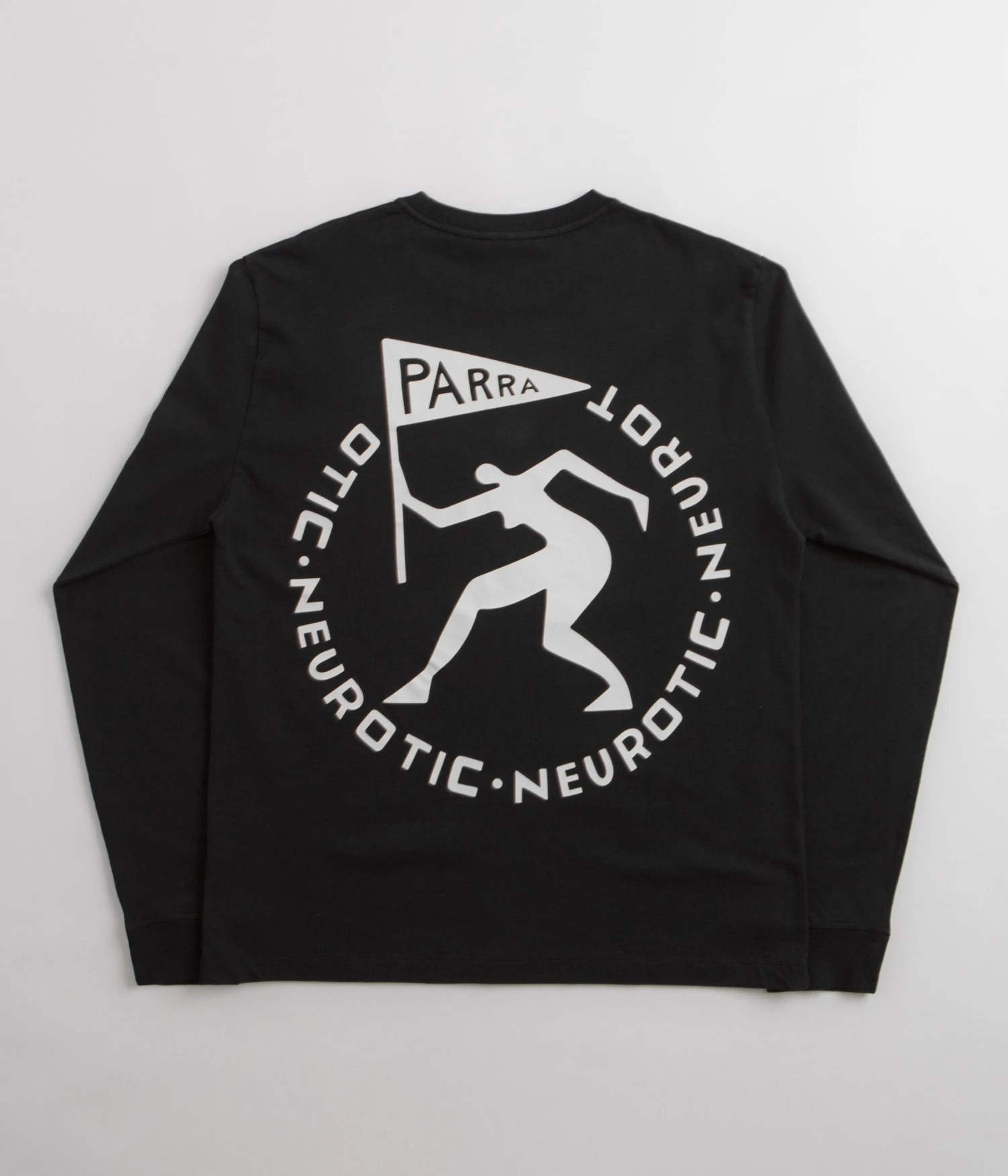 by Parra Neurotic Flag Long Sleeve T-Shirt in Black. Made from 100% cotton with ribbed cuffs, this by Parra t-shirt is designed with a classic crew collar and tonal stitched seams. Finished in a shade of black with printed front and rear graphics.