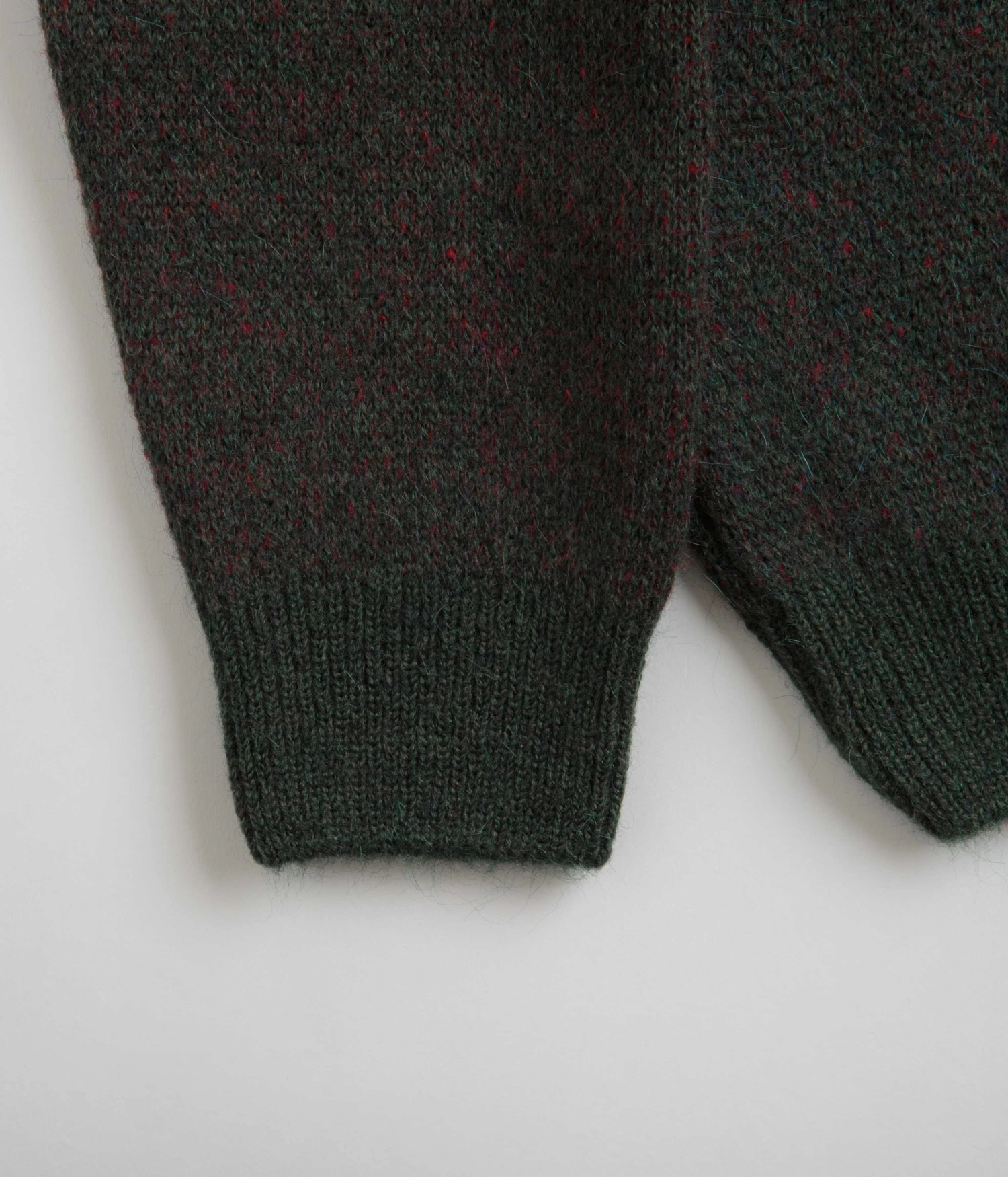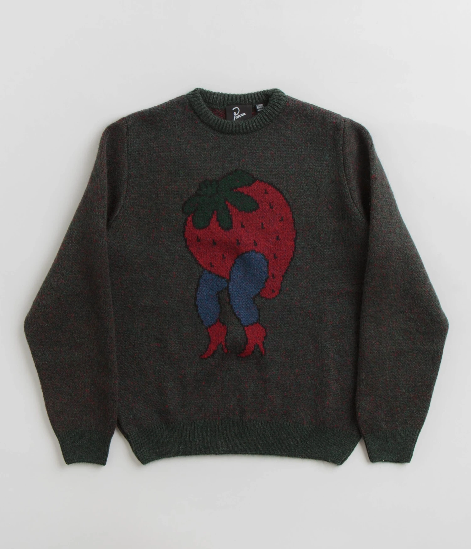 by Parra Stupid Strawberry Knitted Sweatshirt in Hunter Green. Made from a marled acrylic-mohair blend, this regular fitting by Parra sweatshirt is designed with a rib knit collar and ribbed cuffs. Finished in a shade of dark green with a jacquard knit centre chest graphic.