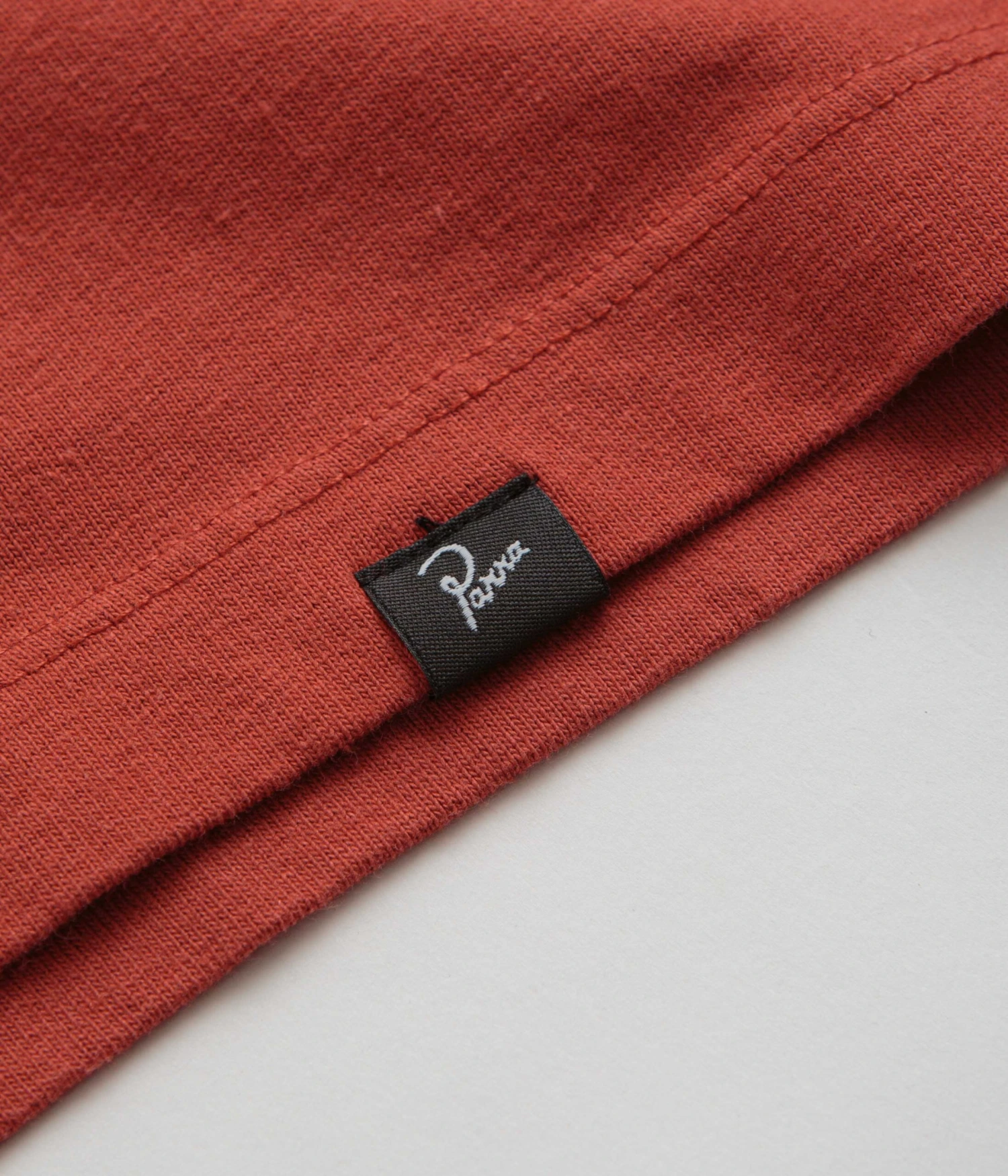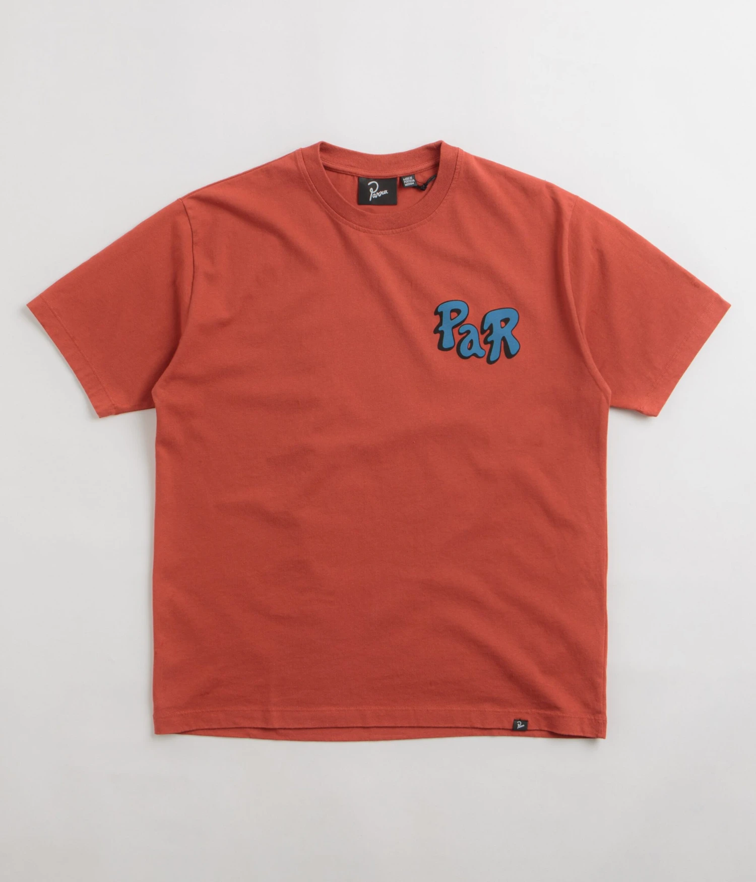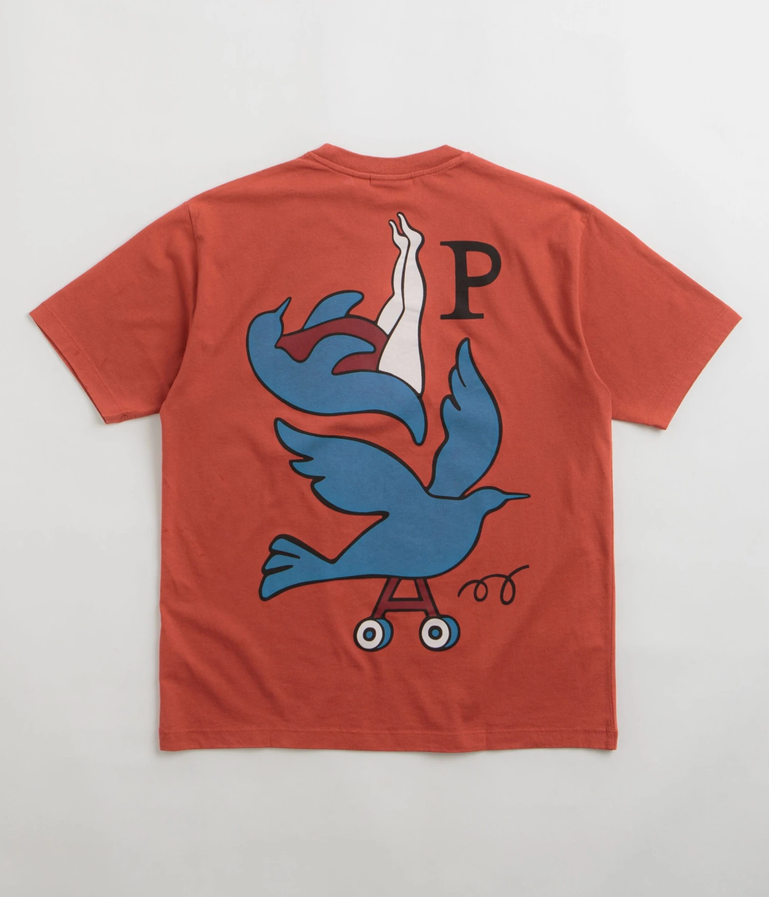 by Parra Wheeled Bird T-Shirt in Rust. Part of the brand’s latest collection, this regular fitting by Parra t-shirt is designed with a rib knit collar and a flag labelled hem. Made from 100% cotton and finished in a shade of brown with printed front and rear graphics.