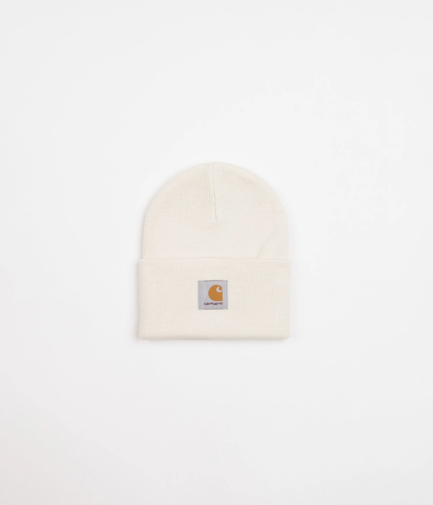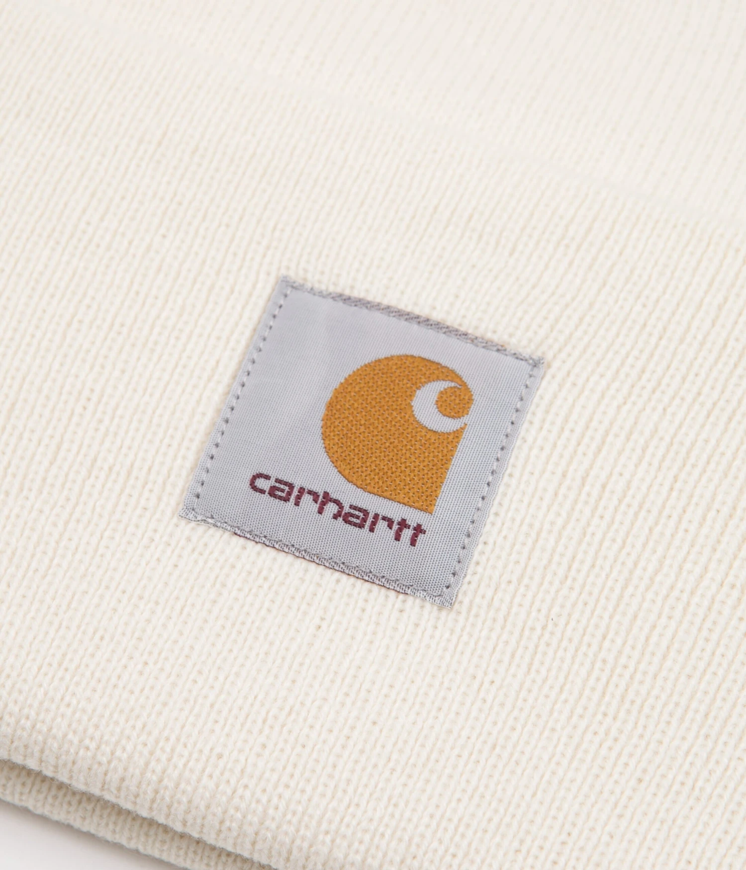 Carhartt Acrylic Watch Hat Beanie in Natural. Made from 100% acrylic and single sized, this 9-gauge Carhartt beanie is styled with a stretchy fabric face and a rib knit construction. Featuring a soft handfeel, this natural Carhartt beanie is finished with an adjustable turn-up cuff and an embroidered flag label across the crown.
