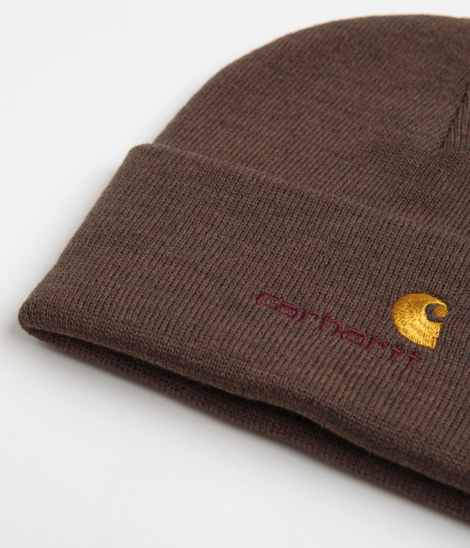 Carhartt American Script Beanie in Buckeye. Single sized and made from a blend of recycled polyester and acrylic, this rib knit Carhartt beanie is styled with a stretchy 9-gauge construction. Finished with an adjustable turn-up cuff, tonal stitching and with an embroidered American Script logo sewn across the front.