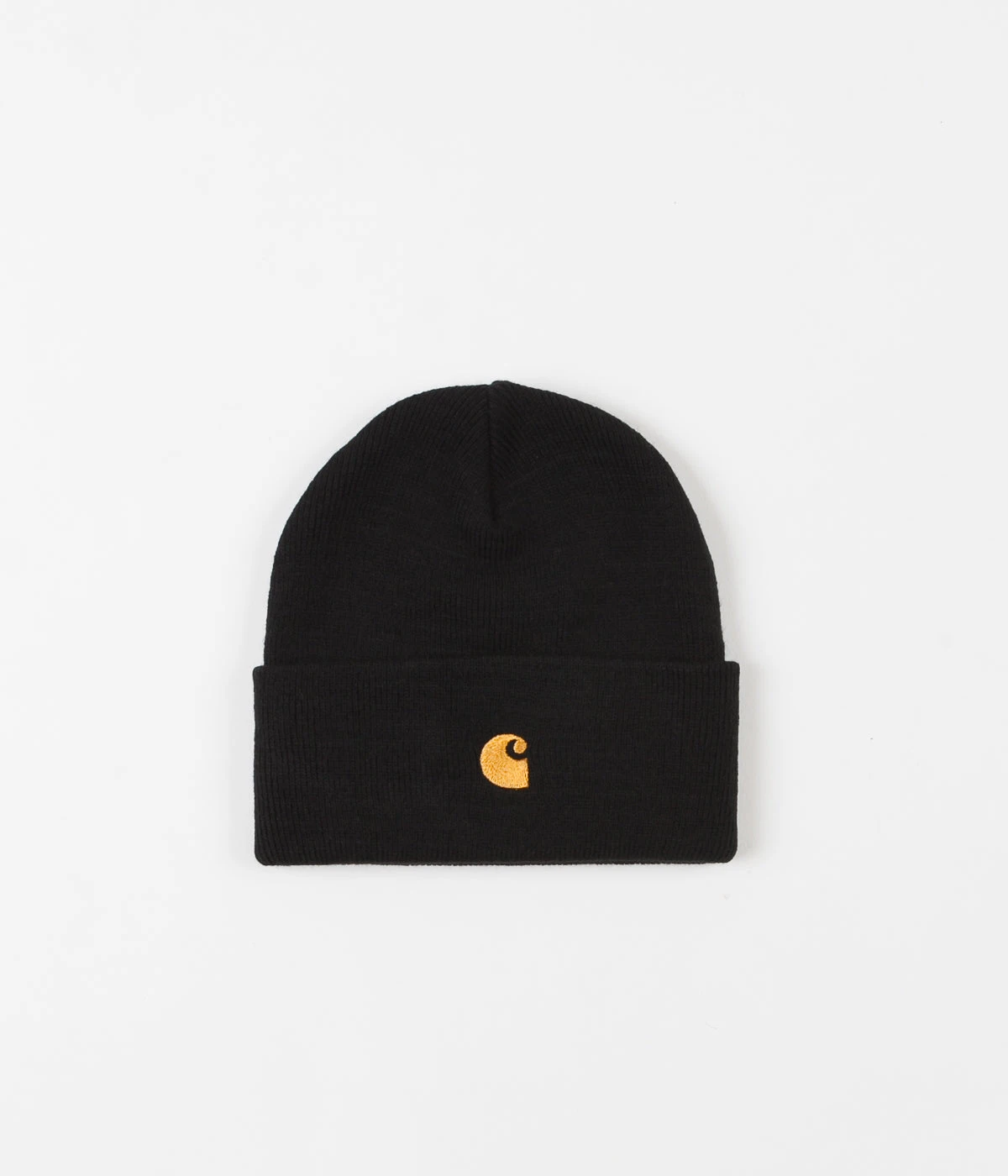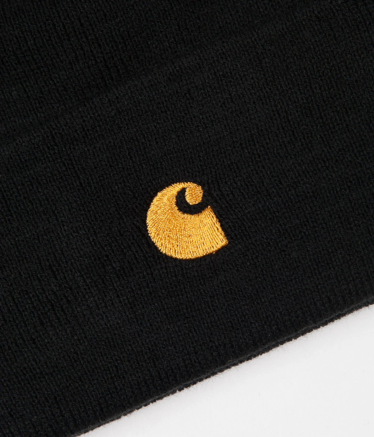 Carhartt Chase Beanie in Black and Gold. Crafted from 100% acrylic and single sized, this black Carhartt beanie is styled with a fine rib knit 9-gauge construction. Featuring an adjustable cuff, tonal stitched seams and a stretchable fabric face, this Chase beanie is finished with a gold stitch āCā logo woven across the front.