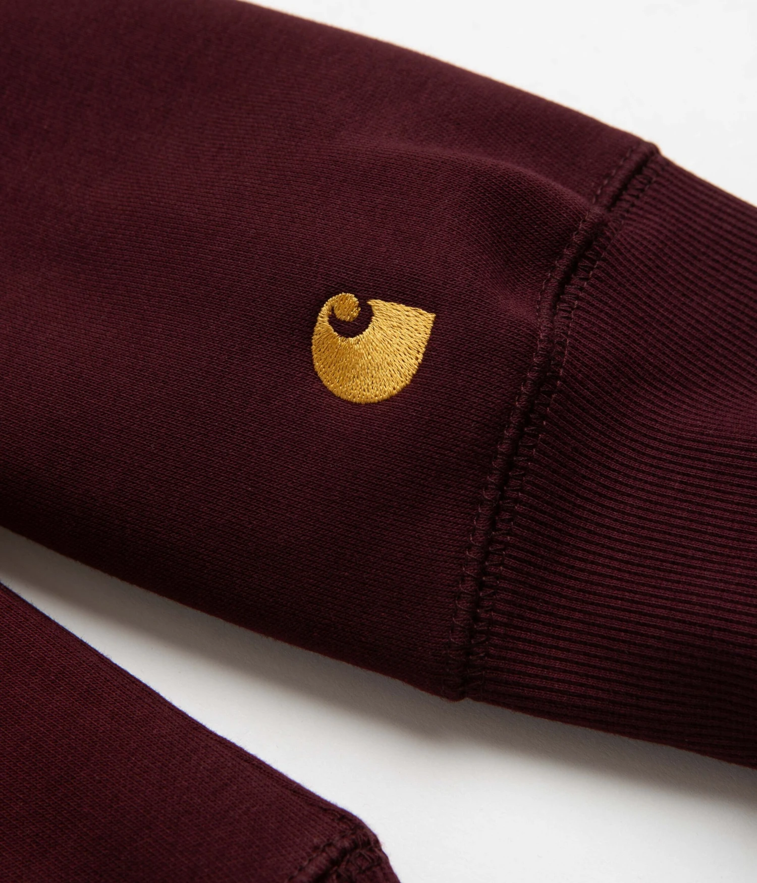 Carhartt Chase Hoodie in Amarone and Gold. Brush lined and tailored to a regular fitting, this Carhartt hoodie is made from a cotton-polyester blend with raglan sleeves and a drawstring hood. Featuring rib knit cuffs and a woven elastic hem, this colour block burgundy Carhartt hoodie is finished with a classic kangaroo pocket with embroidered C branding sewn above the left cuff.