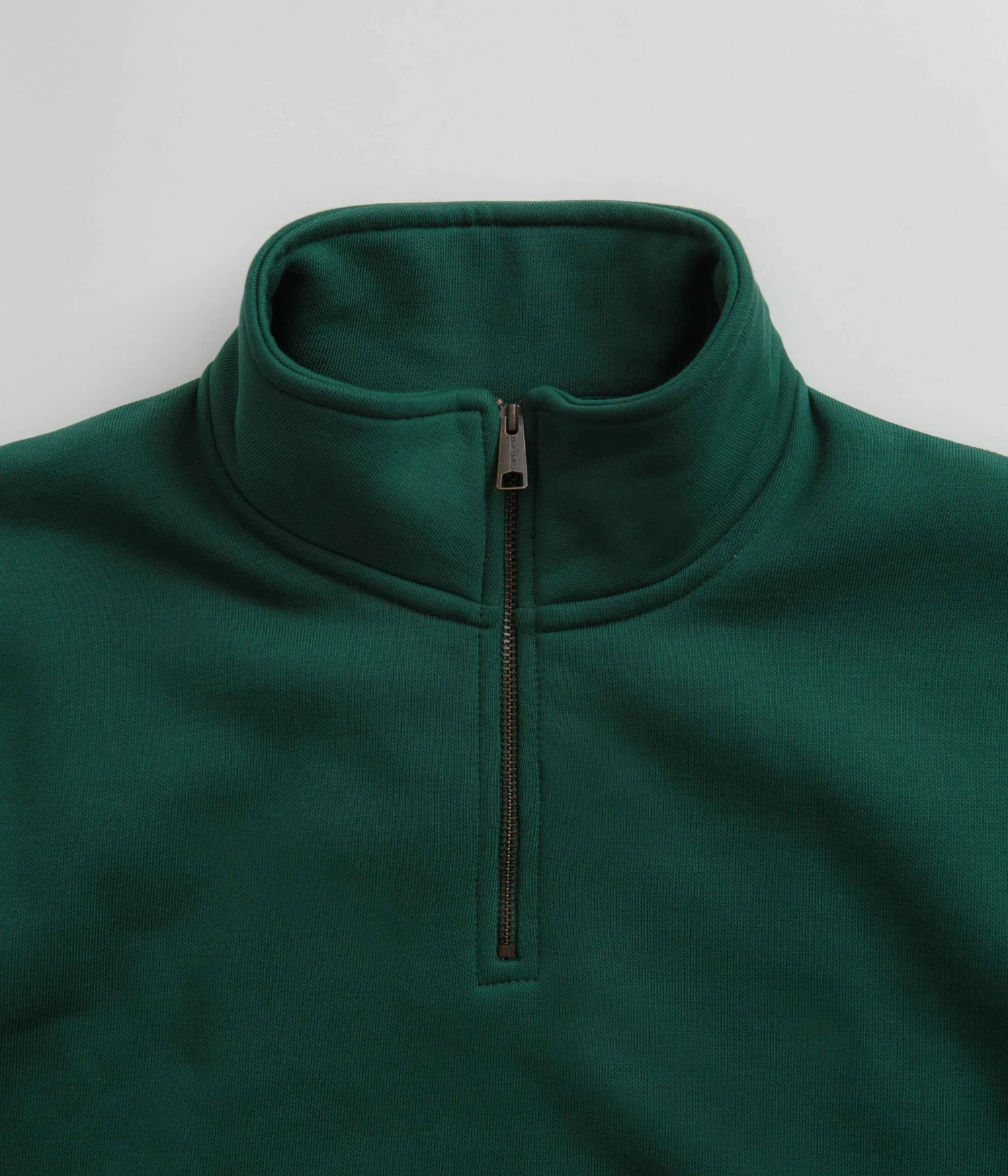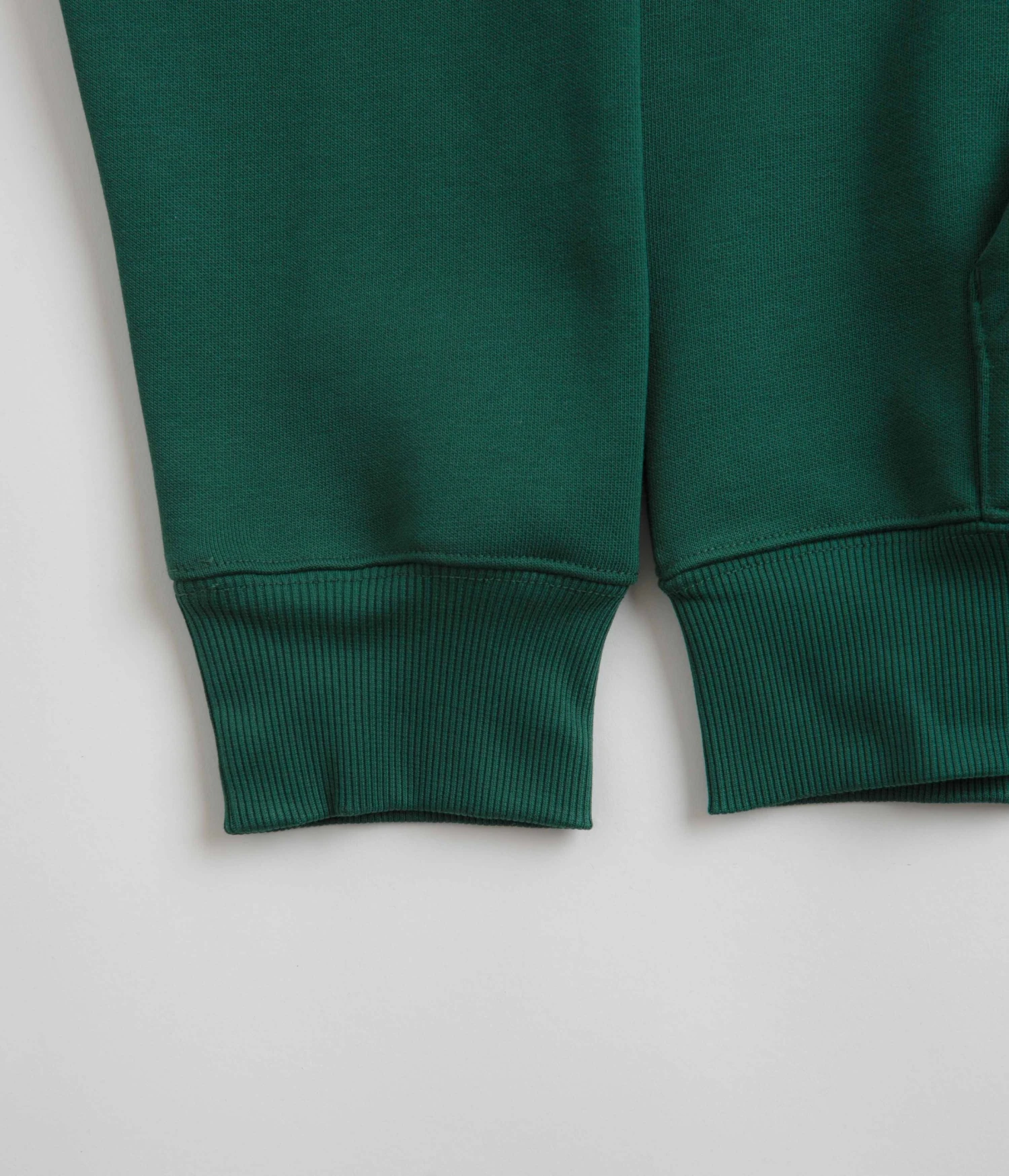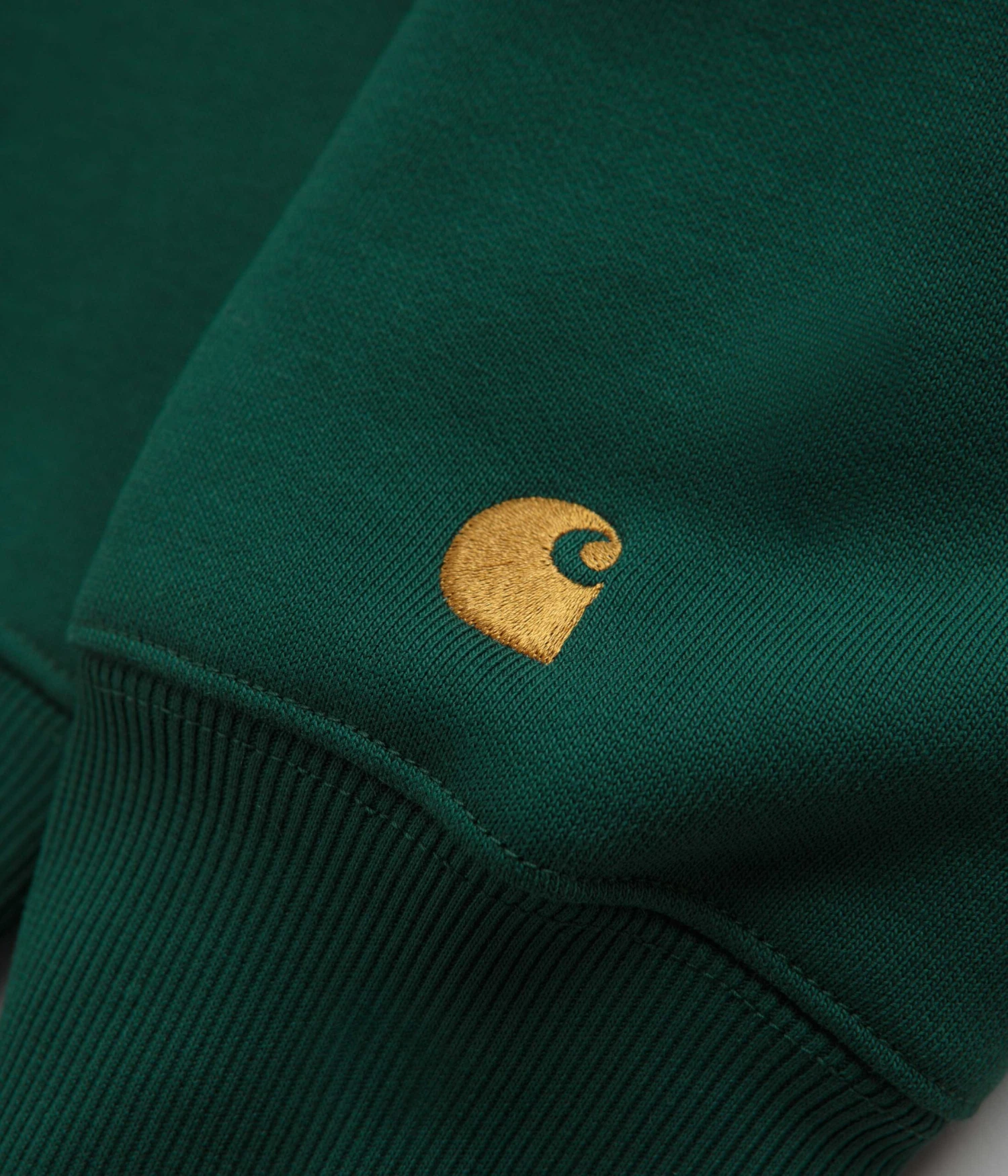 Carhartt Chase Zip Neck Sweatshirt in Chervil and Gold. Loose fitting from a cotton-polyester blend, this colour block Carhartt sweater is designed with a ¼ length zipper fastening, dropped shoulders and rib knit cuffs. Finished in a shade of green with a woven elastic hem, a kangaroo front pocket and with an embroidered sleeve logo.