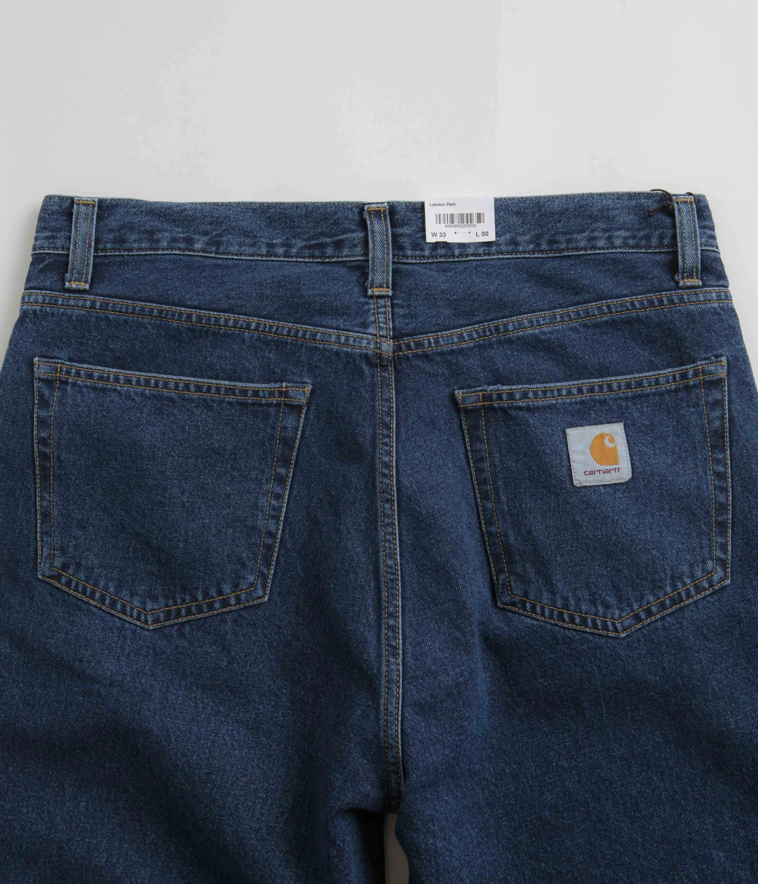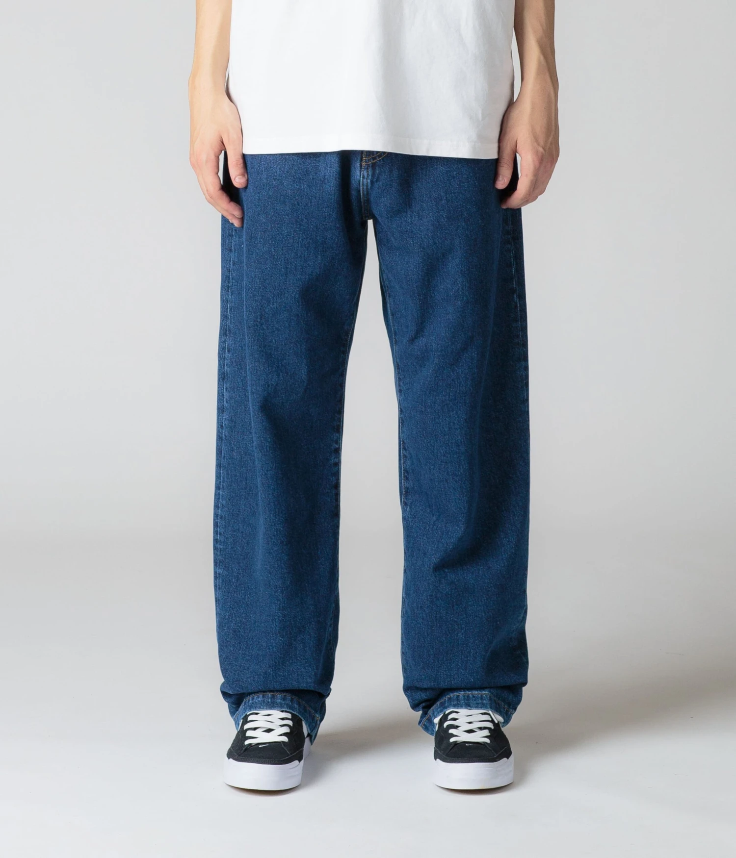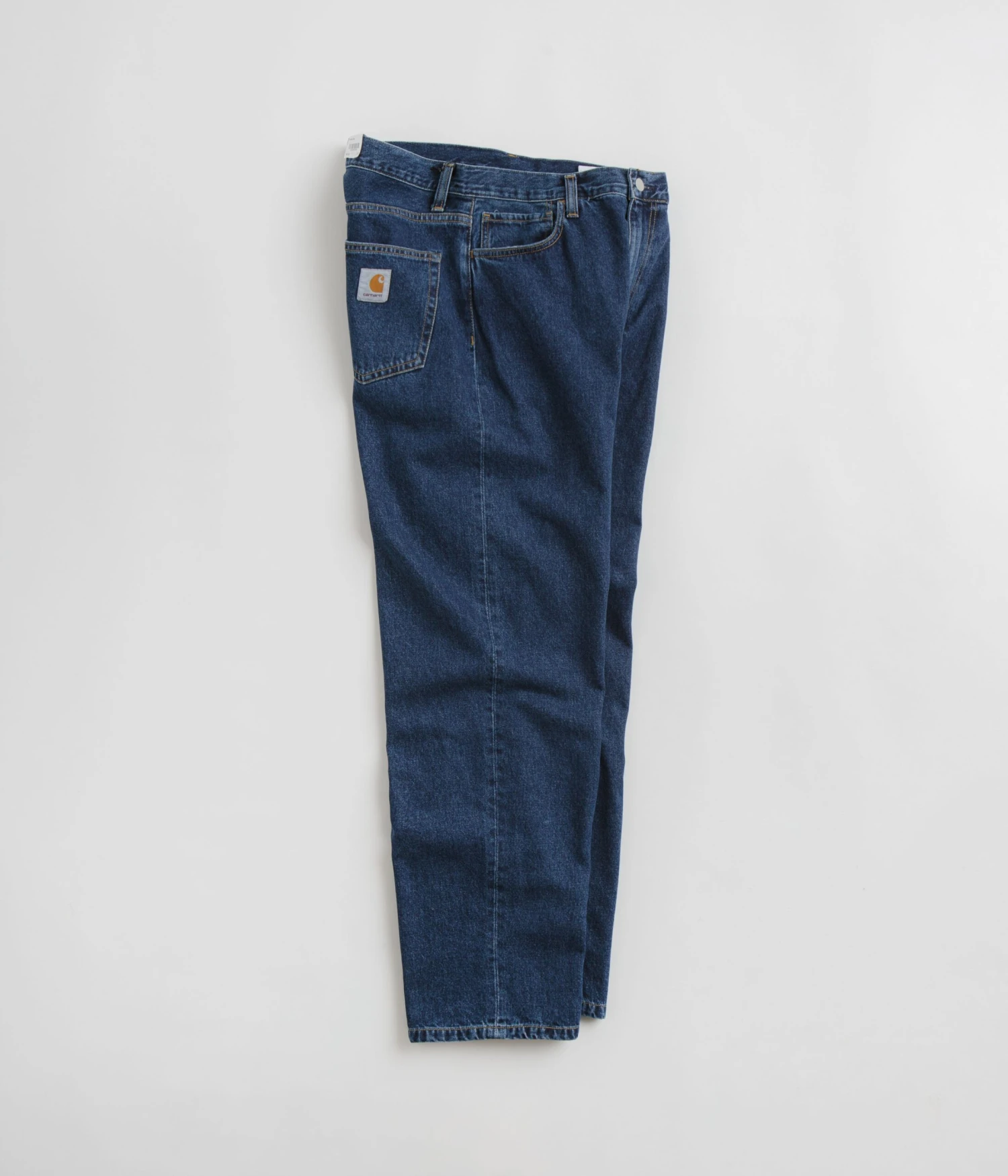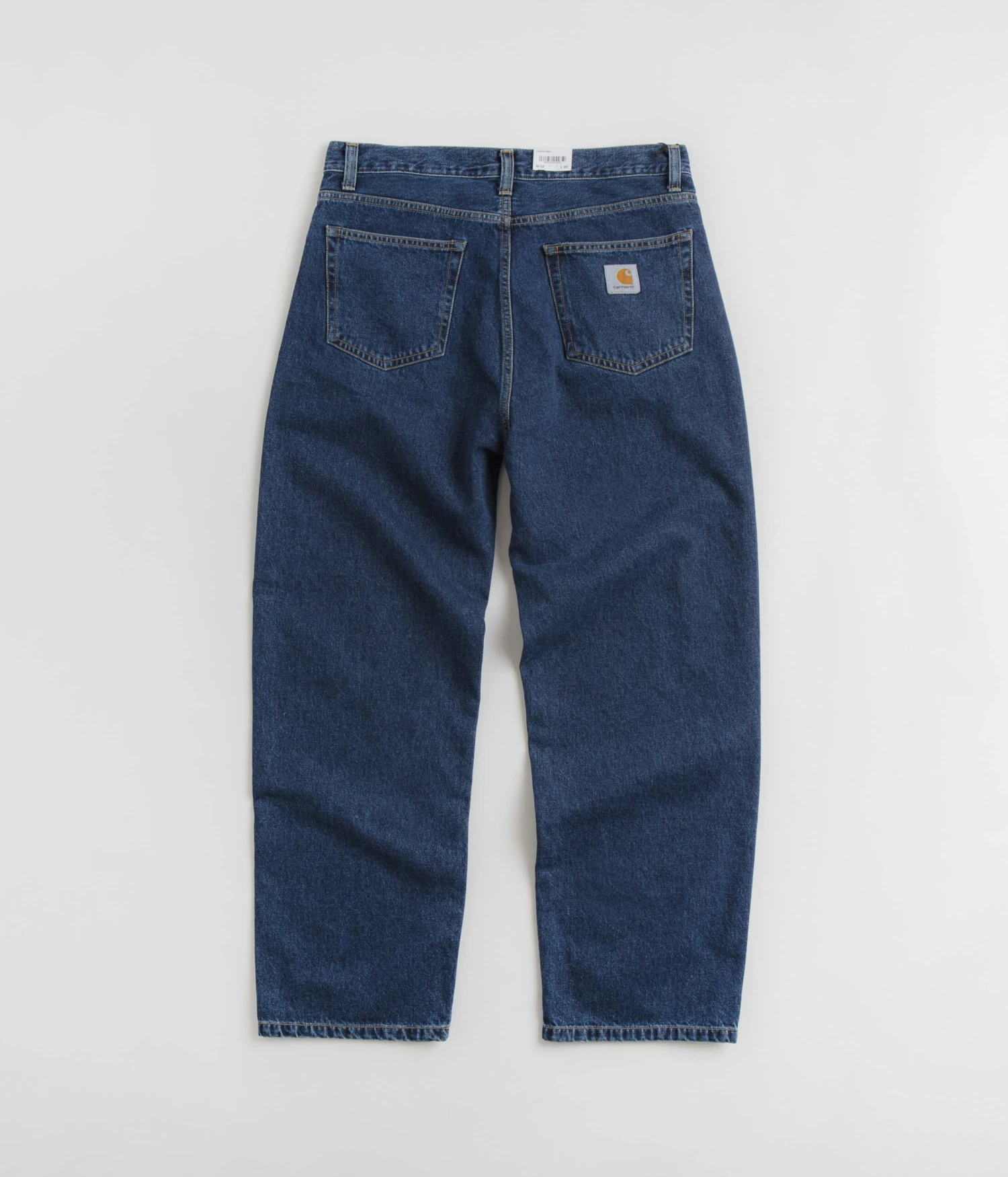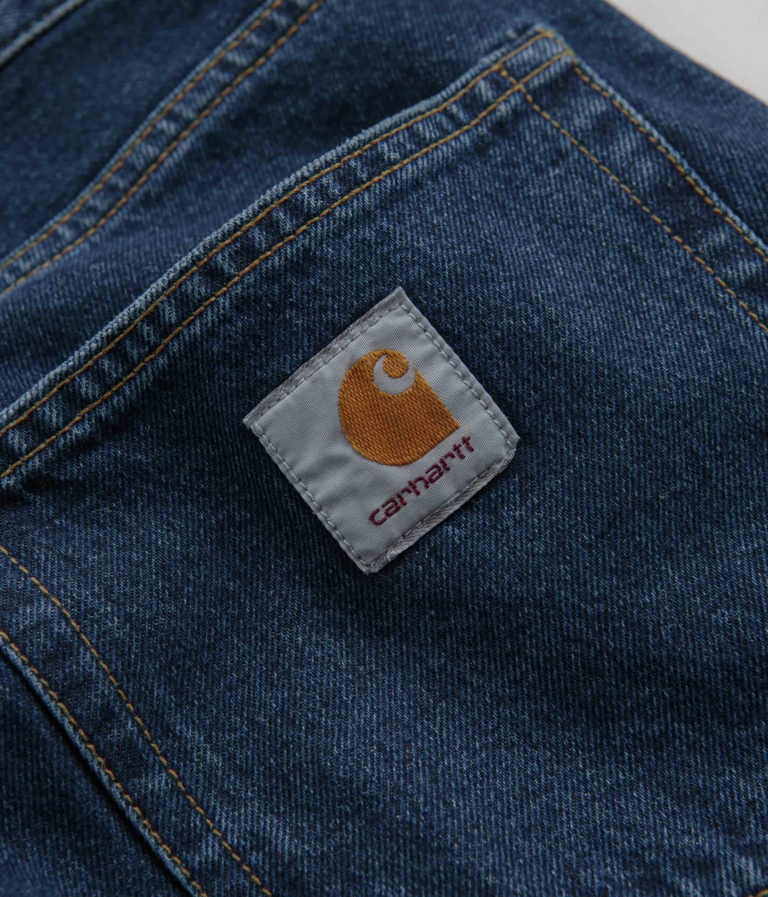 Carhartt Landon Pants in Blue Stone Washed. Made from 100% cotton ‘Robertson’ denim and tailored to a loose fitting, these heavyweight Carhartt pants are styled with a stone washed fabrication. Featuring contrast stitching, a classic belt loop waist and a single button secured zipper fly, these blue Carhartt pants are finished with two front pockets, two rear pockets and with woven flag label branding.