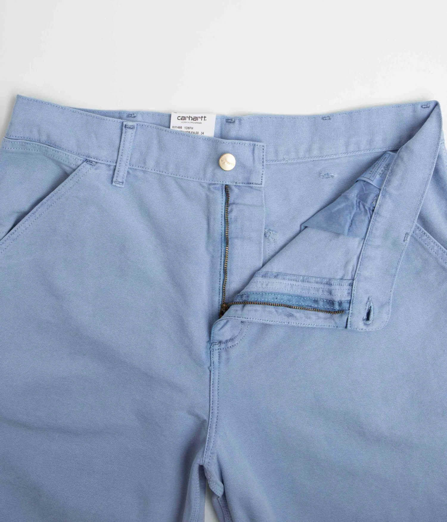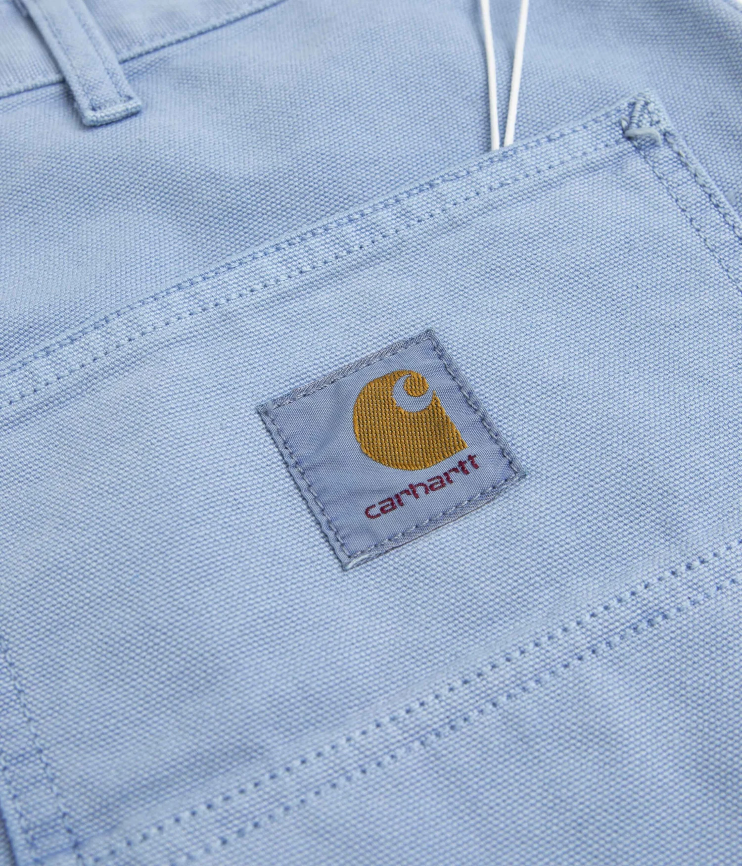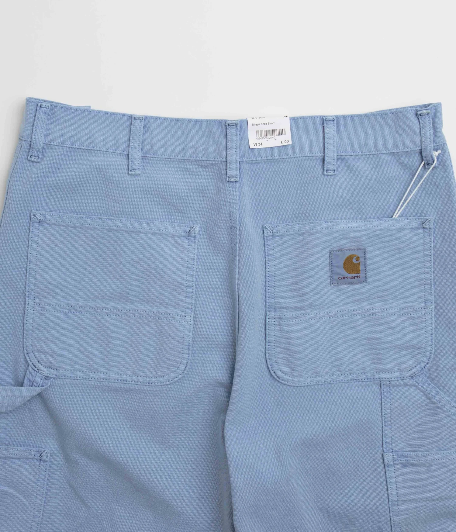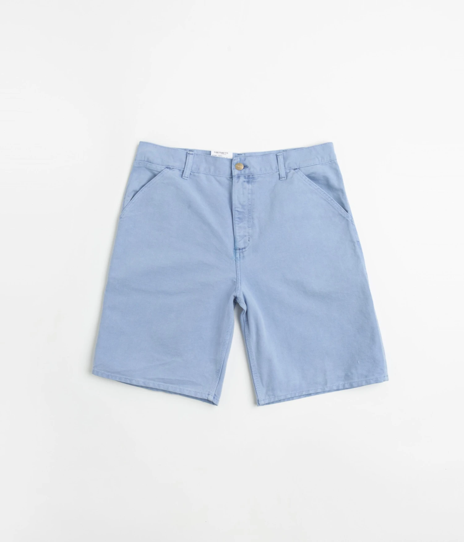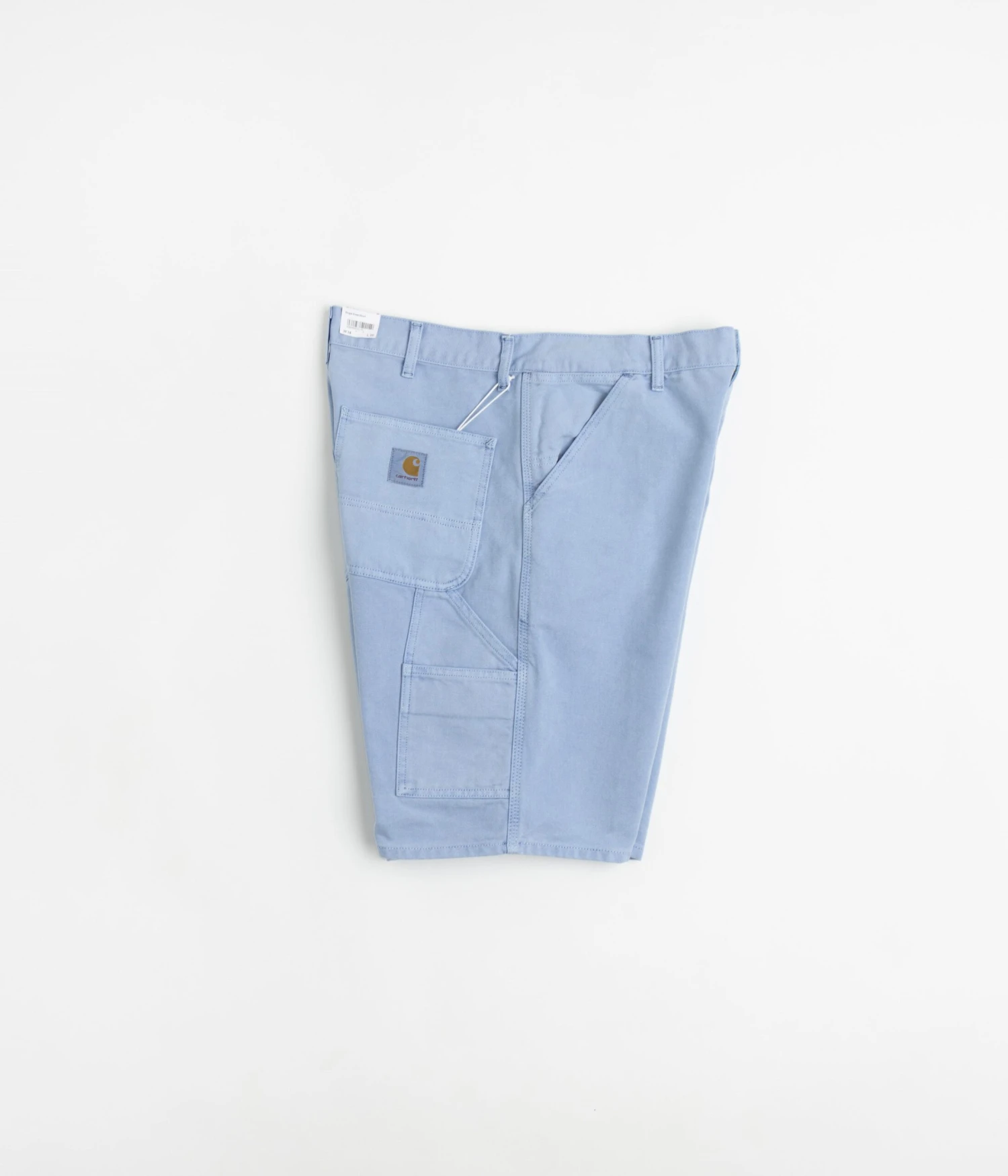 Carhartt Single Knee Shorts in Faded Piscine. Cut to knee length with a relaxed fit and a regular waist, these Carhartt shorts are made from 100% organic cotton ‘Dearborn’ canvas. Featuring a button secured zipper fly and triple-stitched seams, these faded blue Carhartt shorts are finished with two front pockets, two rear pockets, a woven tool pocket and with a practical hammer loop attachment.