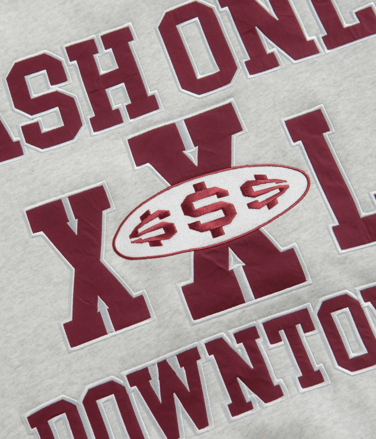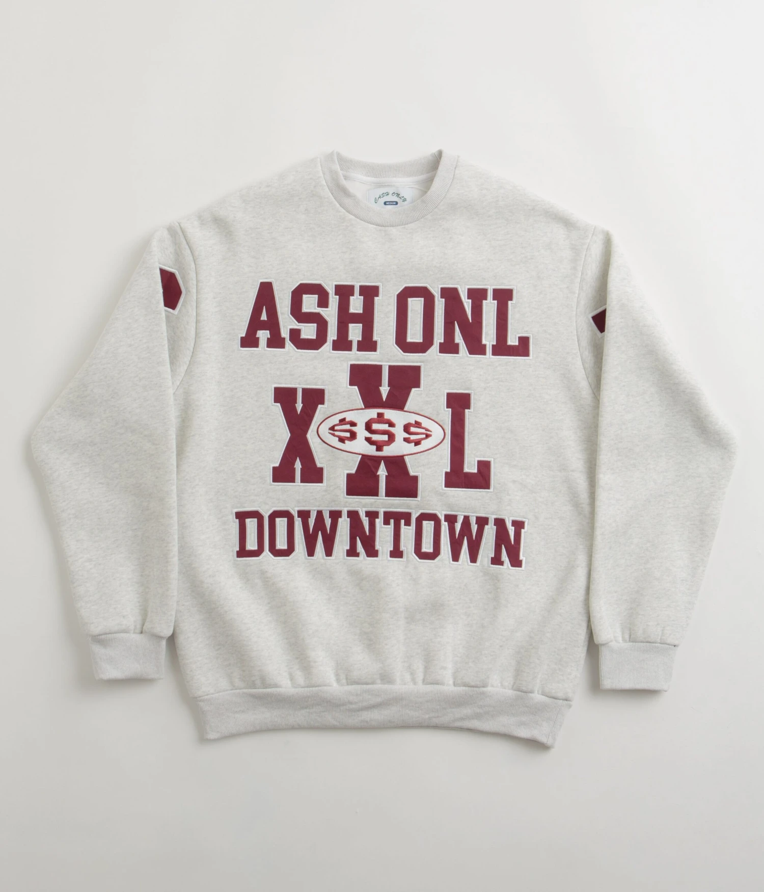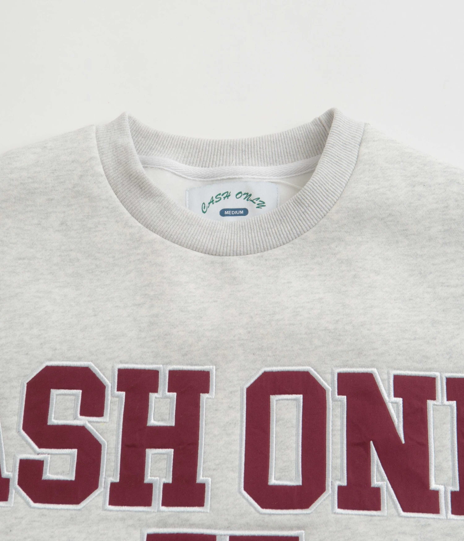 Cash Only Authority Crewneck Sweatshirt in Ash. Varsity inspired and made from a cotton-polyester blend, this regular fitting Cash Only sweatshirt is designed with a classic crew collar and dropped shoulders. Featuring ribbed cuffs and a woven elastic hem, this ash grey Cash Only sweater is finished with nylon applique embroidered chest and sleeve detailing.