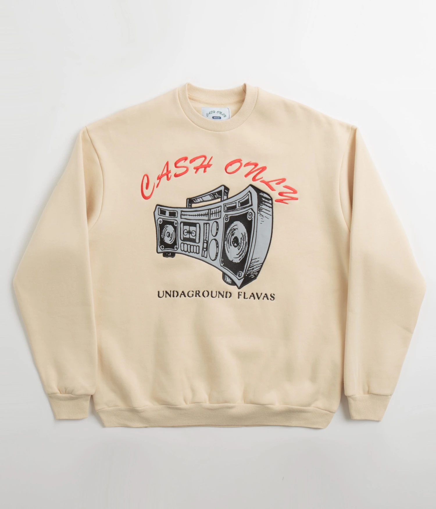 Cash Only Boombox Applique Crewneck Sweatshirt in Cream. Part of the brand’s latest collection, this Cash Only sweatshirt is made from a heavyweight cotton-polyester blend. Featuring a flexible rib knit collar, ribbed cuffs and a woven elastic hem, this cream Cash Only sweater is finished with dropped shoulders and a large nylon applique Undaground Flavas boombox chest graphic.