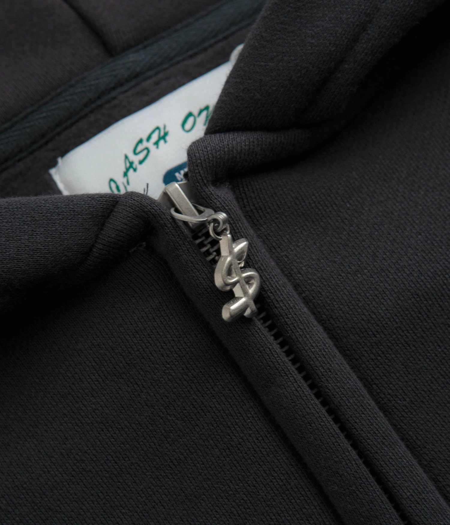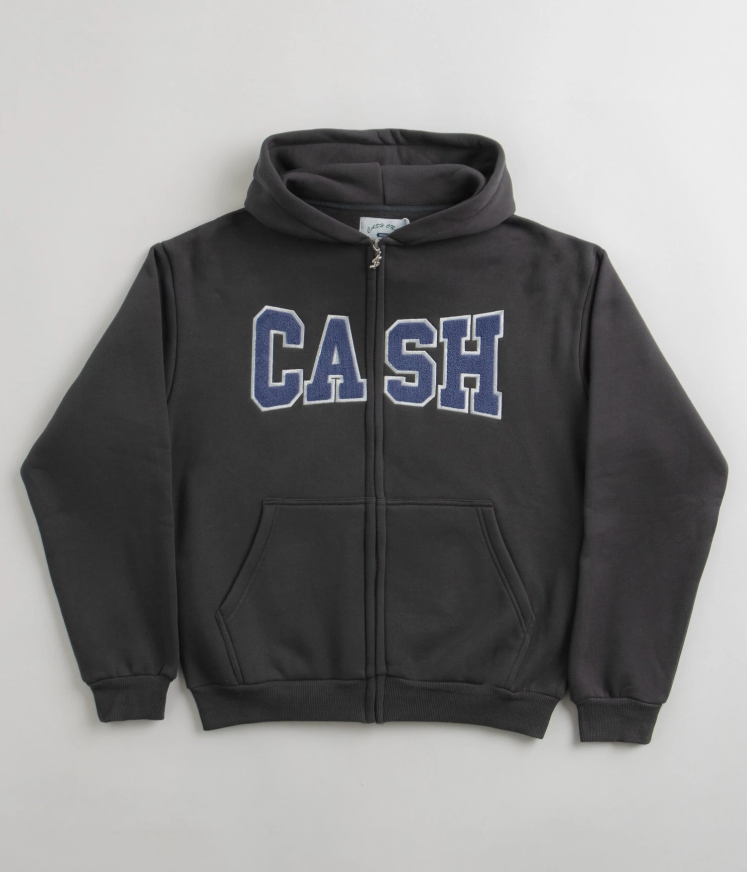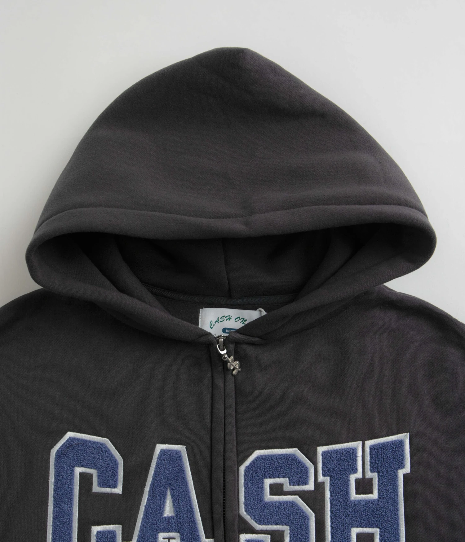 Cash Only Campus Zip-Thru Hoodie in Black and Blue. Regular fitting and made from a midweight cotton-polyester blend, this Cash Only hoodie is designed with a split panel hood and a custom pigment dye. Featuring a full length zipper fastening, a dollar-sign zip pull, ribbed cuffs and a woven elastic hem, this black Cash Only hoodie is finished with two front pockets and with chenille applique centre chest embroidery.
