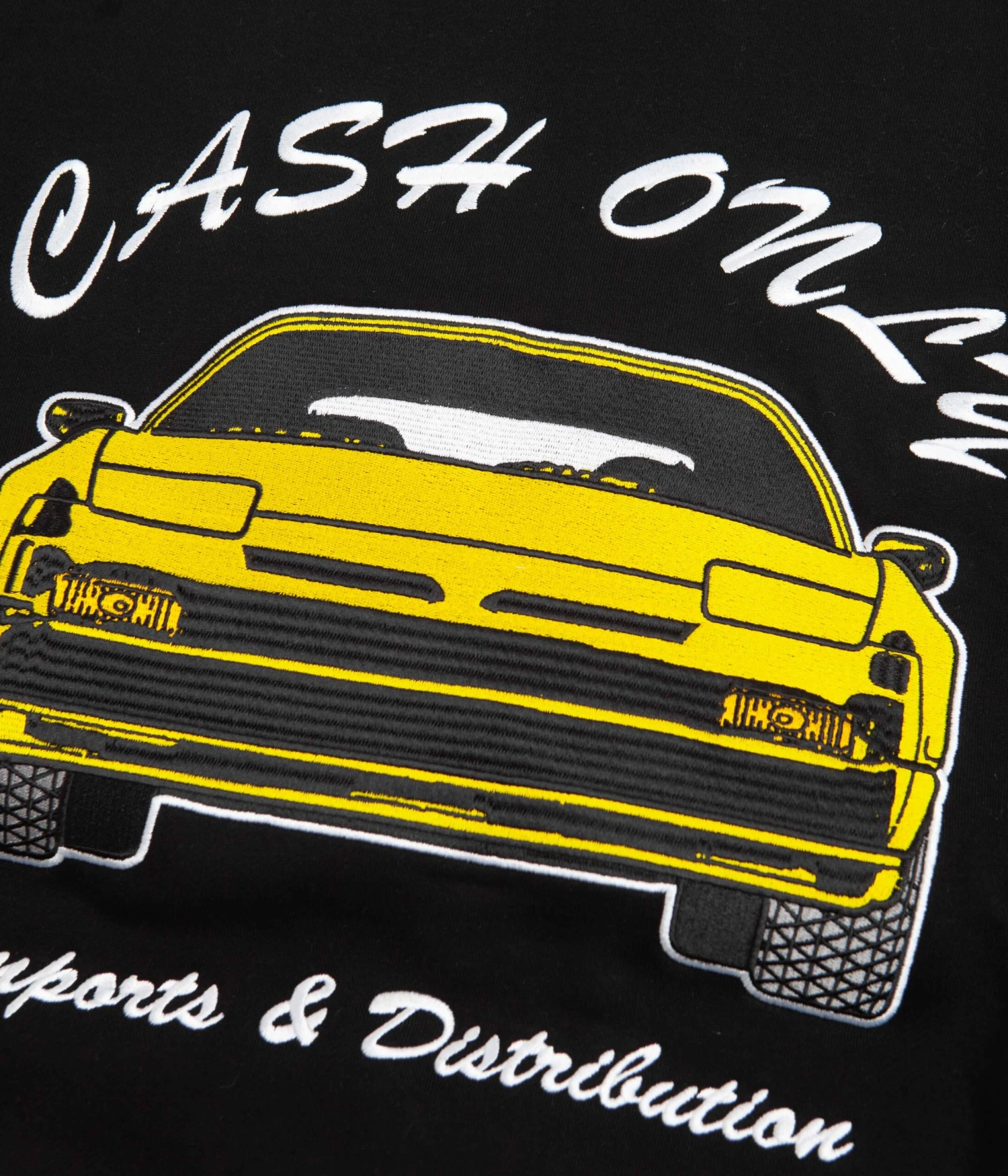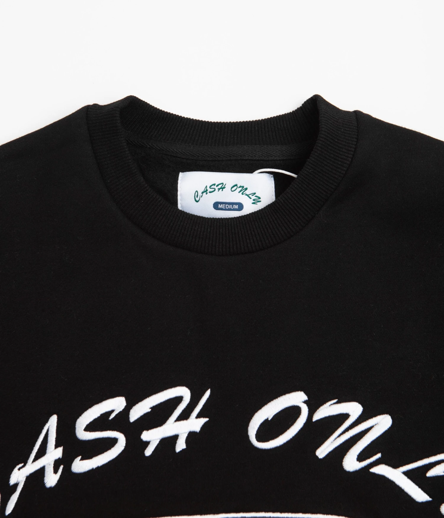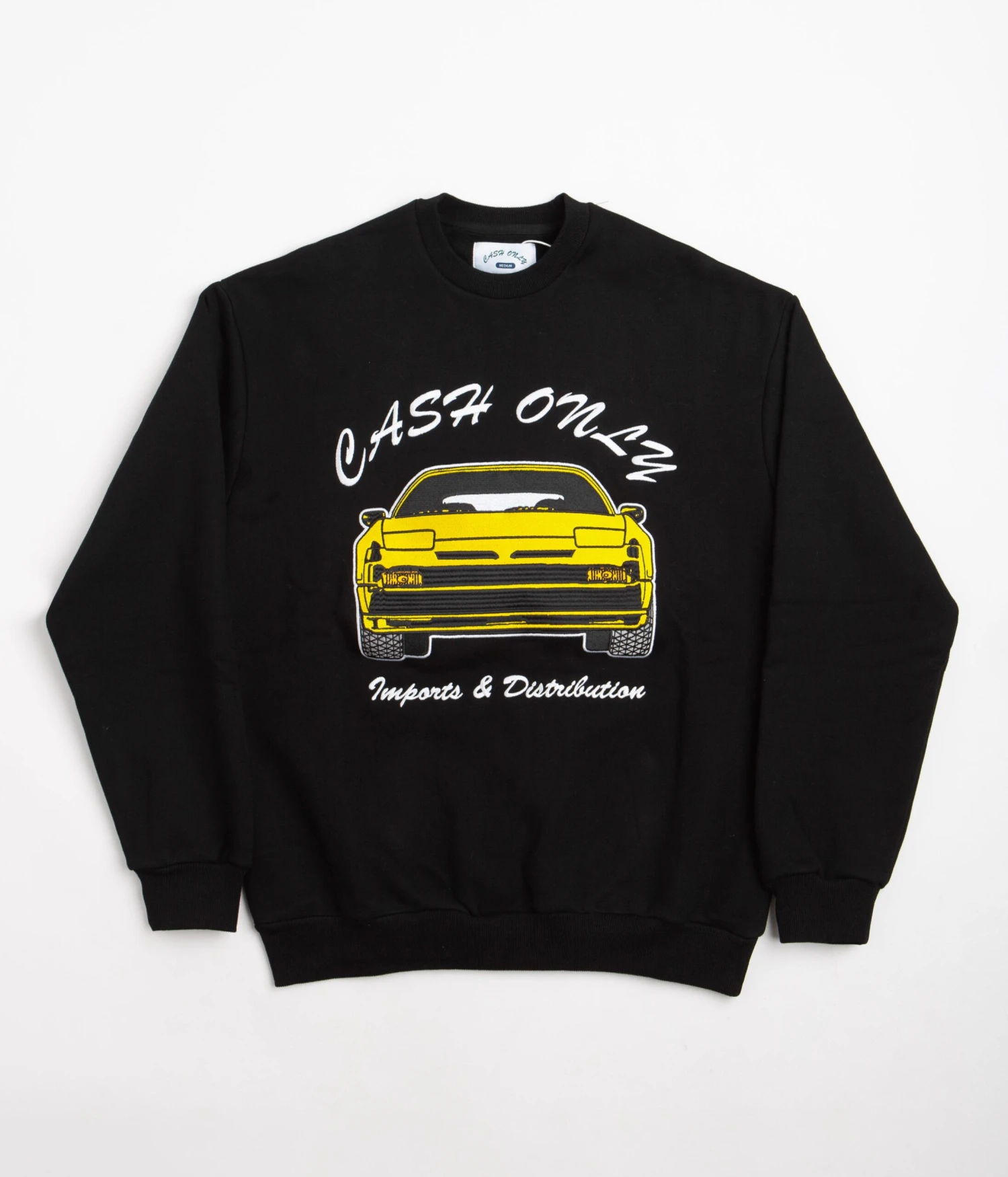 Cash Only Car Embroidered Crewneck Sweatshirt in Black. Made from a cotton-polyester blend, this heavyweight Cash Only sweatshirt is tailored to a regular fitting with dropped shoulders and a thick rib crew collar. Finished in a shade of black with a woven elastic hemline and direct ‘Imports & Distribution’ embroidery sewn across the centre chest.Â