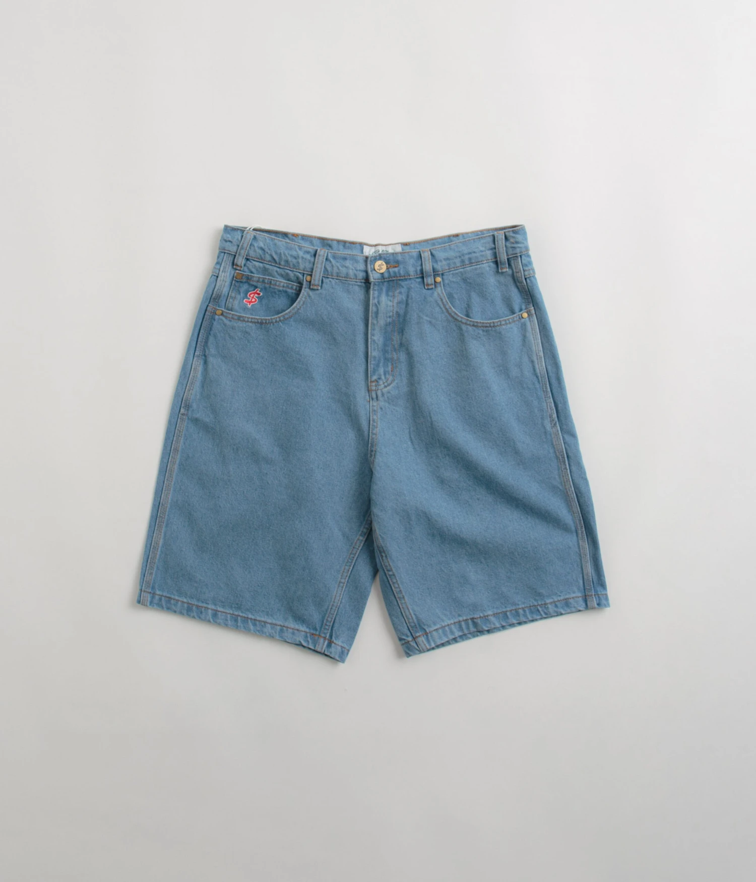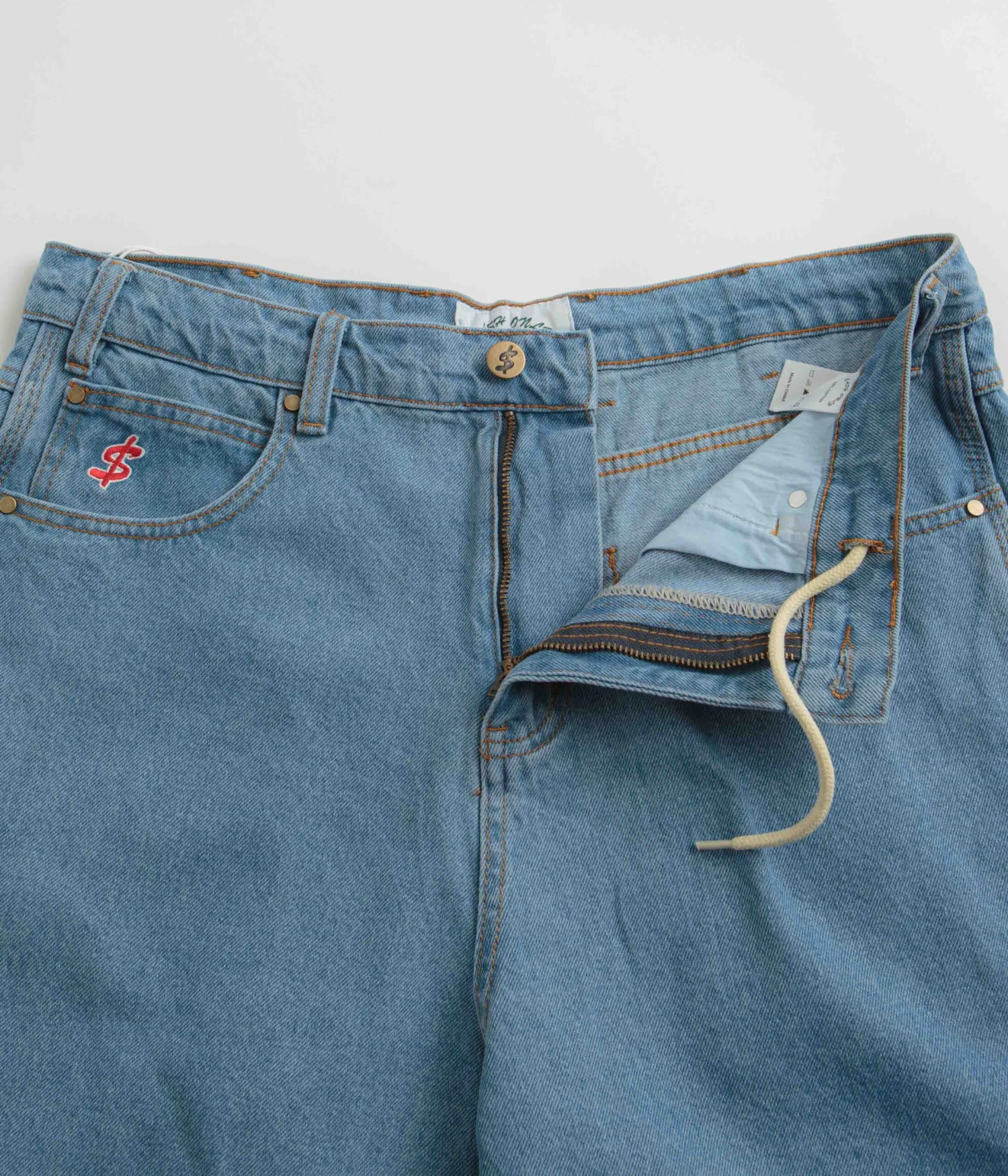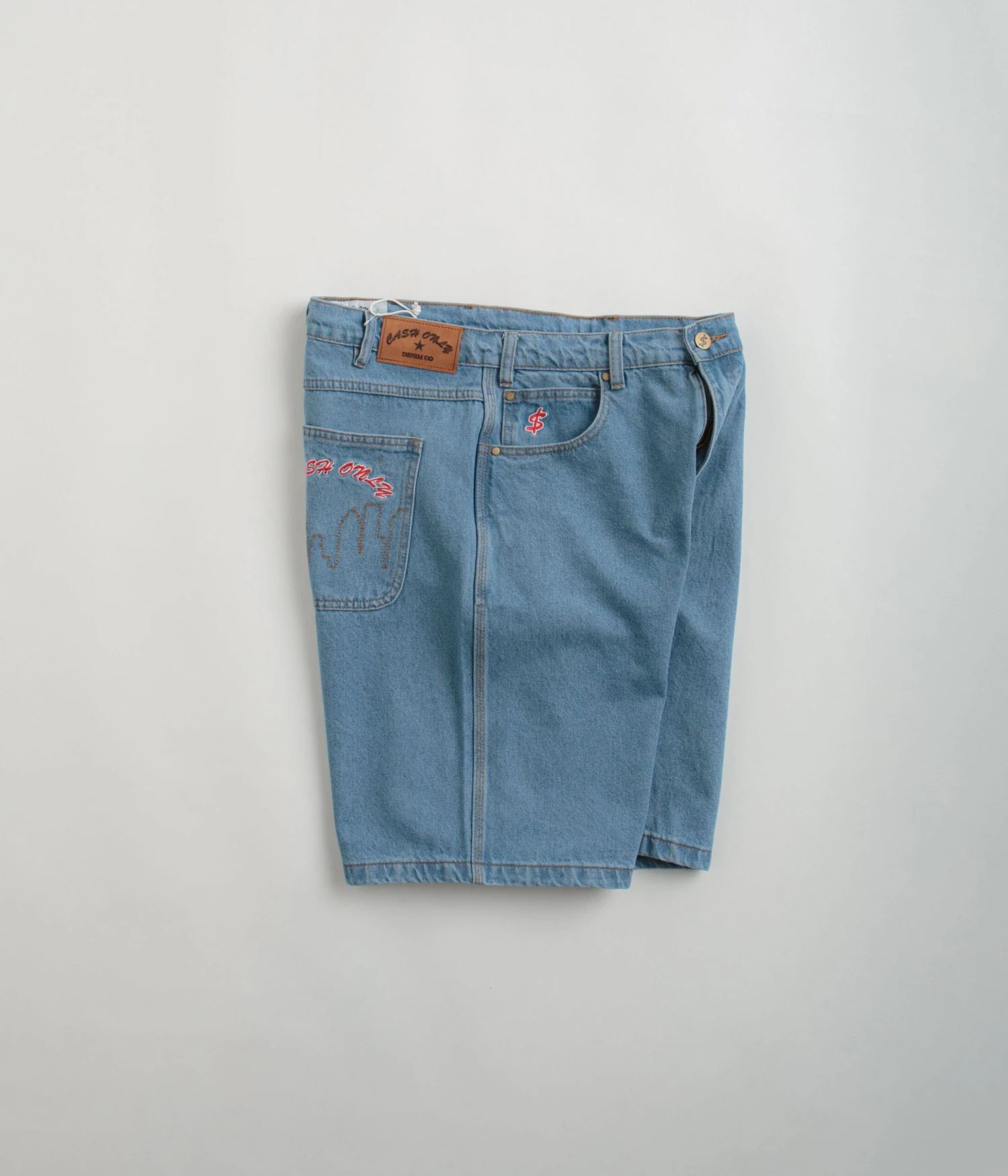Cash Only Logo Denim Shorts in Washed Indigo. Baggy fitting and made from 100% cotton denim, these Cash Only shorts are designed with contrast stitching and embroidered graphics. Featuring a single button secured zipper fly and an inner drawstring waist, these washed blue Cash Only shorts are finished with four classic pockets, an embroidered coin pocket and with a woven rear waistband patch.
