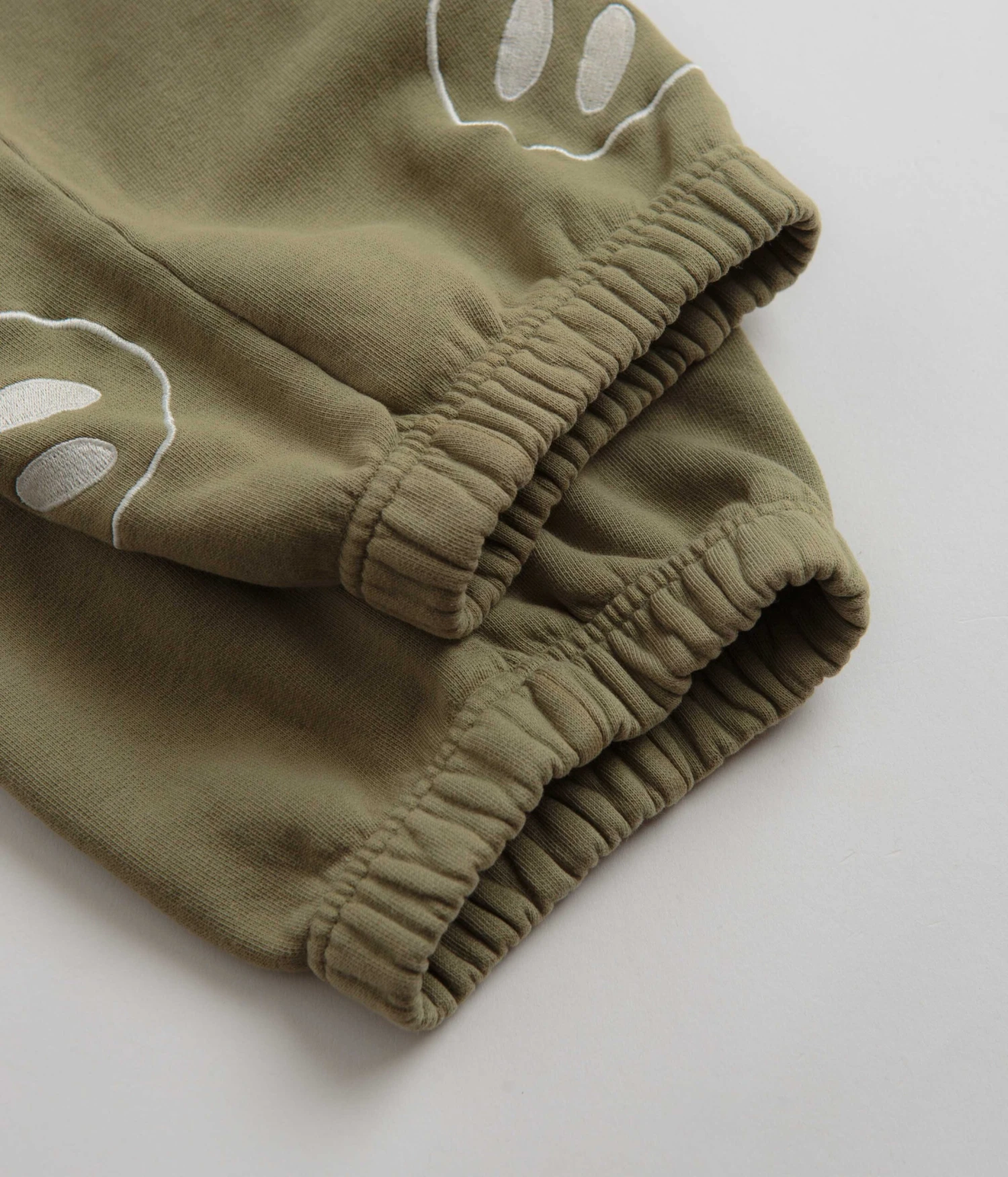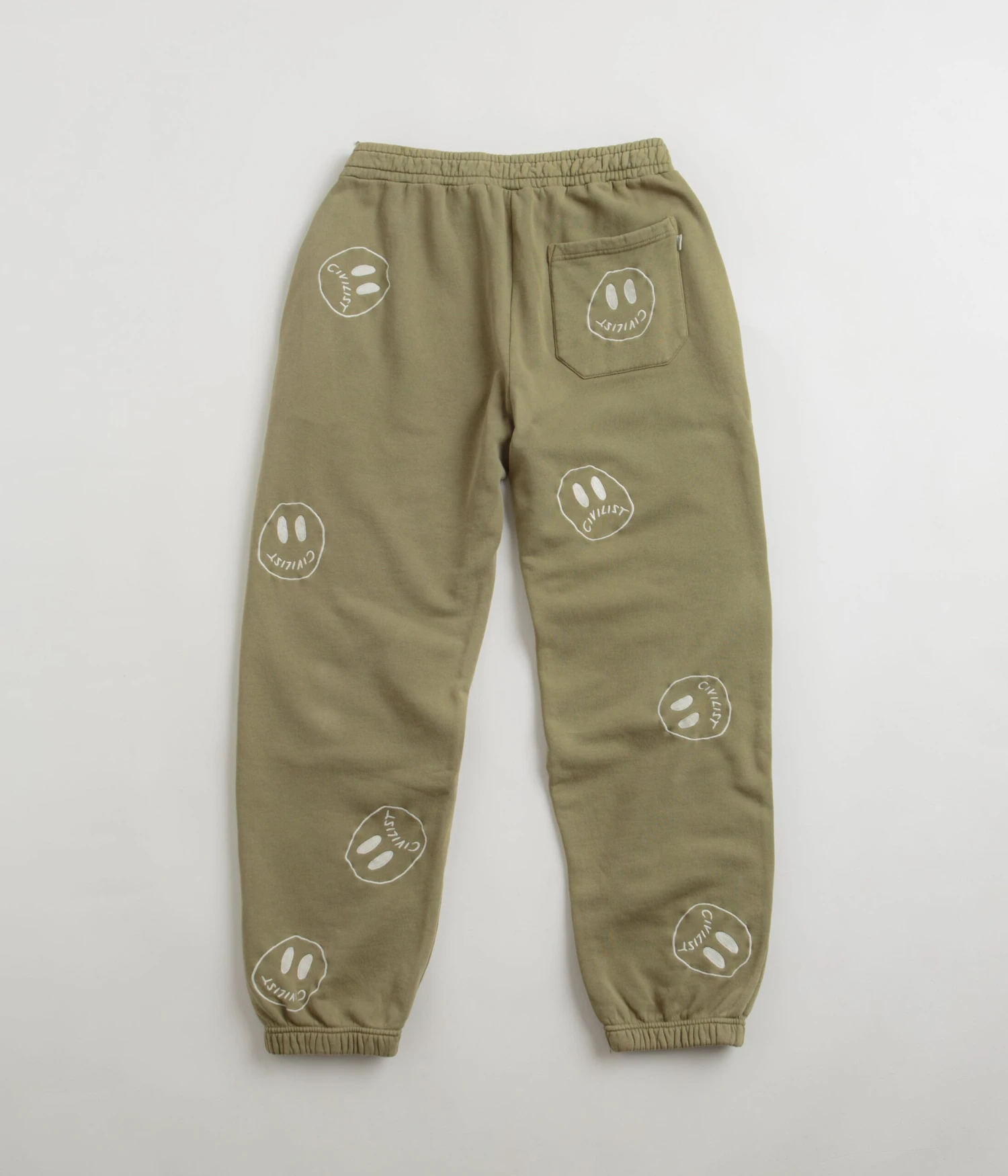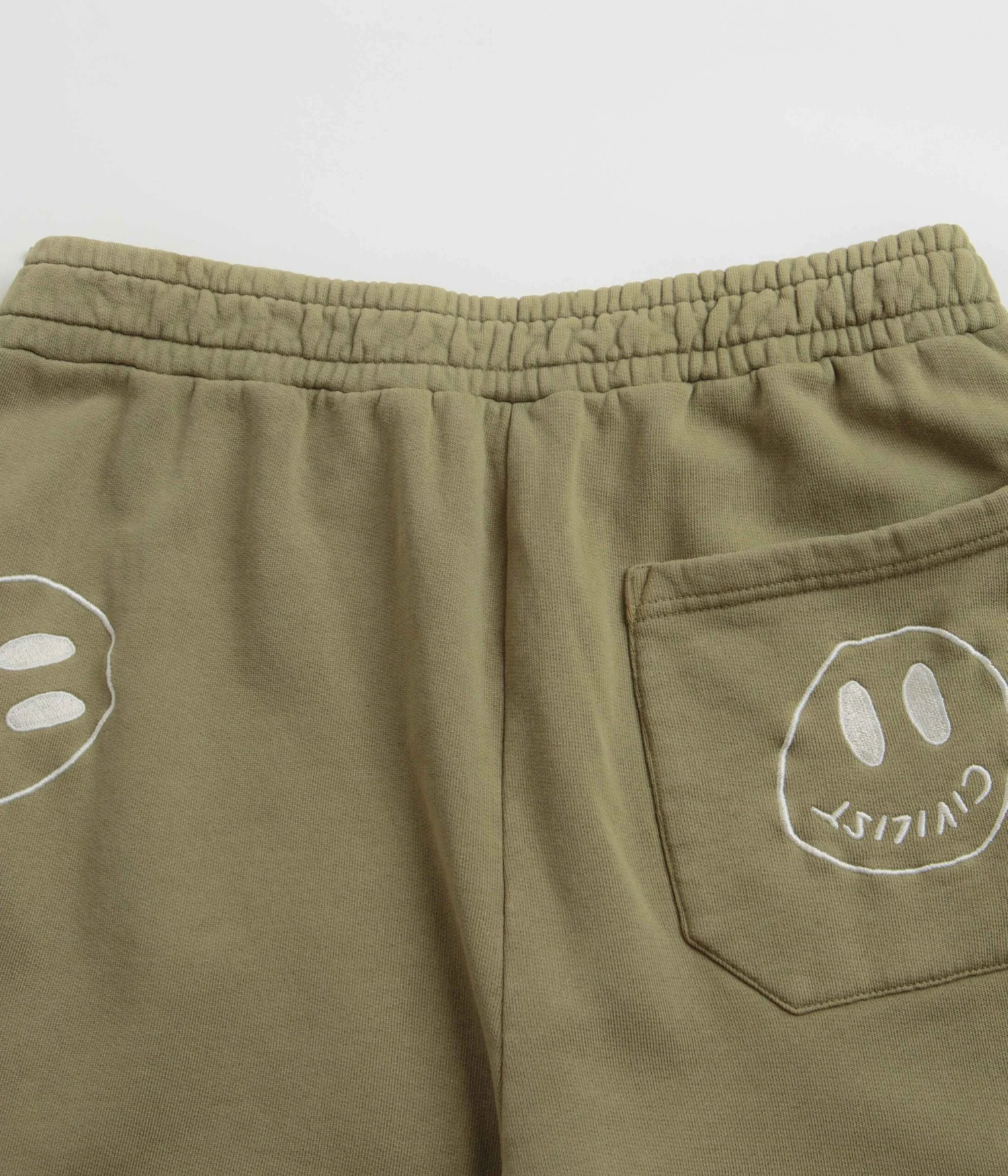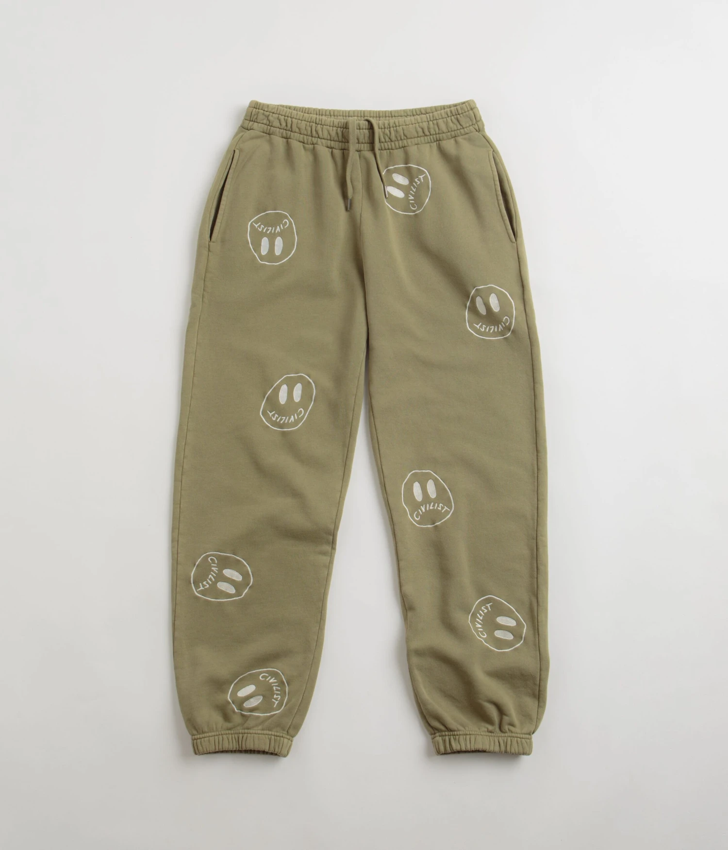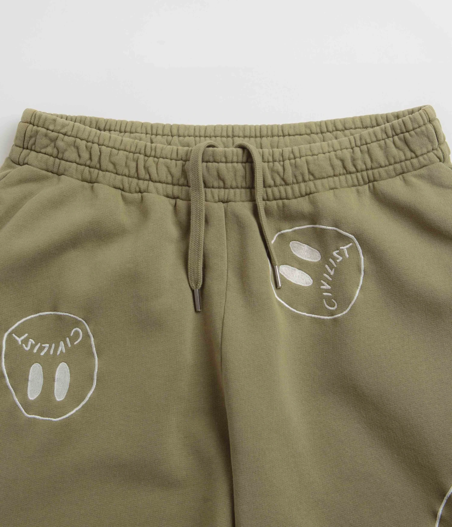 Civilist Allover Smiler Joggers in Olive. Styled with a tapered leg and elasticated cuffs, these Civilist joggers are made from 100% cotton. Featuring an elasticated waistband, an inner drawcord and all-over direct embroidery, these olive green Civilist pants are finished with two side pockets and a rear pocket.