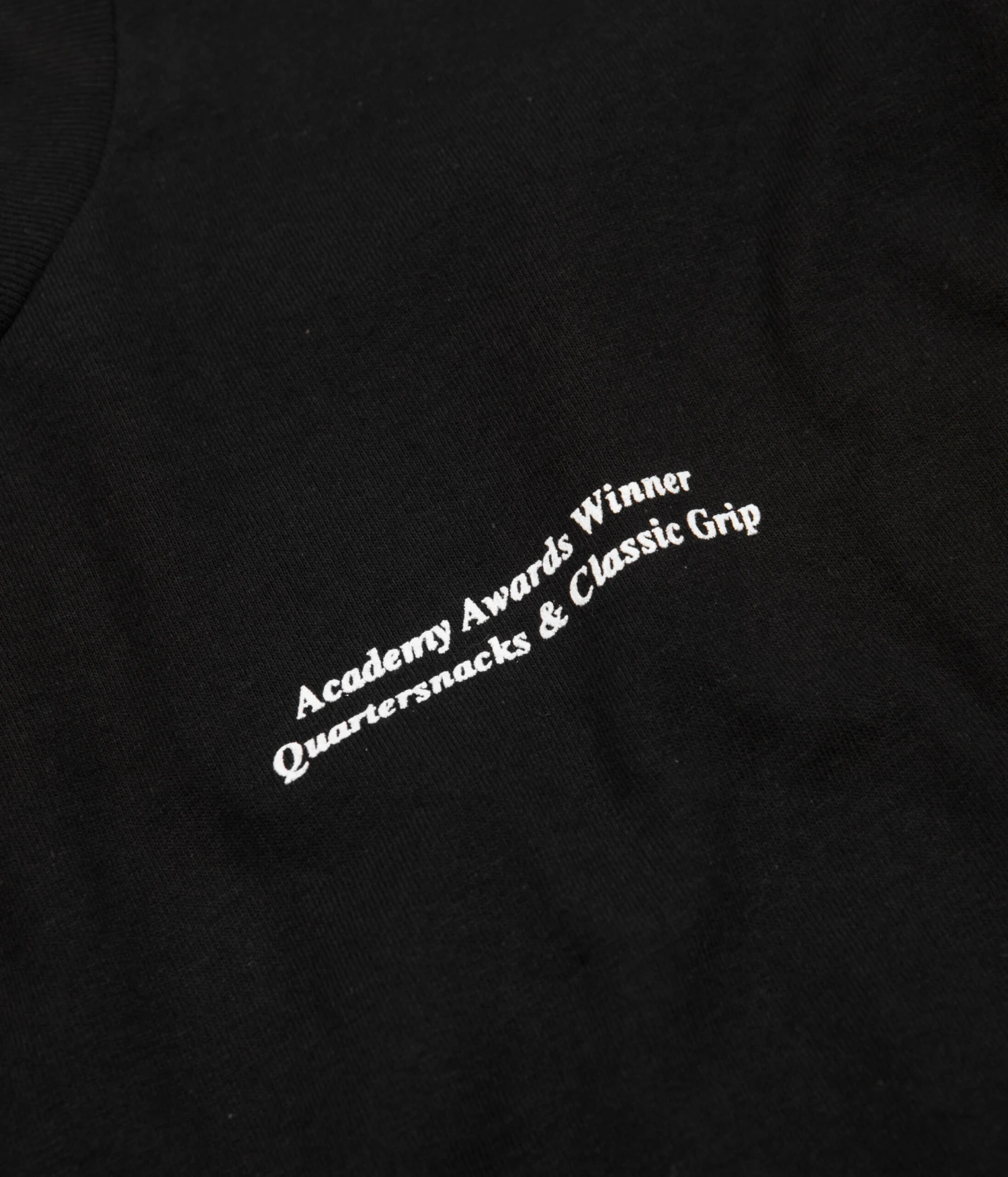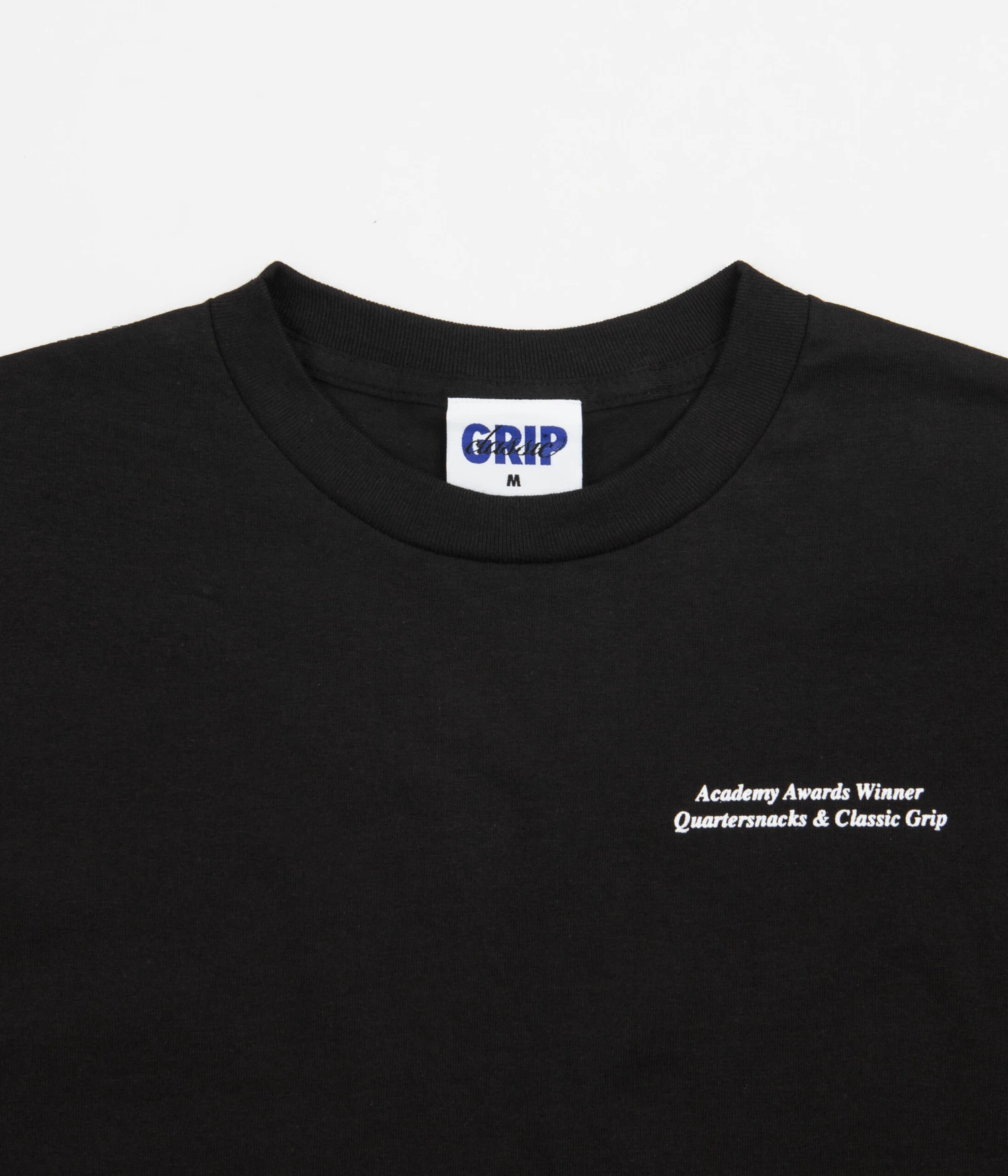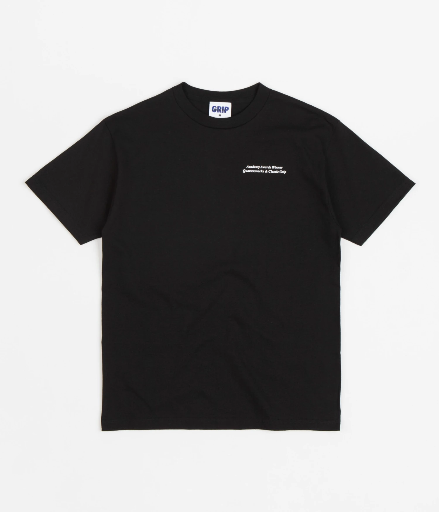 Classic Grip x Quartersnacks Winner T-Shirt in Black. Designed in partnership with Quartersnacks and made from 100% cotton, this regular fitting Classic Grip t-shirt features a flexible rib knit collar and a reinforced hemline. Finished in a shade of black with printed ‘Academy Awards Winner’ co-designed branding across the left chest and reverse.