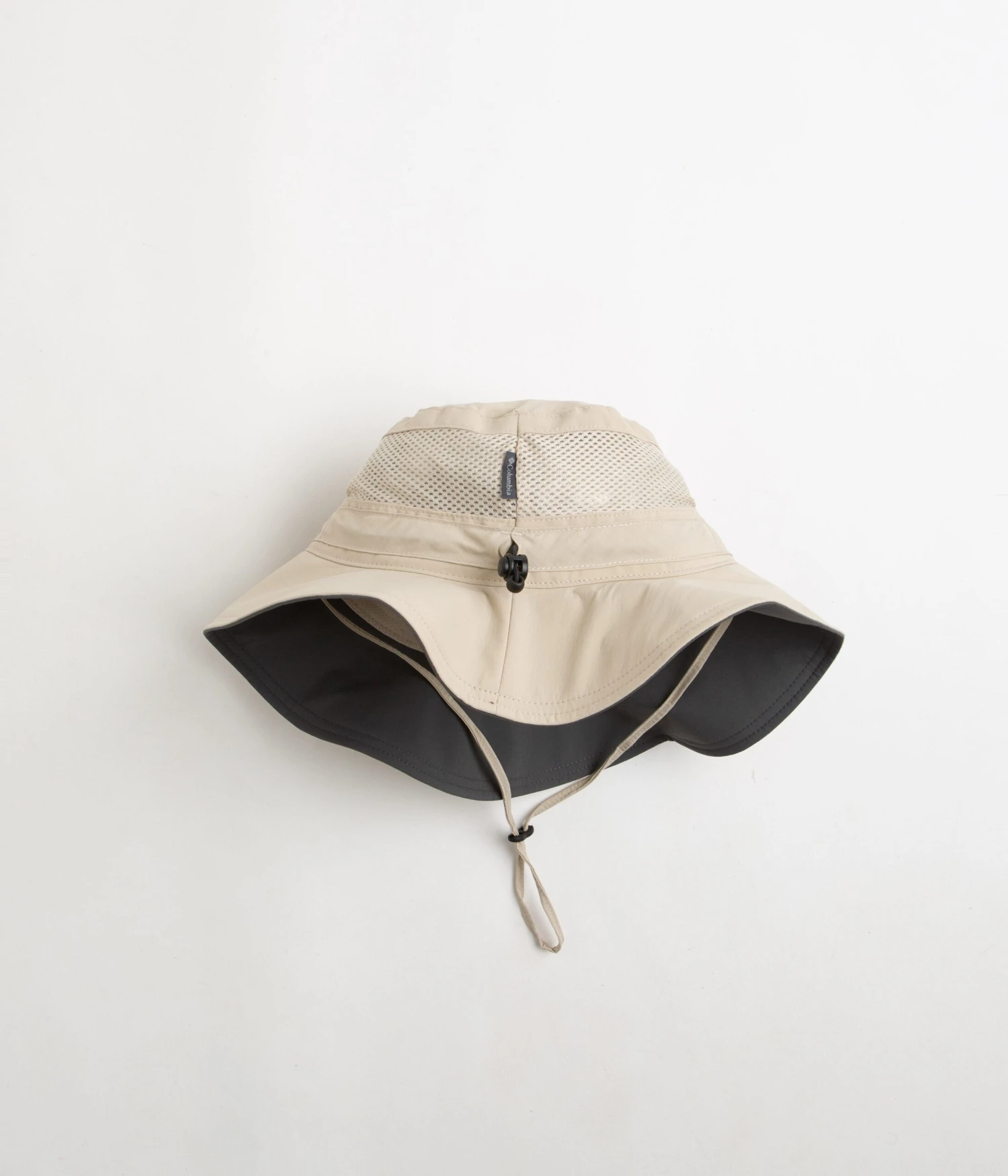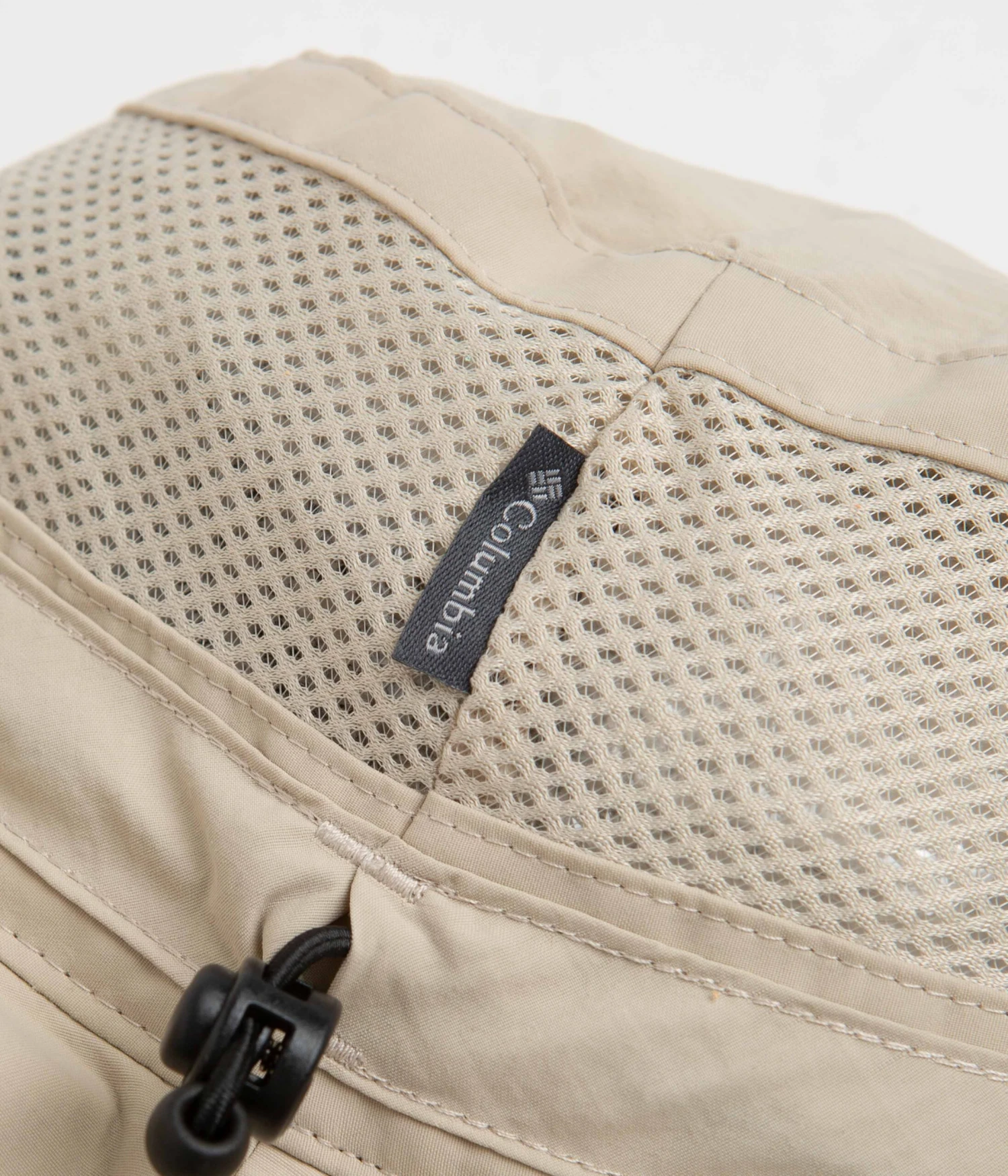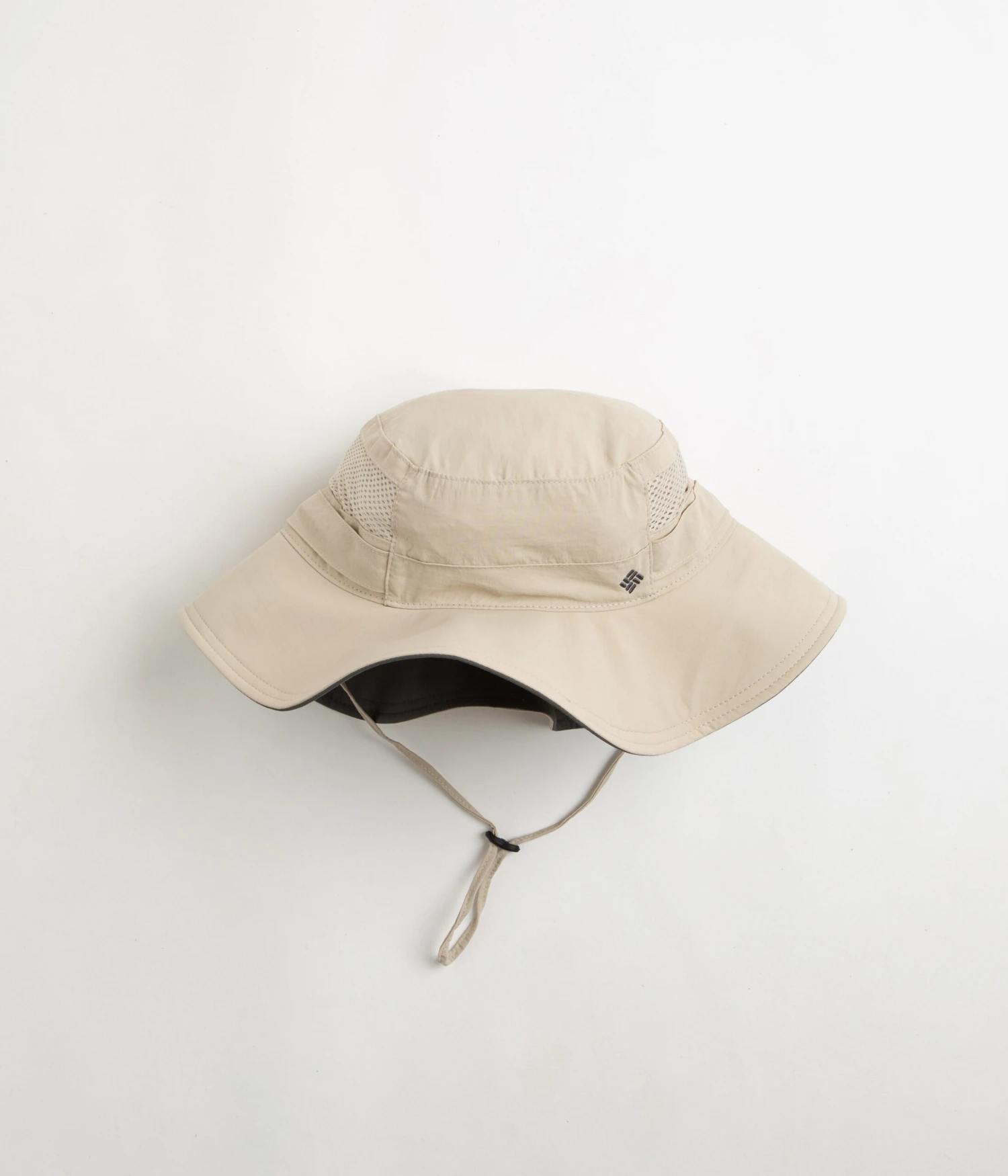 Columbia Bora Bora Booney Hat in Fossil. Single sized and made from 100% textured nylon poplin, this Columbia booney hat is styled with built-in Omni-Wick™ technology with a 3” wrap-around brim. Finished with an adjustable under-chin strap, a toggle-cord rear fastening and with an embroidered Columbia crown logo.