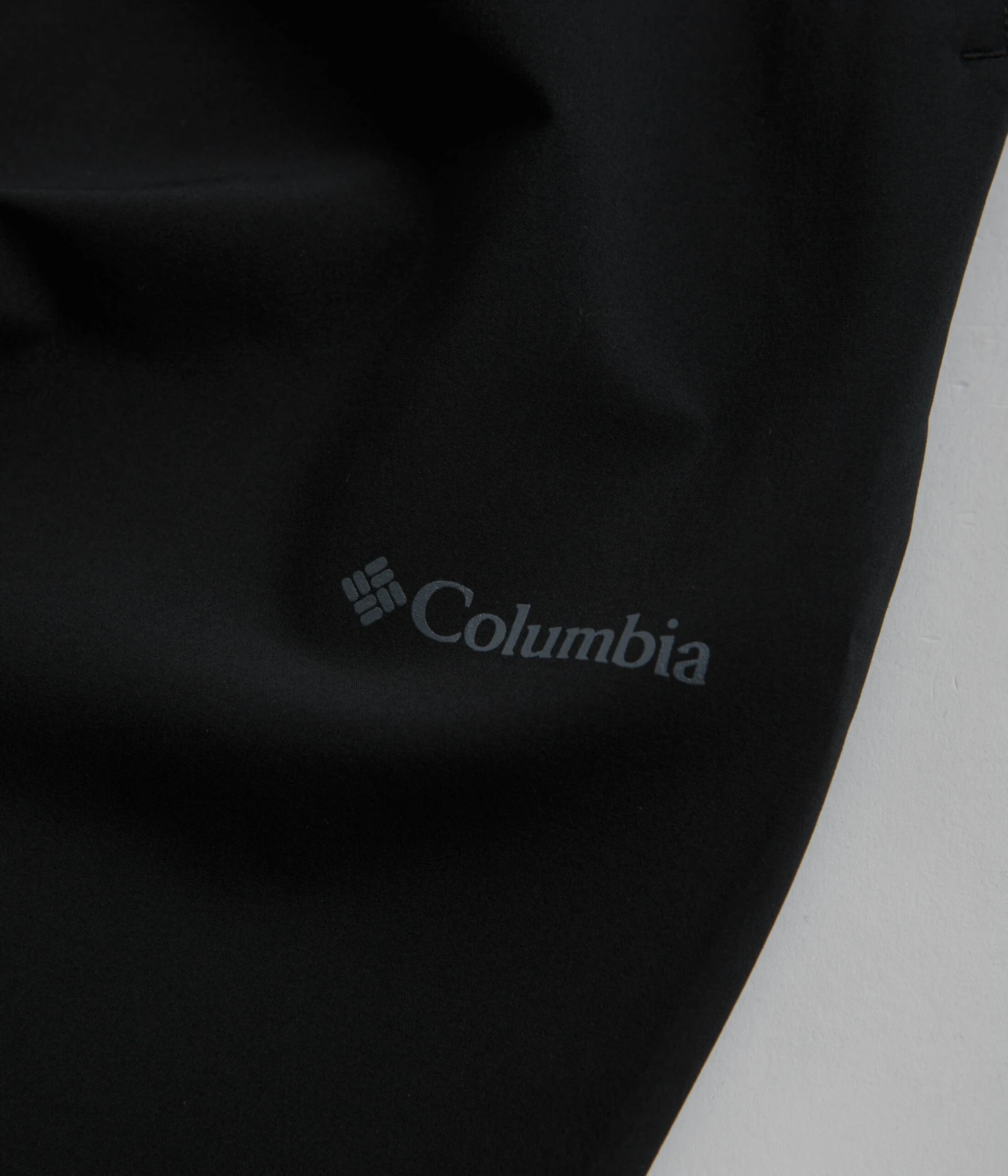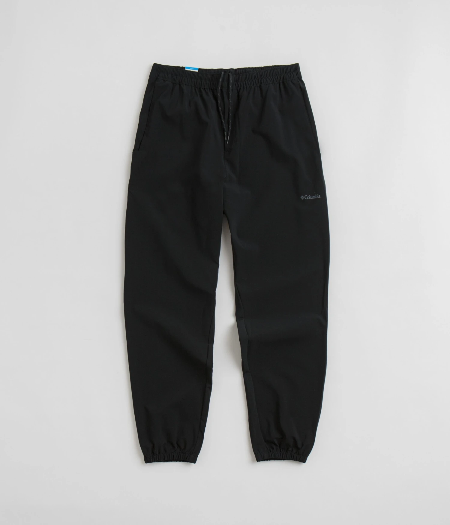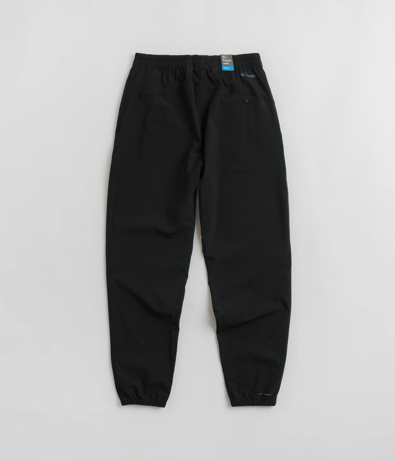 Columbia Hike Joggers in Black. Made from a stretchy polyester-elastane blend, these tapered leg Columbia joggers are tailored to a regular fitting. Featuring Omni-Shieldâ„¢ Advanced repellency with an elasticated drawstring waist and rib knit cuffs, these black Columbia pants are finished with two side pockets, a rear snap pocket and printed Columbia branding.