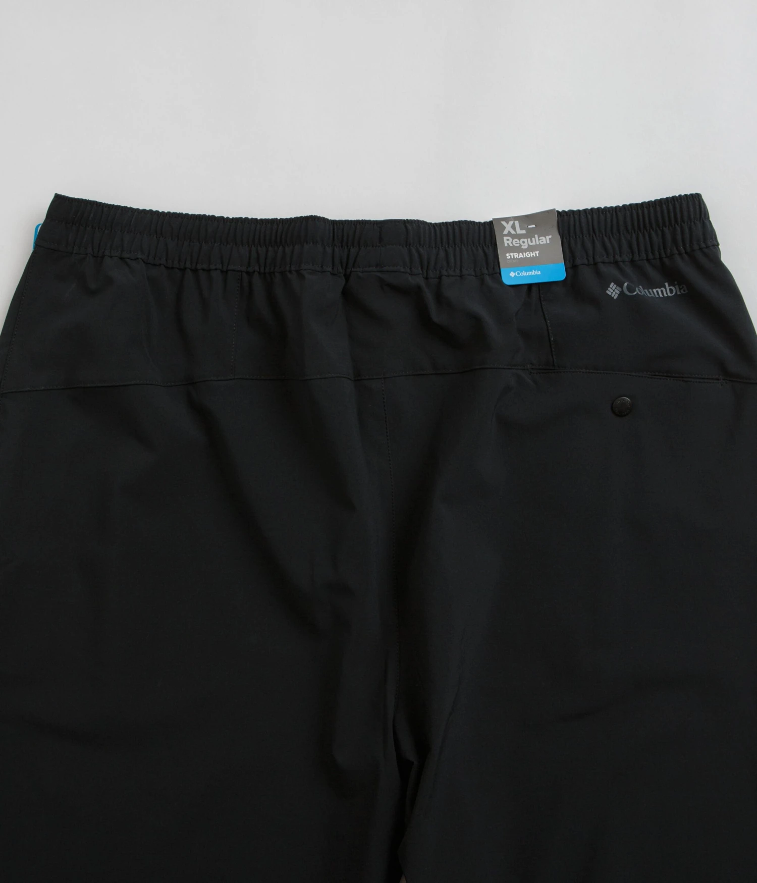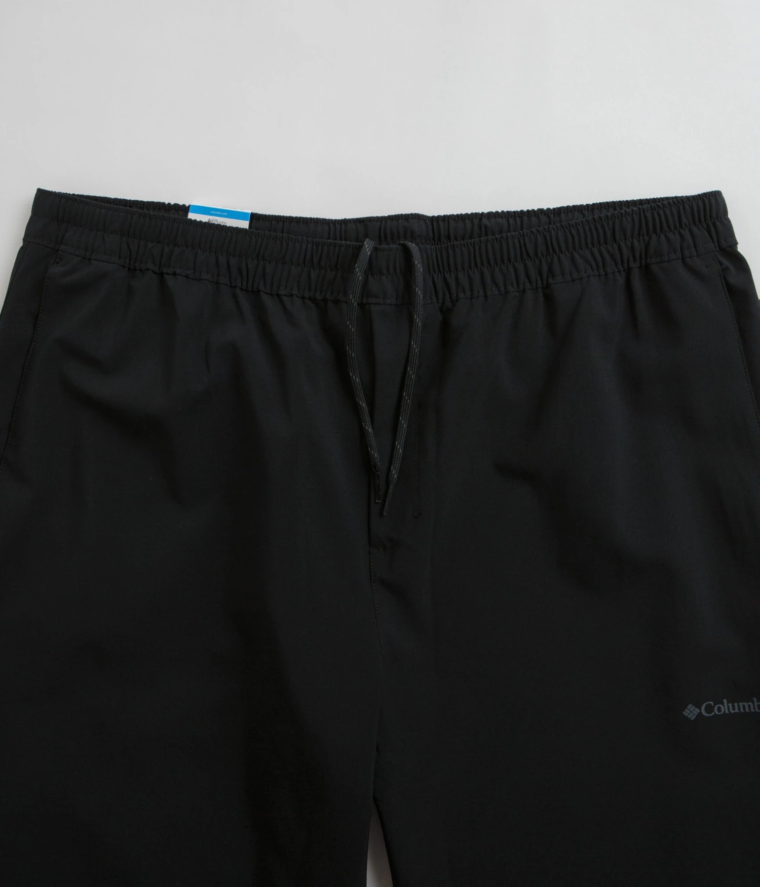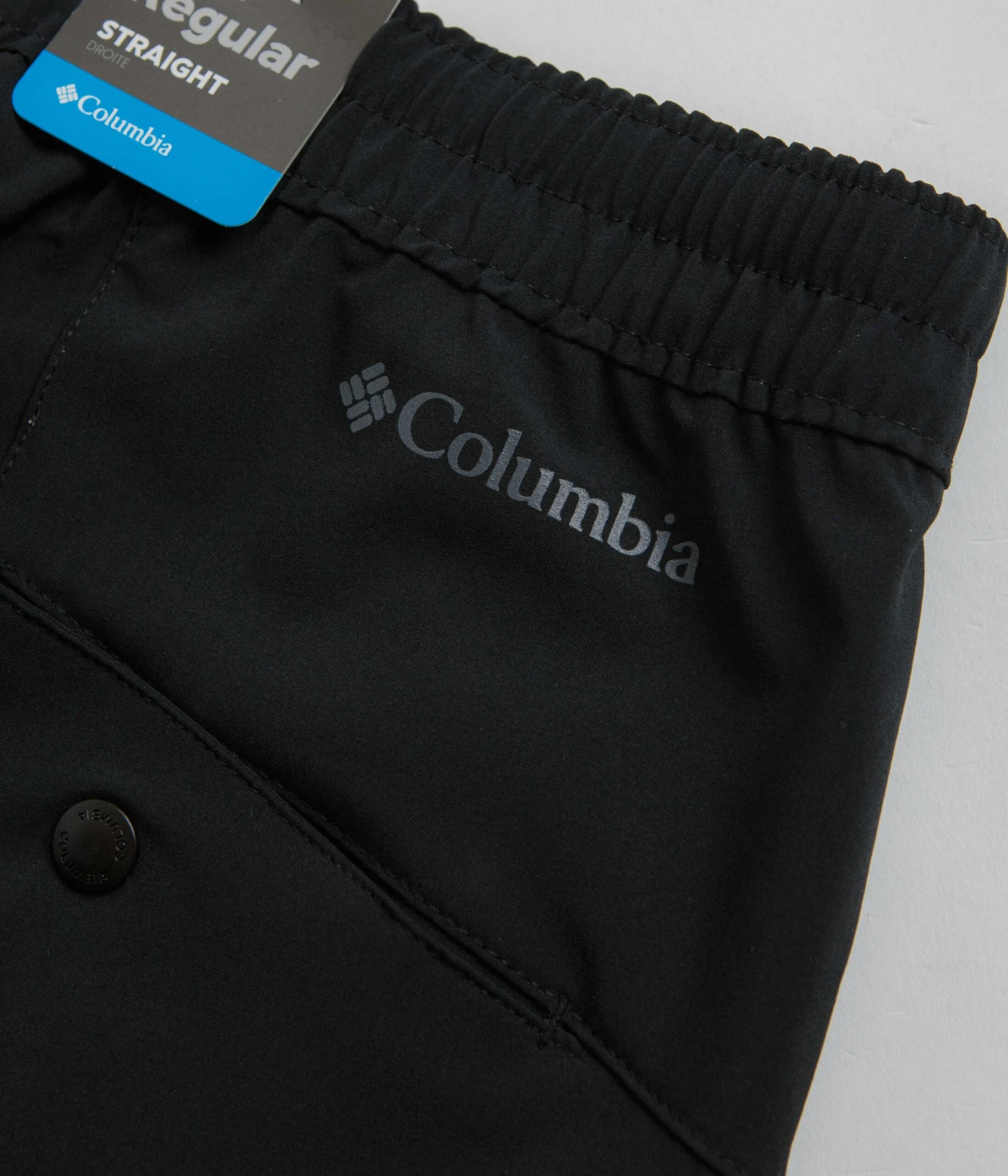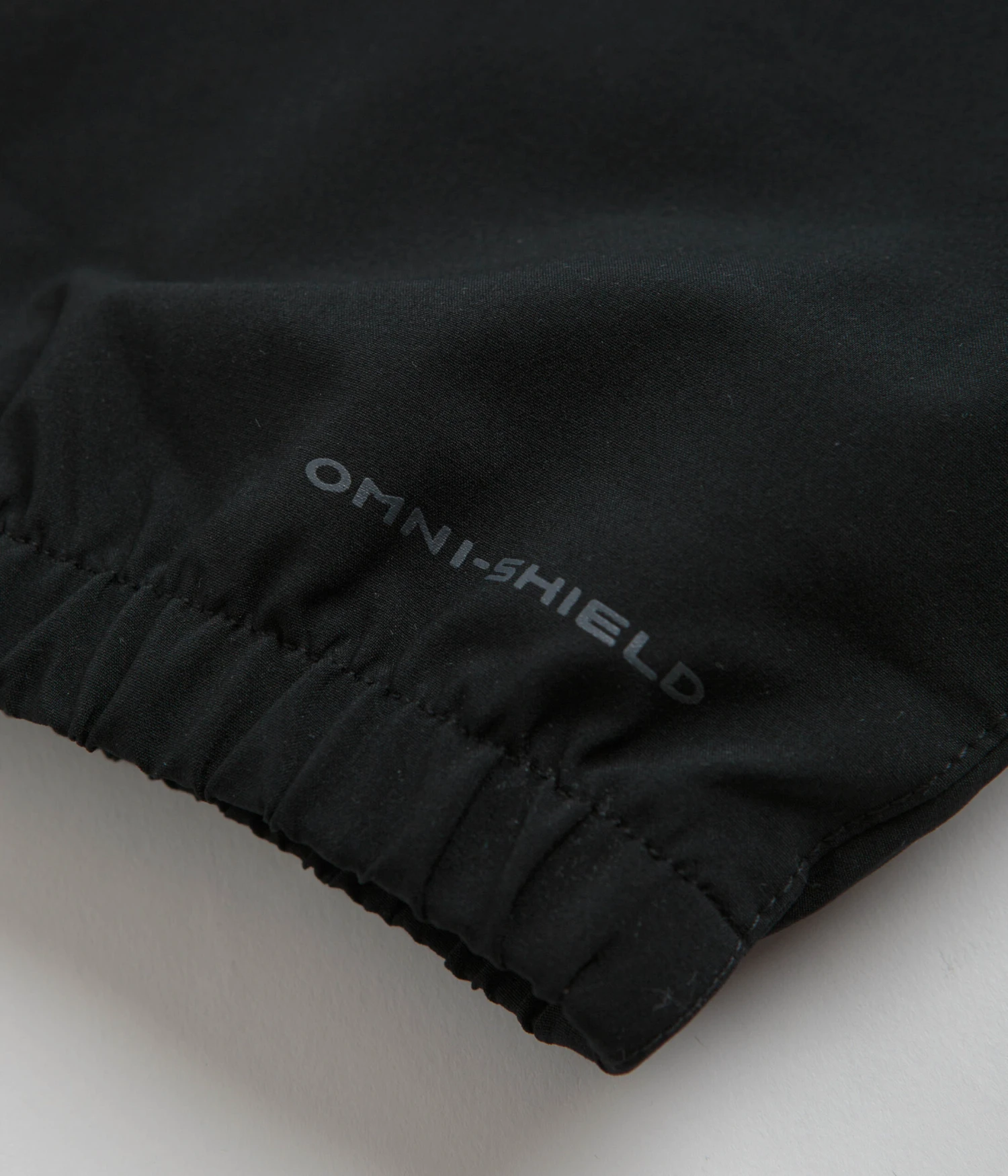 Columbia Hike Joggers in Black. Made from a stretchy polyester-elastane blend, these tapered leg Columbia joggers are tailored to a regular fitting. Featuring Omni-Shieldâ„¢ Advanced repellency with an elasticated drawstring waist and rib knit cuffs, these black Columbia pants are finished with two side pockets, a rear snap pocket and printed Columbia branding.