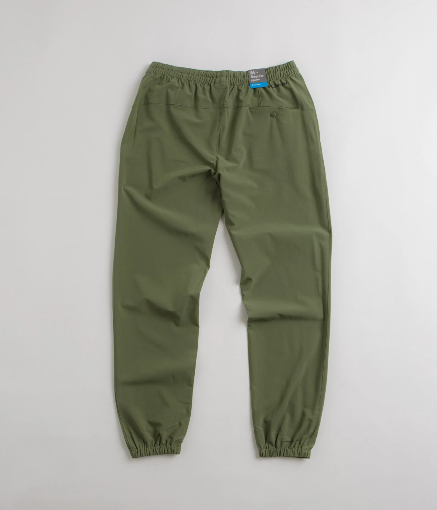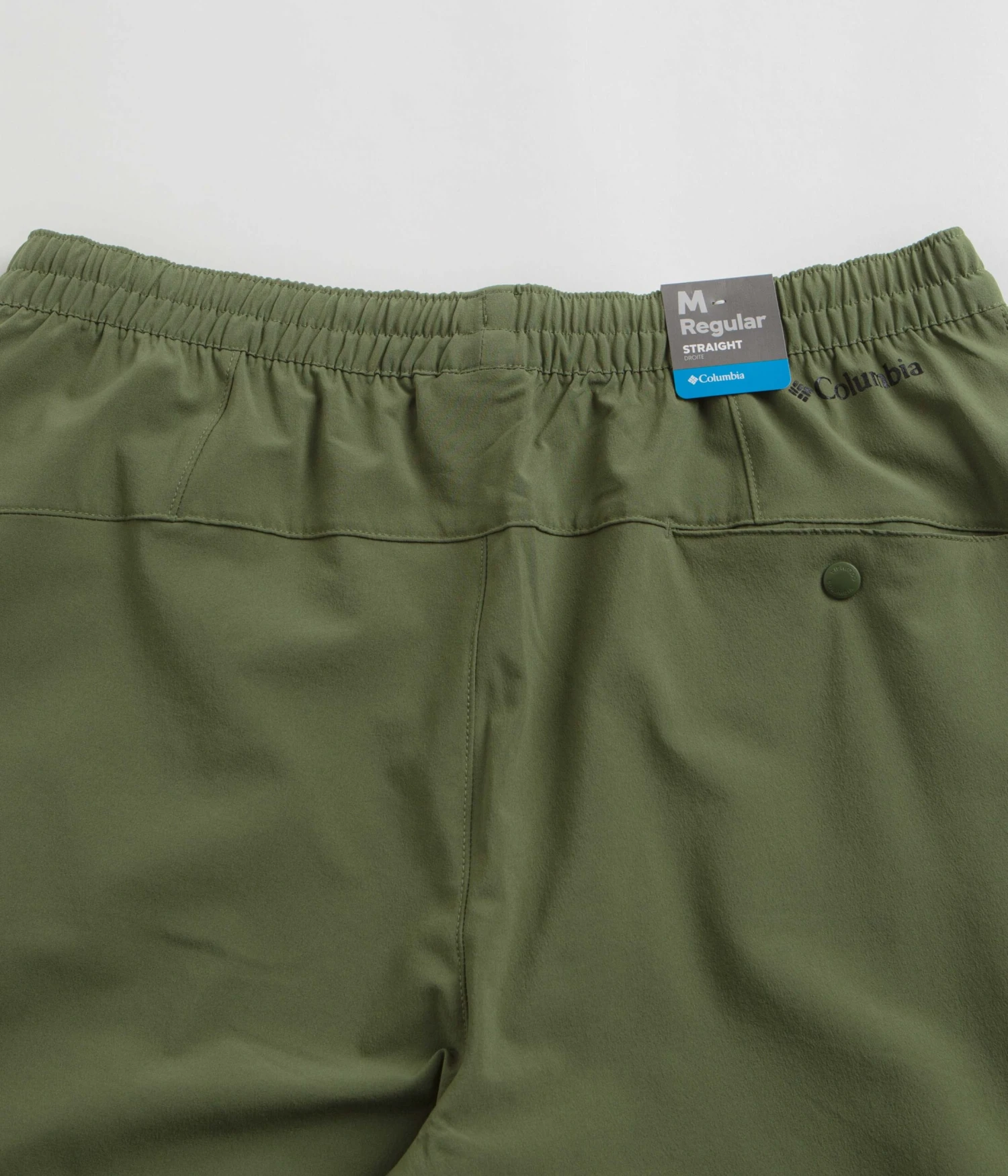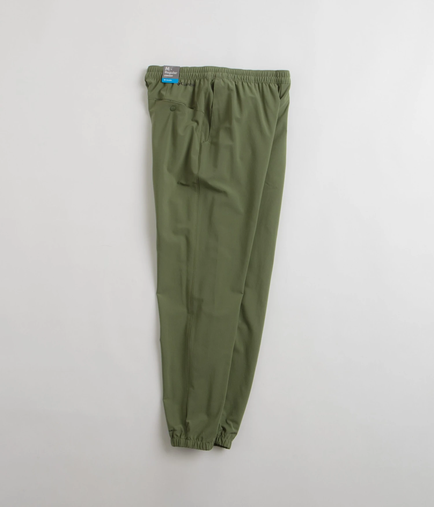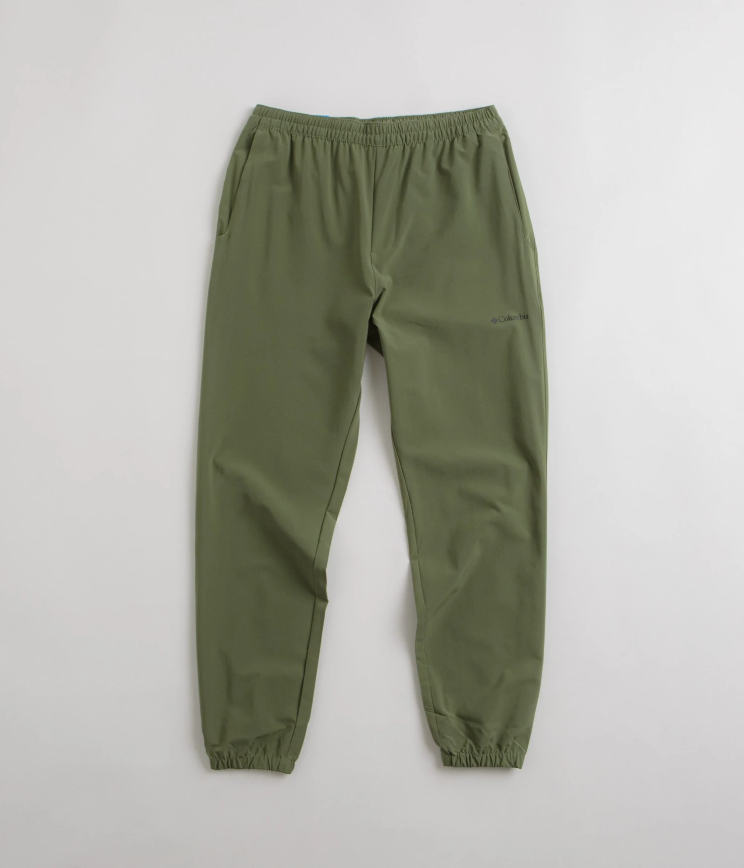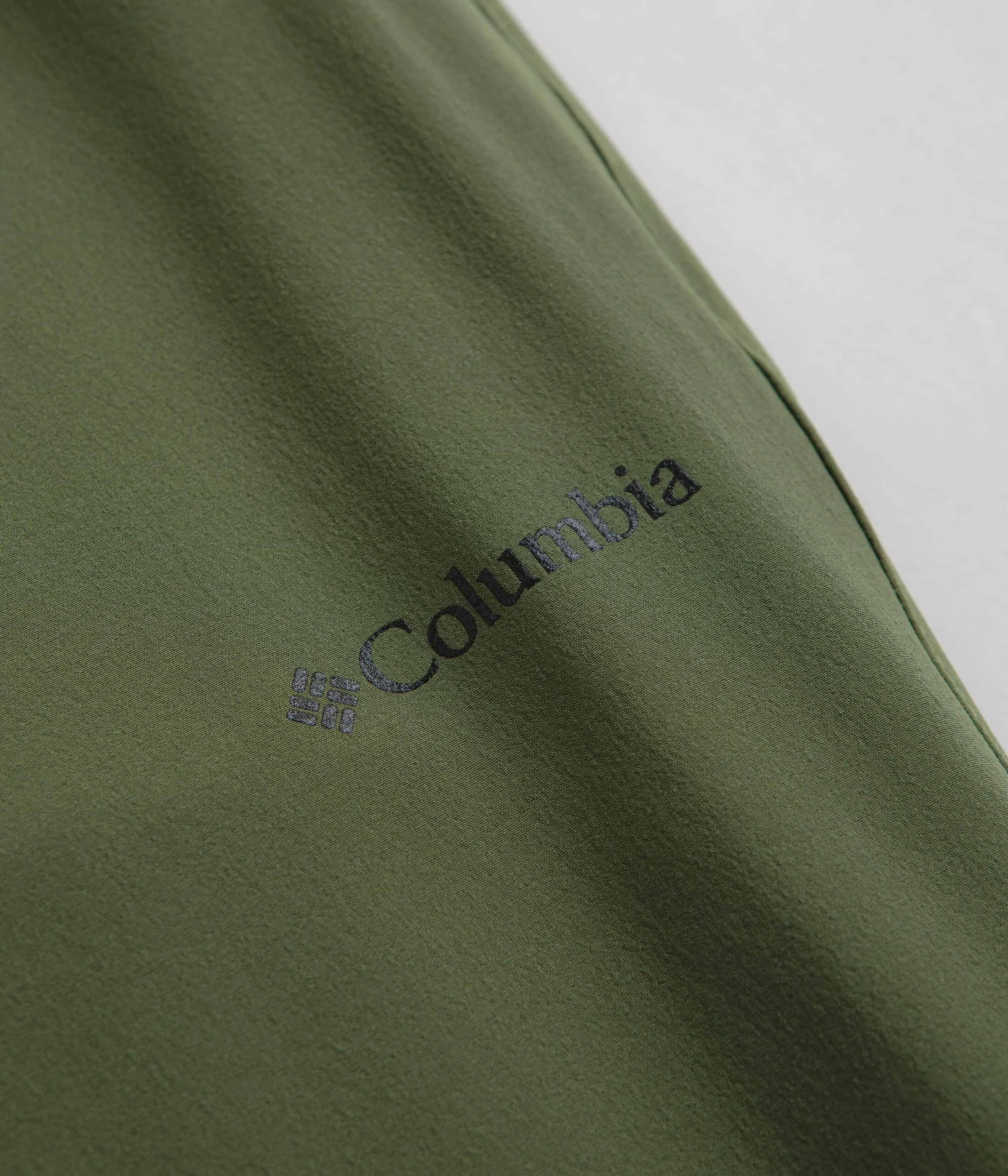 Columbia Hike Joggers in Canteen. Designed with a tapered leg and a regular fit, these Columbia joggers are made from a polyester-elastane blend. Stretch woven with an elasticated waist and Omni-Shieldâ„¢ technology, these green Columbia joggers are finished with ribbed cuffs, two front pockets, a rear pocket and with printed logo branding.
