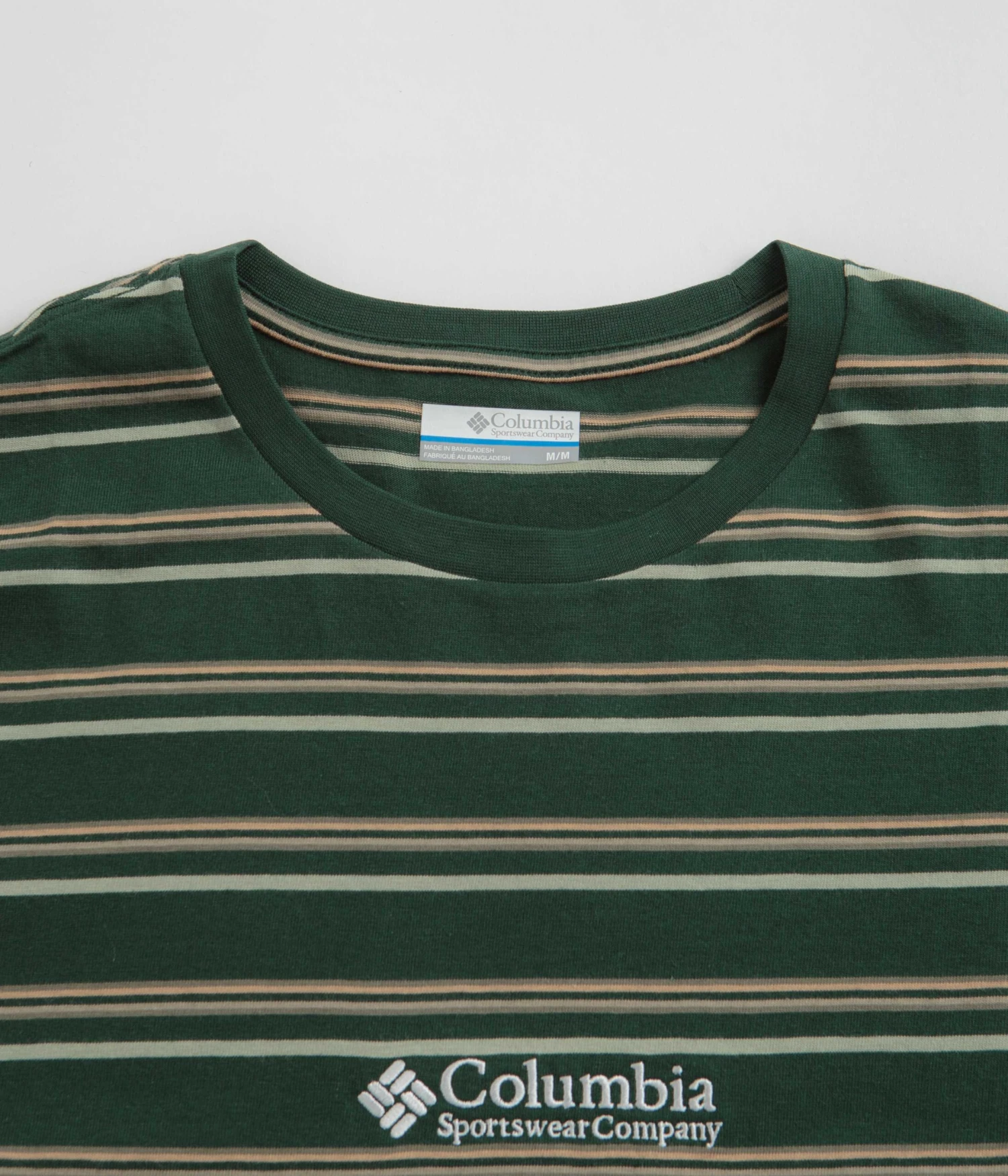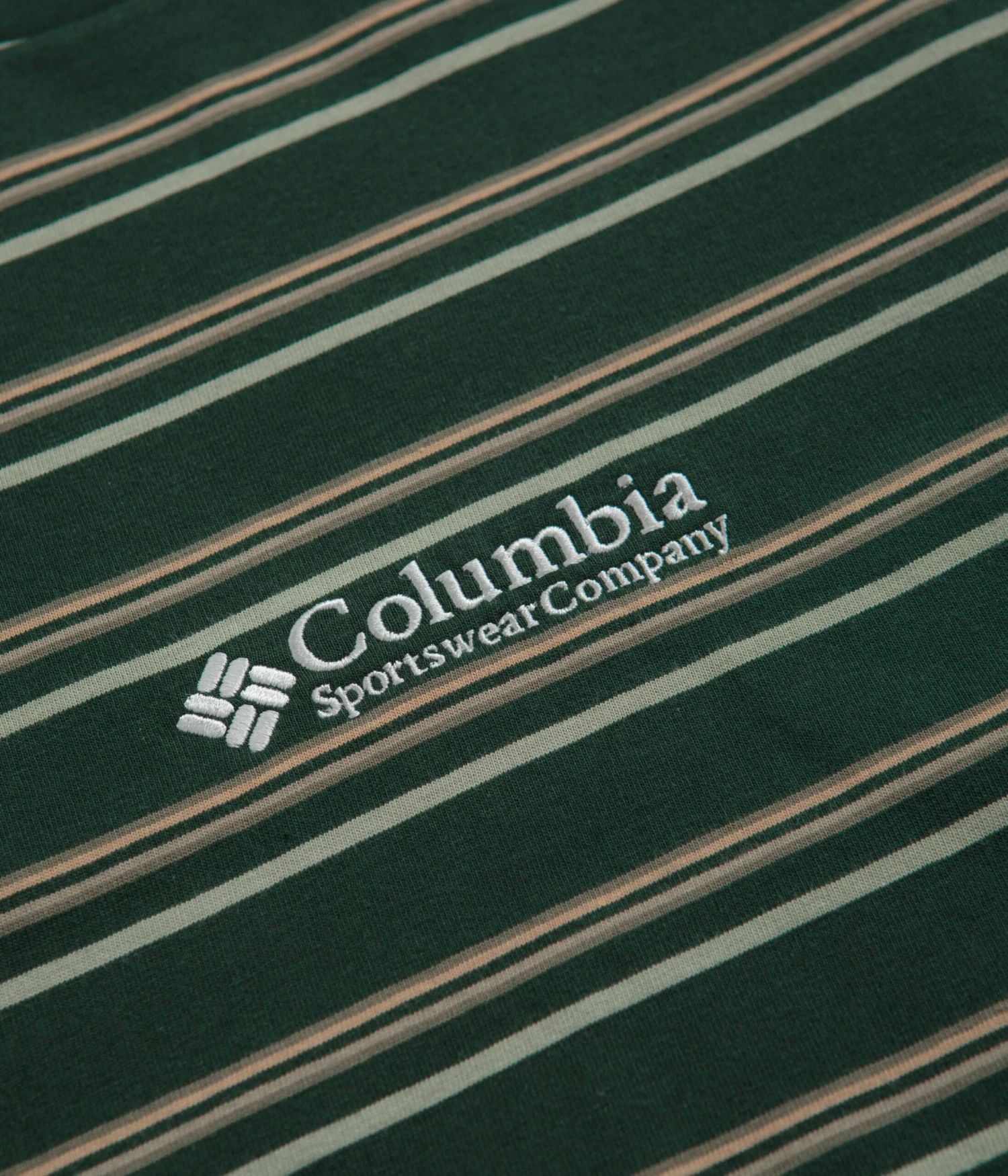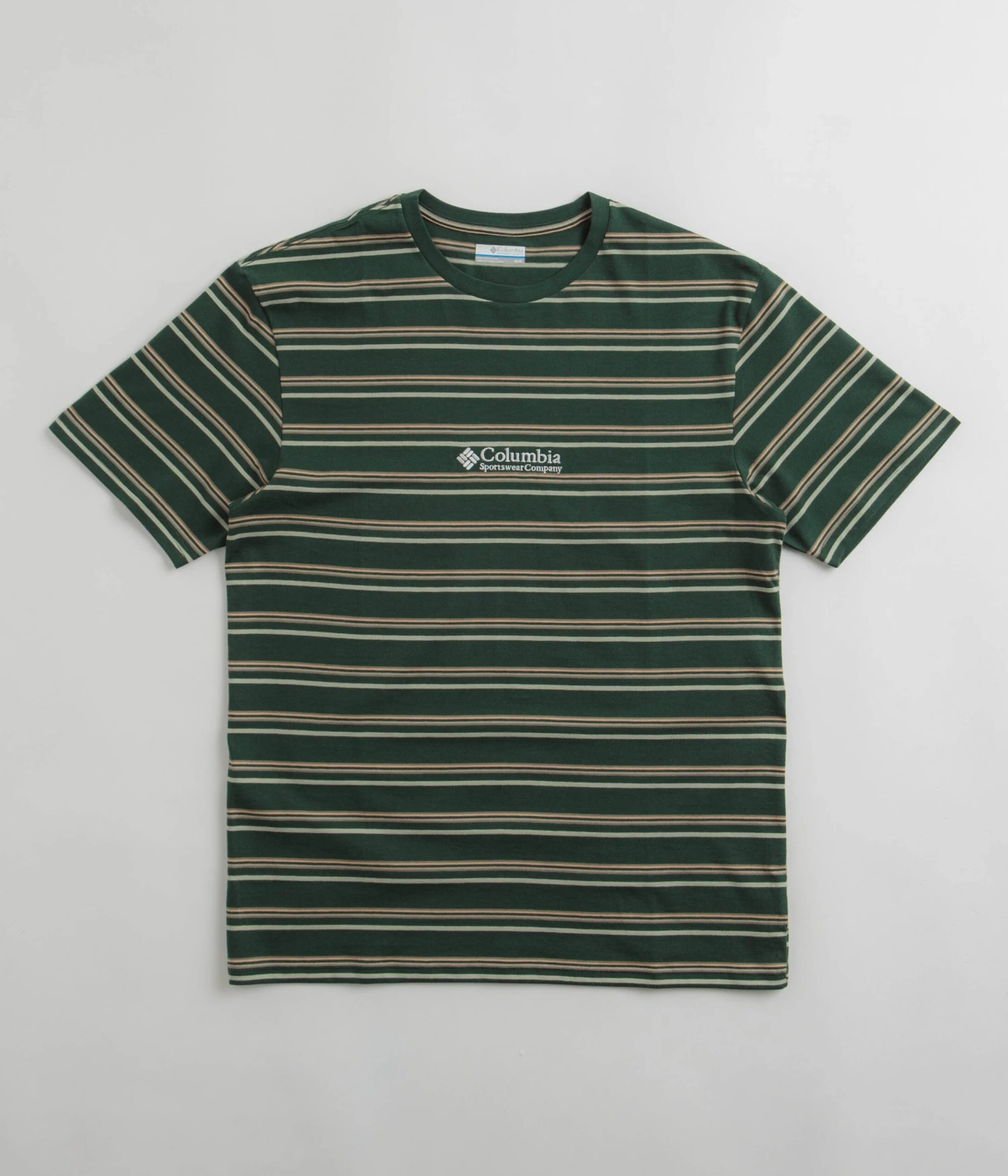 Columbia Somer Slope Striped T-Shirt in Spruce. Made from 100% cotton, this striped Columbia t-shirt is designed with a classic crew collar and a reinforced hem. Finished in a shade of green and beige with an embroidered Columbia centre chest logo.