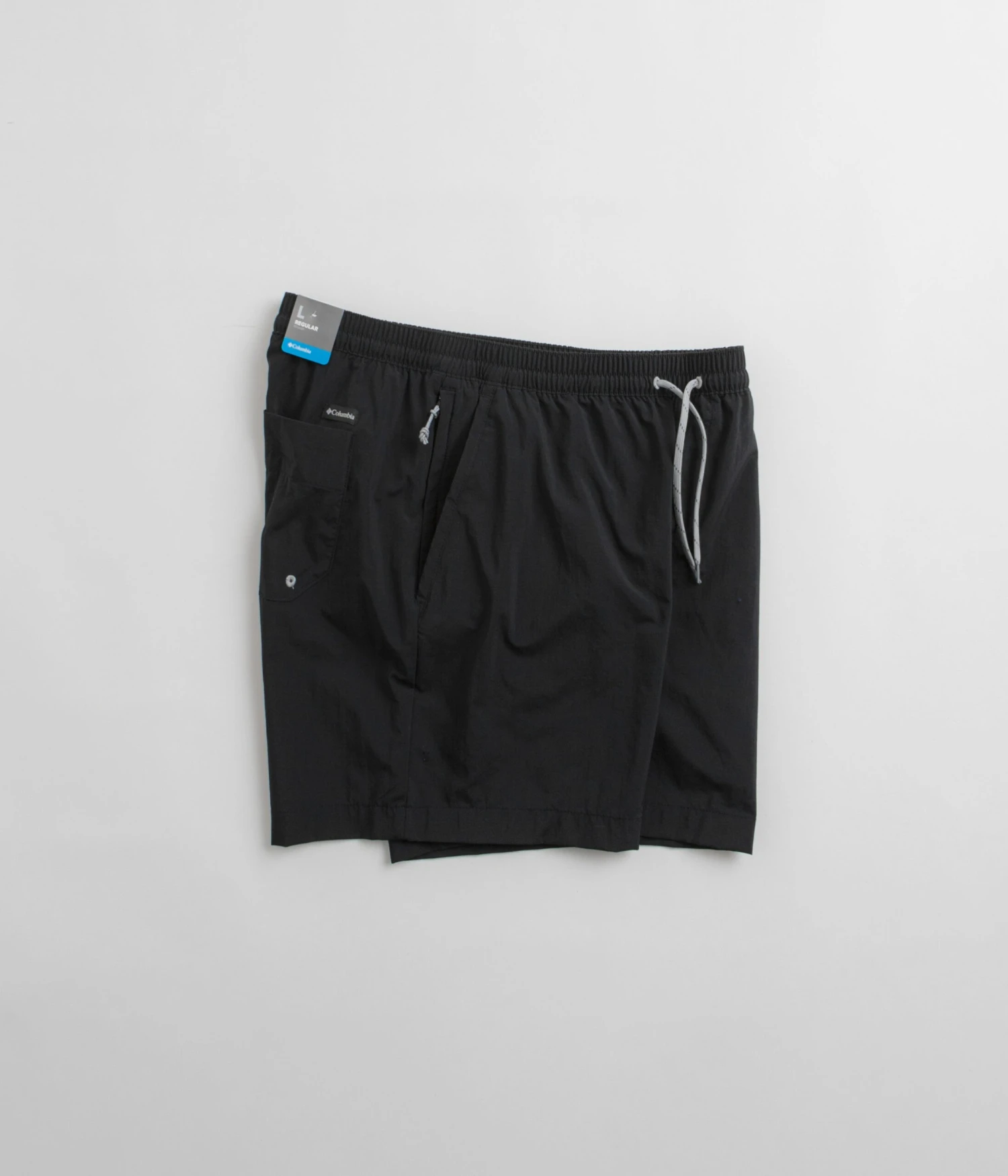 Columbia Summerdry 6″ Shorts in Black. Made from 100% nylon with an interior mesh brief, these Columbia shorts are designed with a 6” inseam and a woven elastic waist. Featuring a drawstring fastening, Omni-Shield™ technology, two side pockets and a single rear pocket, these black Columbia shorts are finished with a zippered security pocket and with woven flag label branding.
