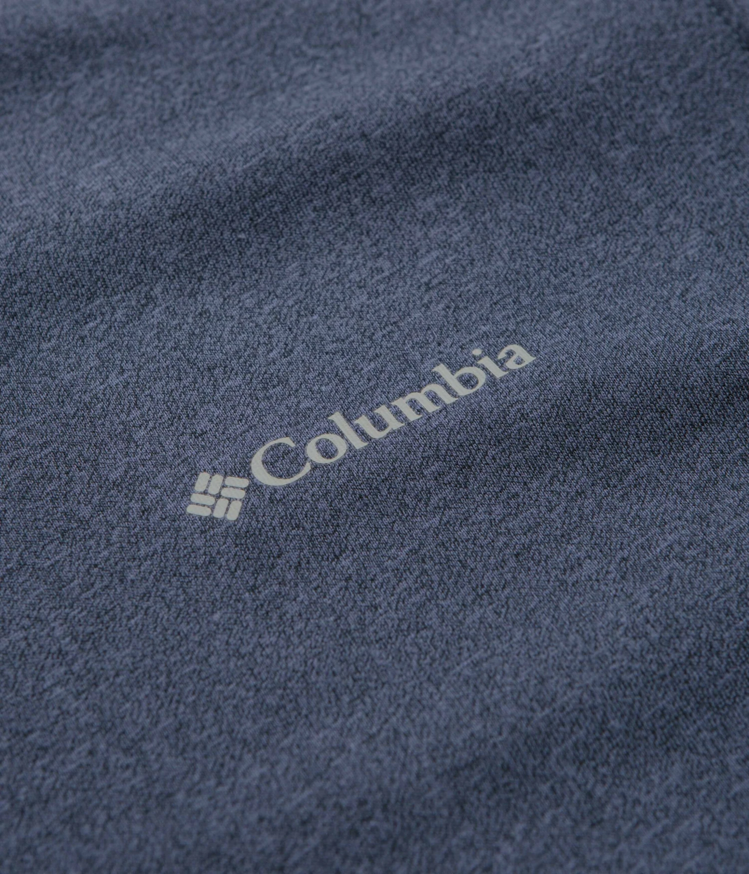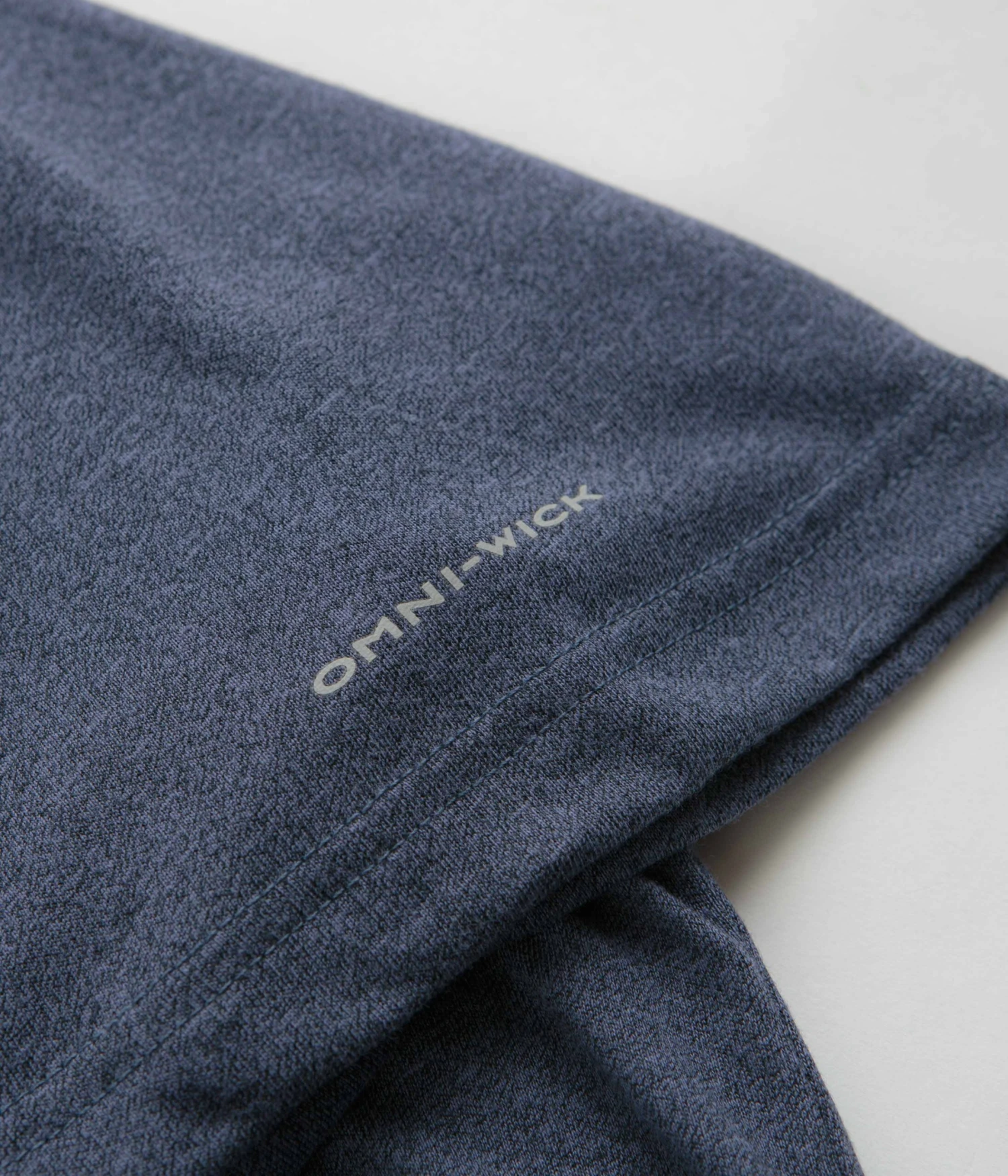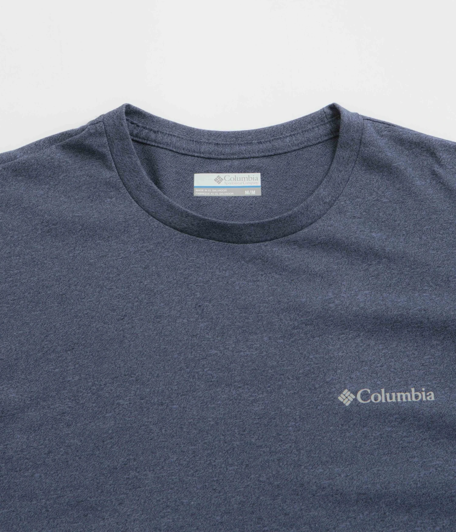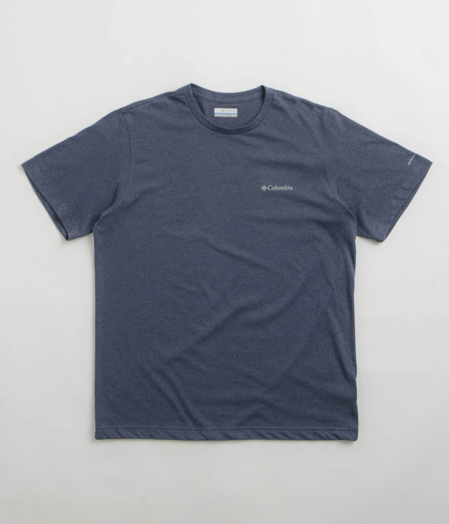 Columbia Thistletown Hills T-Shirt in Dark Mountain Heather. Regular fitting and designed with Omni-Wickâ„¢ technology, this Columbia t-shirt is made from a cotton and recycled polyester blend. Featuring a flexible rib knit collar and a straight cut hem, this navy heather Columbia t-shirt is finished with a printed left chest logo.