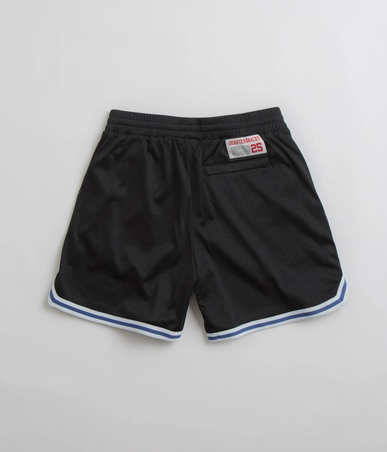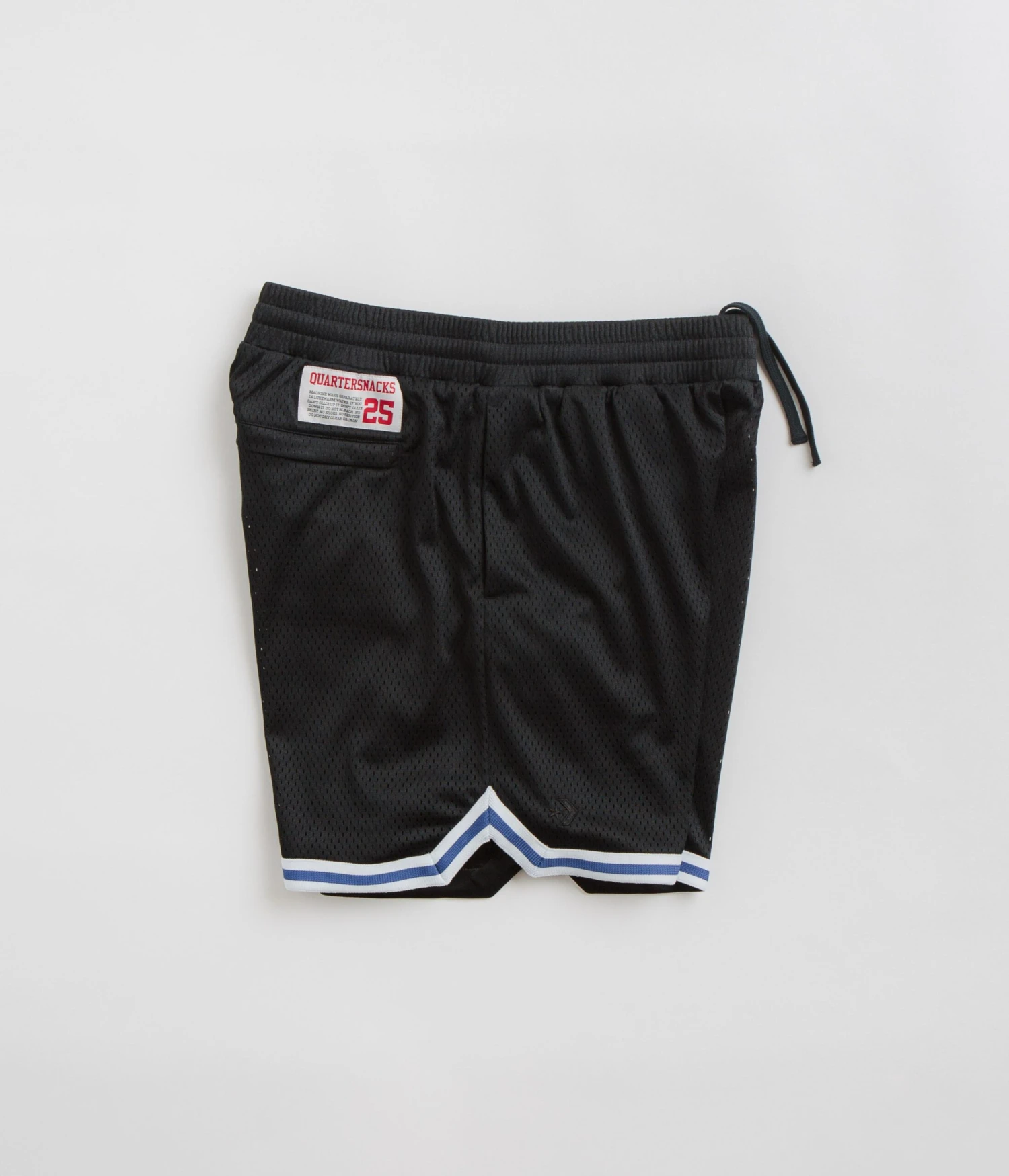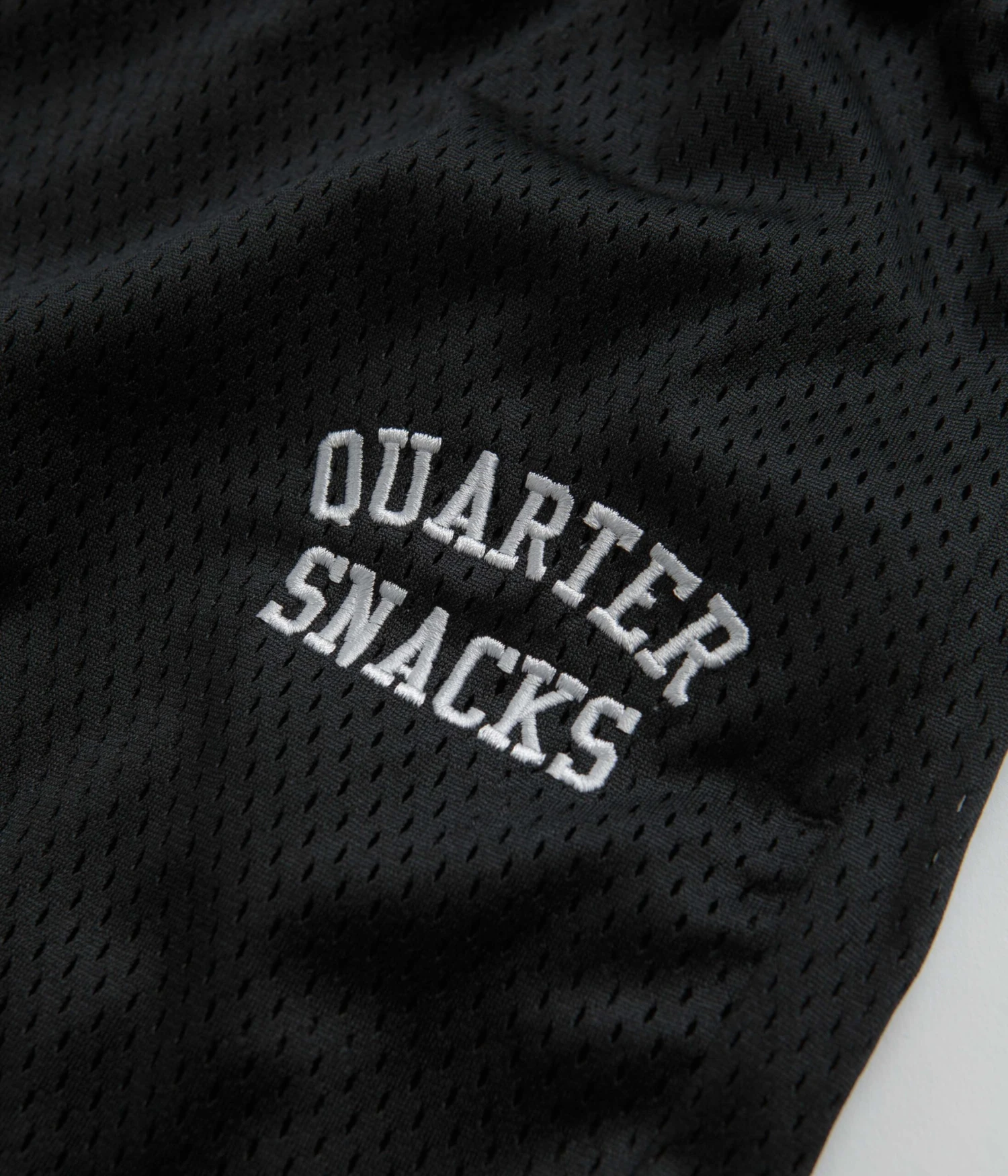 Converse x Quartersnacks Shorts in Converse Black. Cut to an above-knee length, these Converse x Quartersnacks shorts are made from 100% polyester mesh with a satin lined inner. Featuring an elasticated waistband and jacquard taping, these black Converse shorts are finished with two zippered side pockets, a zipped rear pockets, a woven label and with embroidered branding.