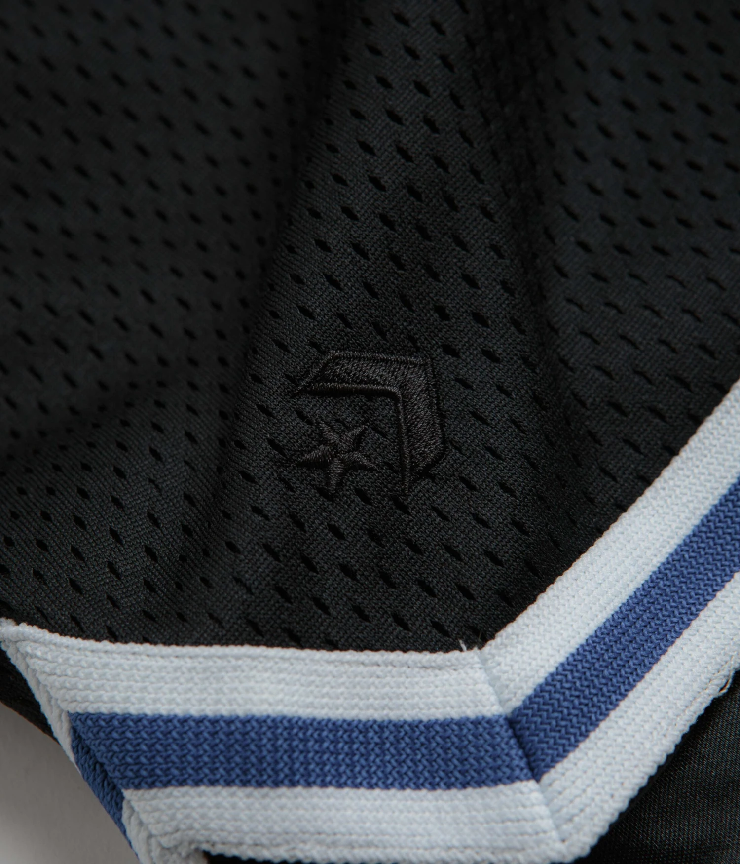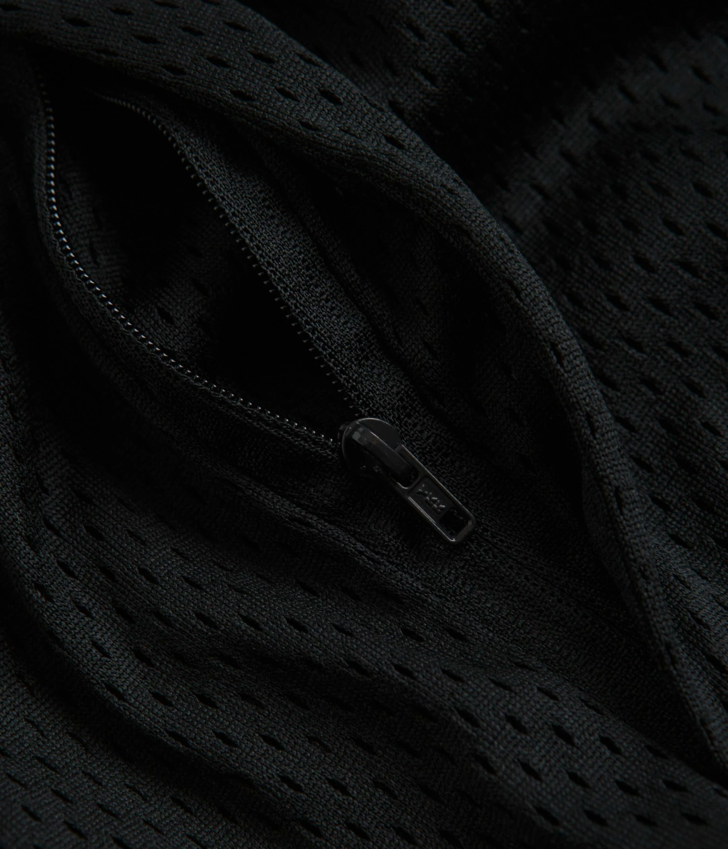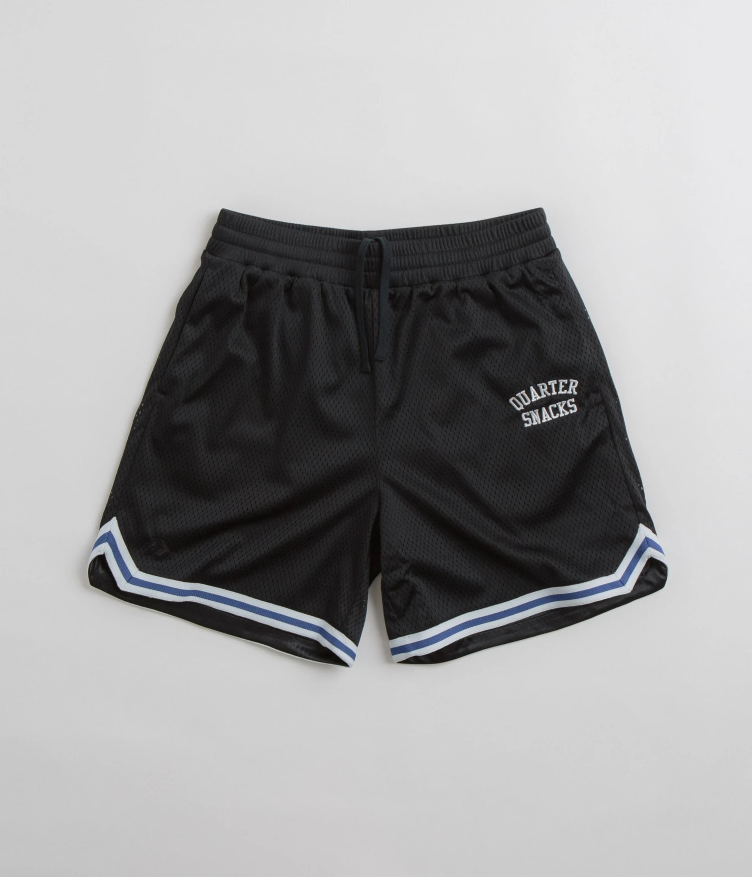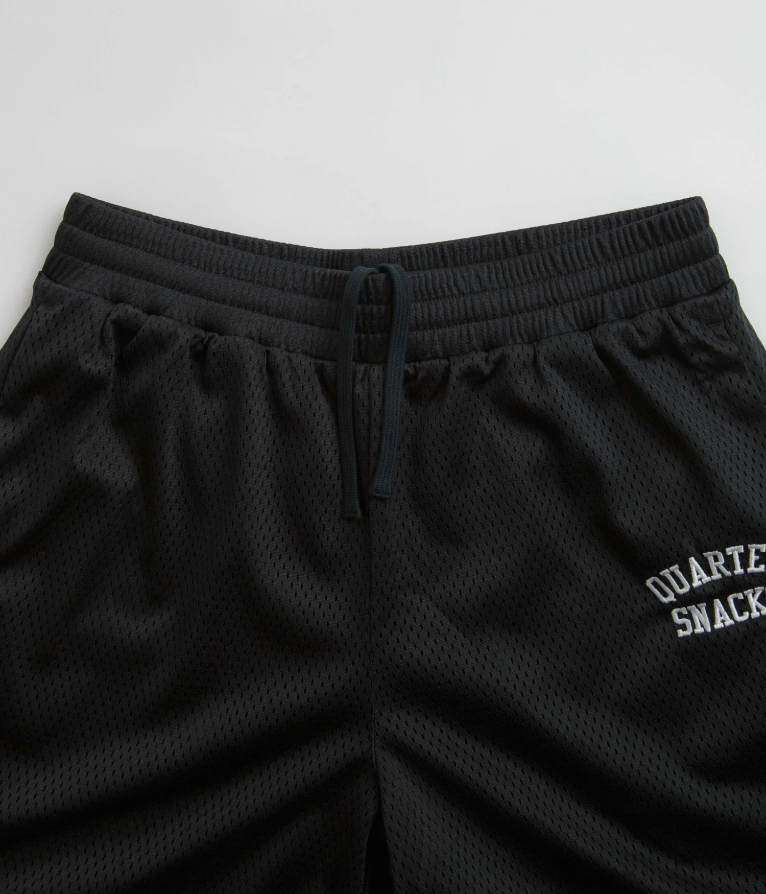 Converse x Quartersnacks Shorts in Converse Black. Cut to an above-knee length, these Converse x Quartersnacks shorts are made from 100% polyester mesh with a satin lined inner. Featuring an elasticated waistband and jacquard taping, these black Converse shorts are finished with two zippered side pockets, a zipped rear pockets, a woven label and with embroidered branding.