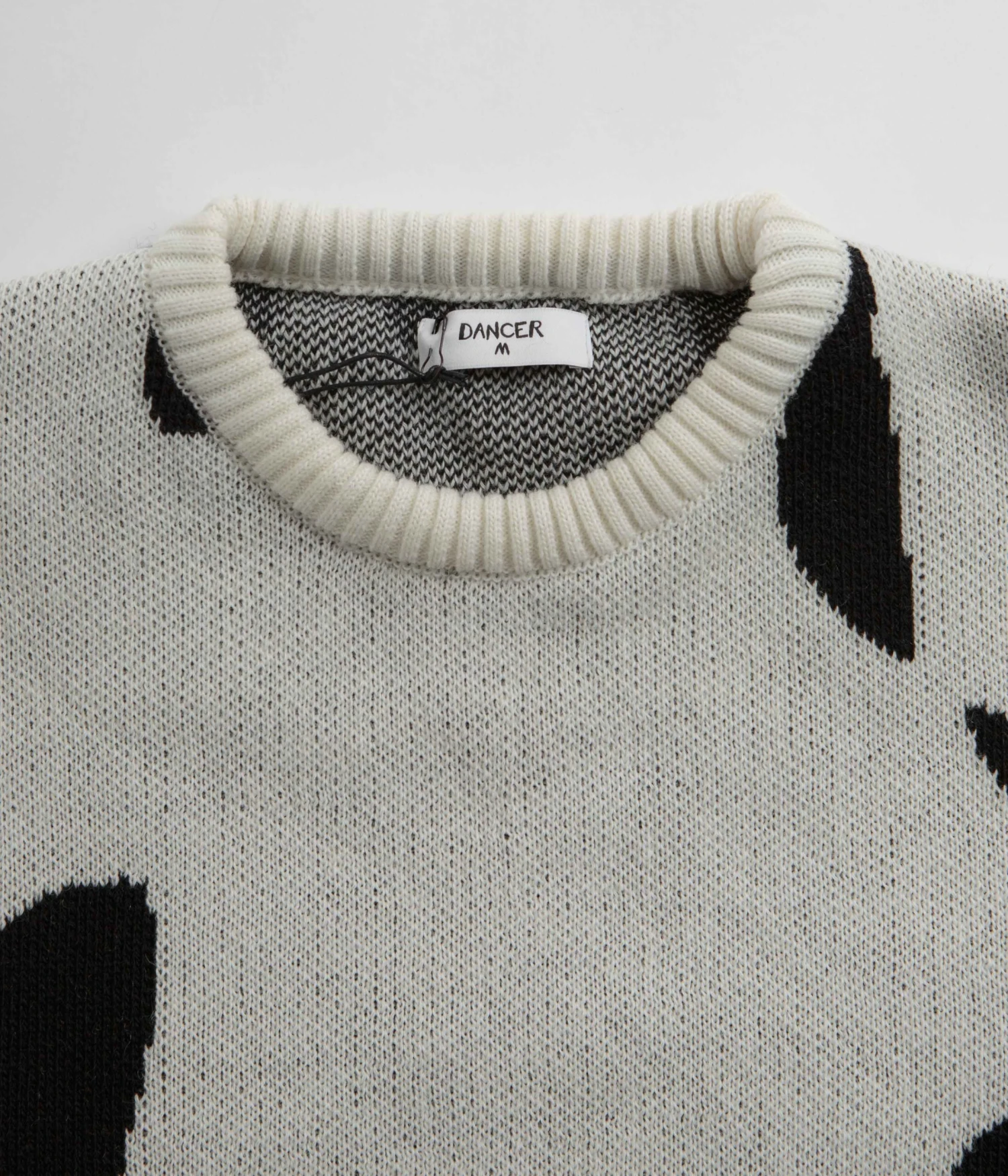 Dancer Mask Knit Sweatshirt in White. Regular fitting and made from a wool-polyester blend, this regular fitting Dancer sweatshirt is styled with an intarsia knit design. Featuring a thick rib collar, this white Dancer sweater is finished with black patches, ribbed cuffs and with a woven elastic hem.