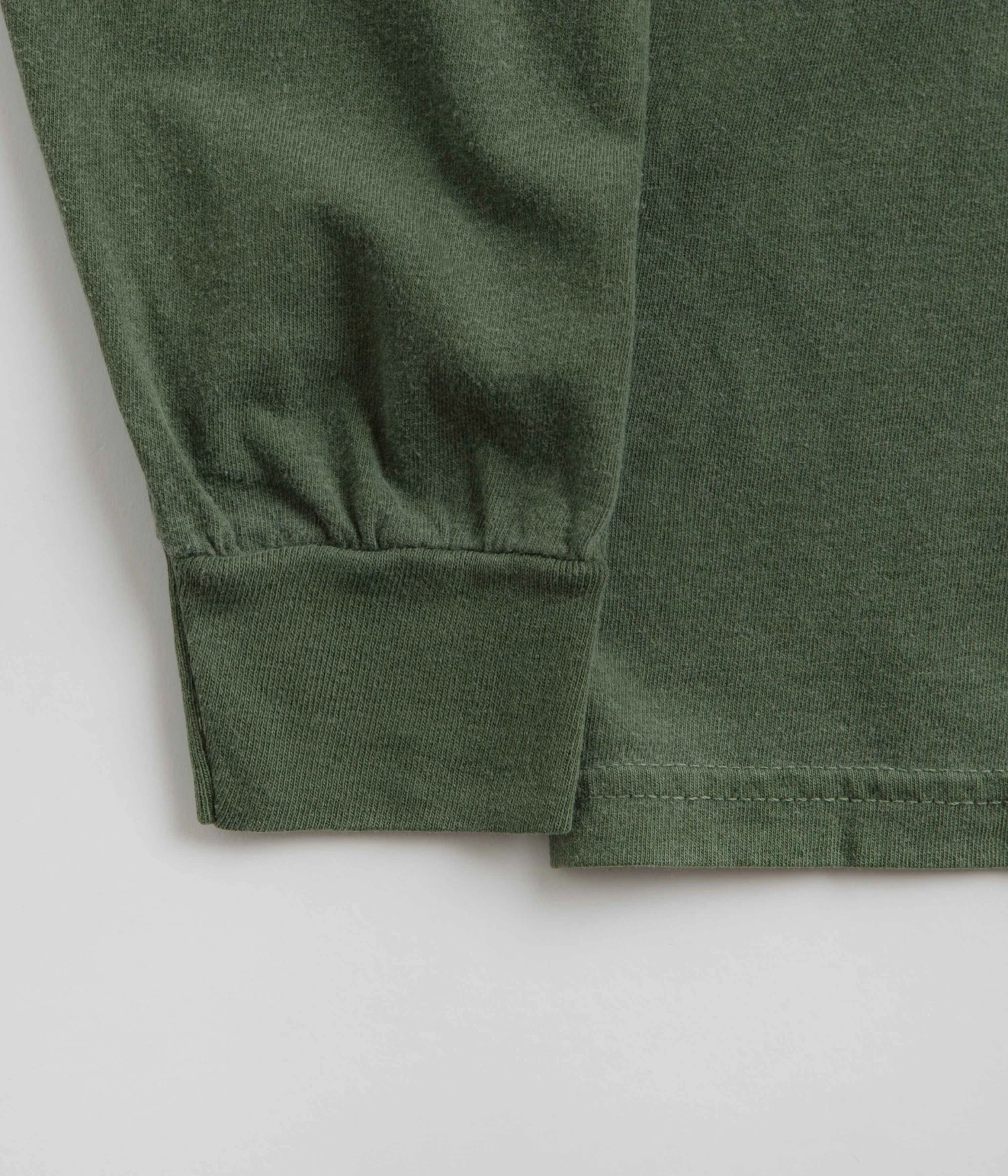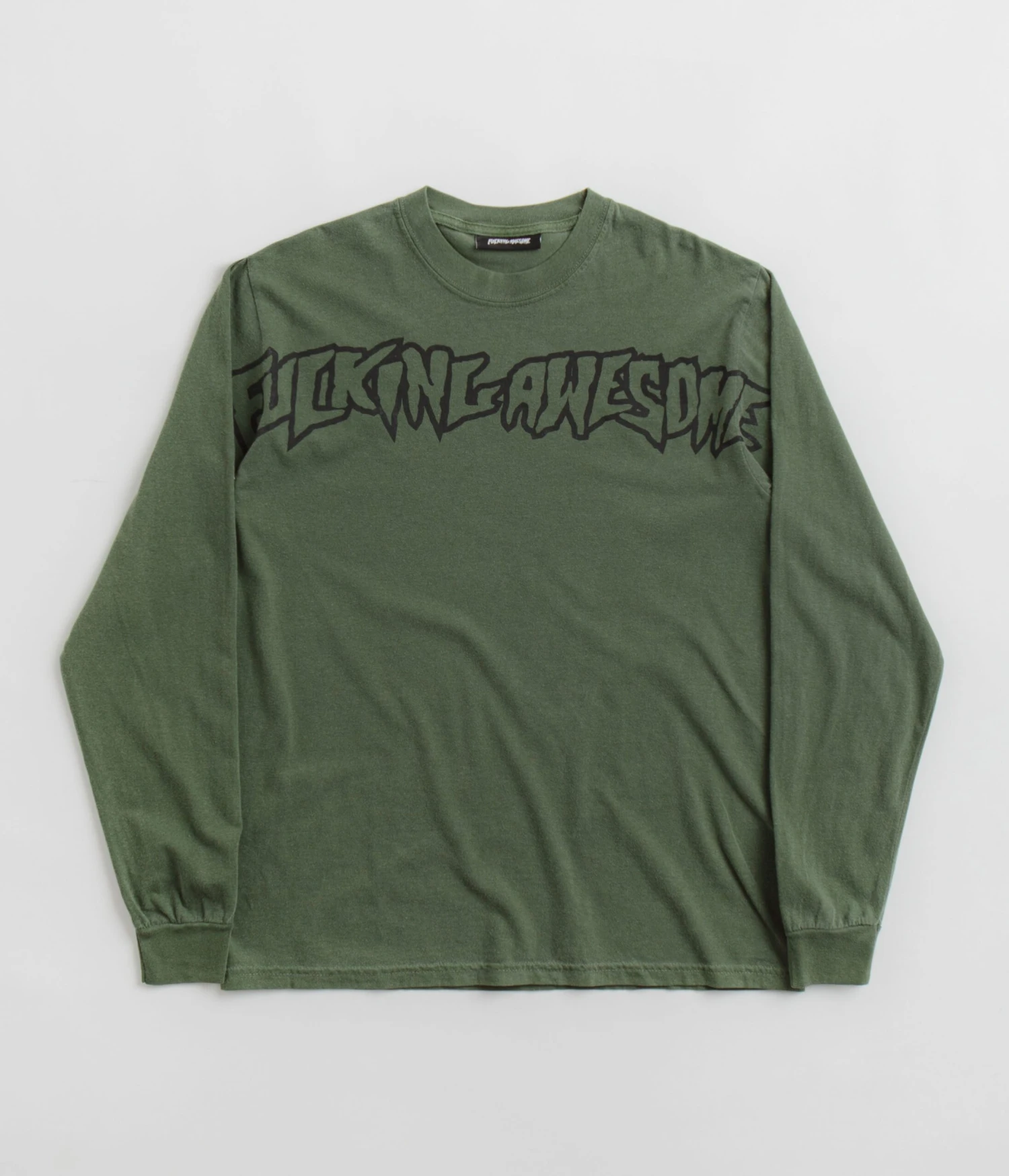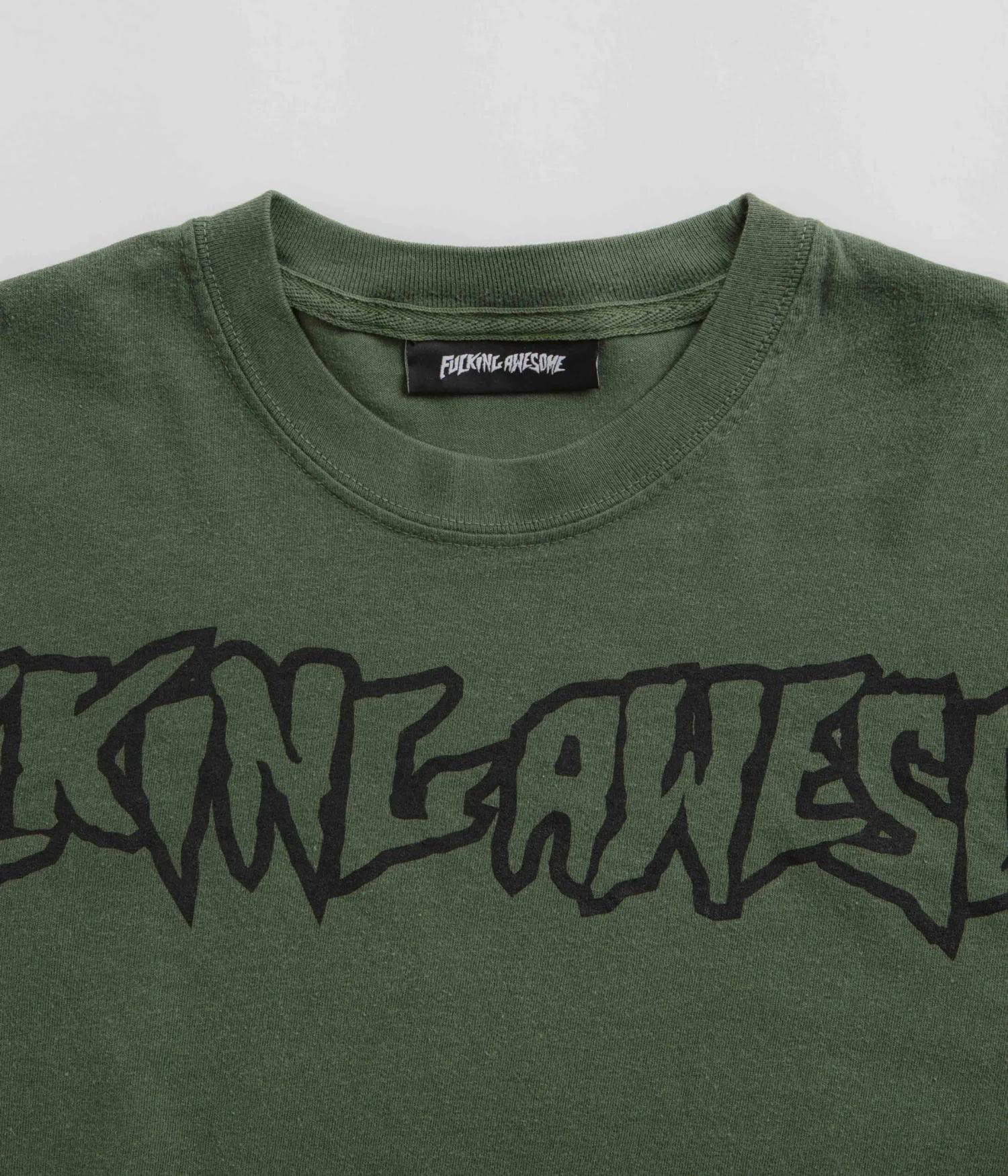 Fucking Awesome Big Stamp Long Sleeve T-Shirt in Hemp. Regular fitting and made from 100% cotton, this Fucking Awesome t-shirt is designed with a classic crew collar and with ribbed cuffs. Finished in a shade of khaki green with a printed cross-shoulder chest graphic.