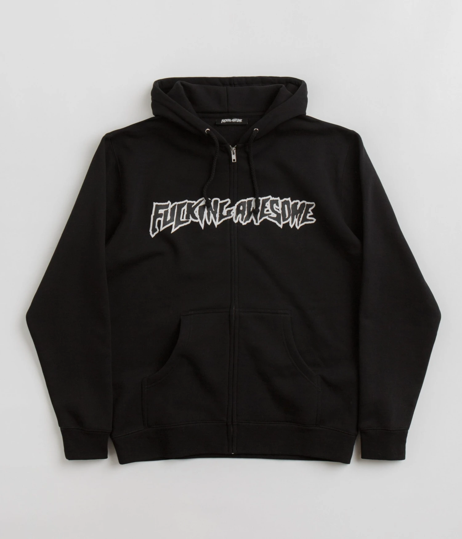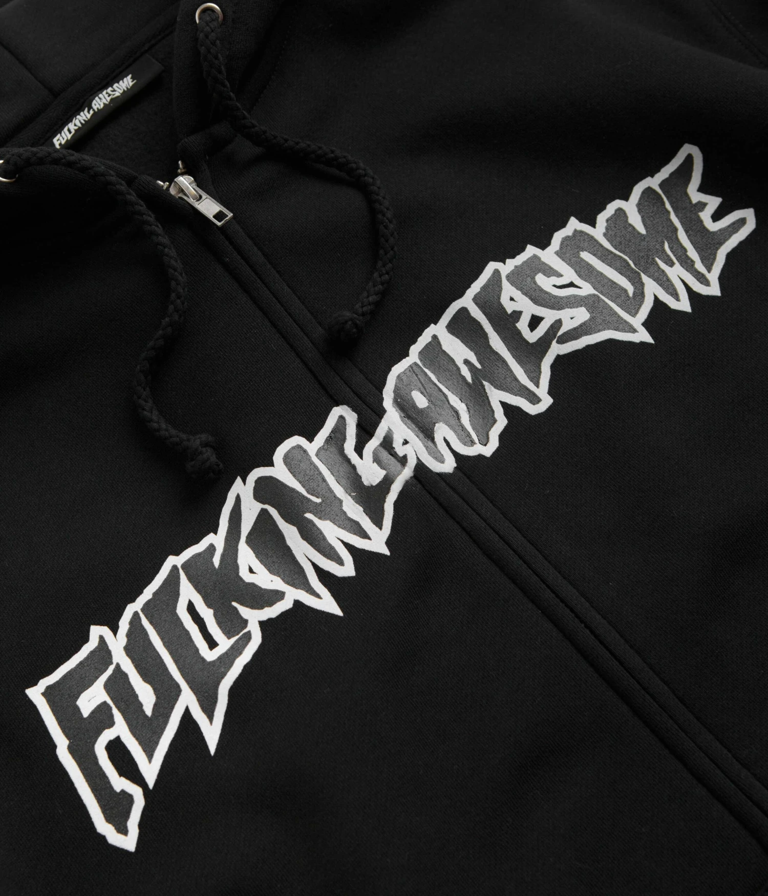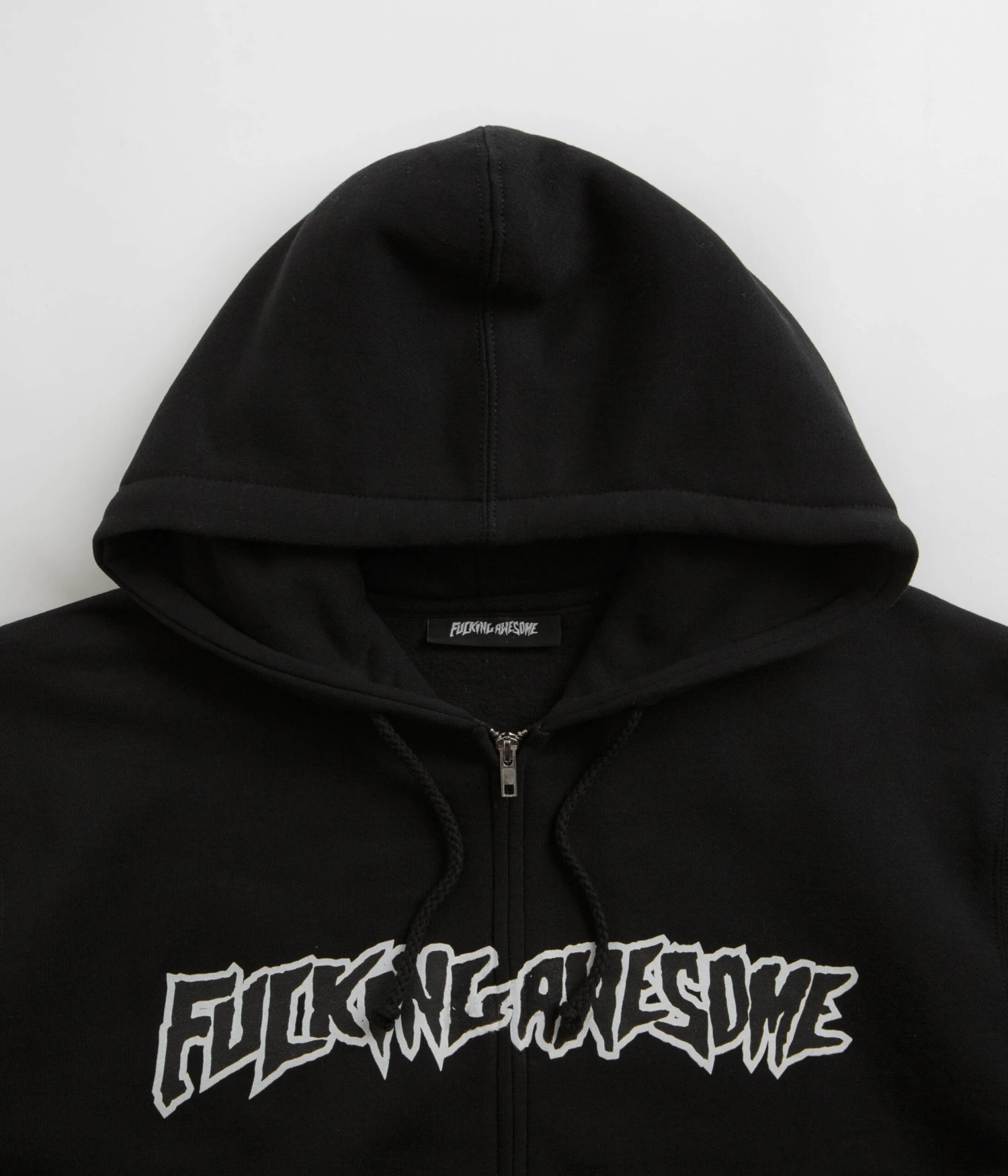 Fucking Awesome Stamp Logo Zip Hoodie in Black. Designed with a full length zipper fastening, this regular fitting Fucking Awesome hoodie is made from a cotton-polyester blend. Featuring a split panel hood, ribbed cuffs and with a woven elastic hem, this black Fucking Awesome hoodie is finished with two front pockets and with a centre chest graphic.