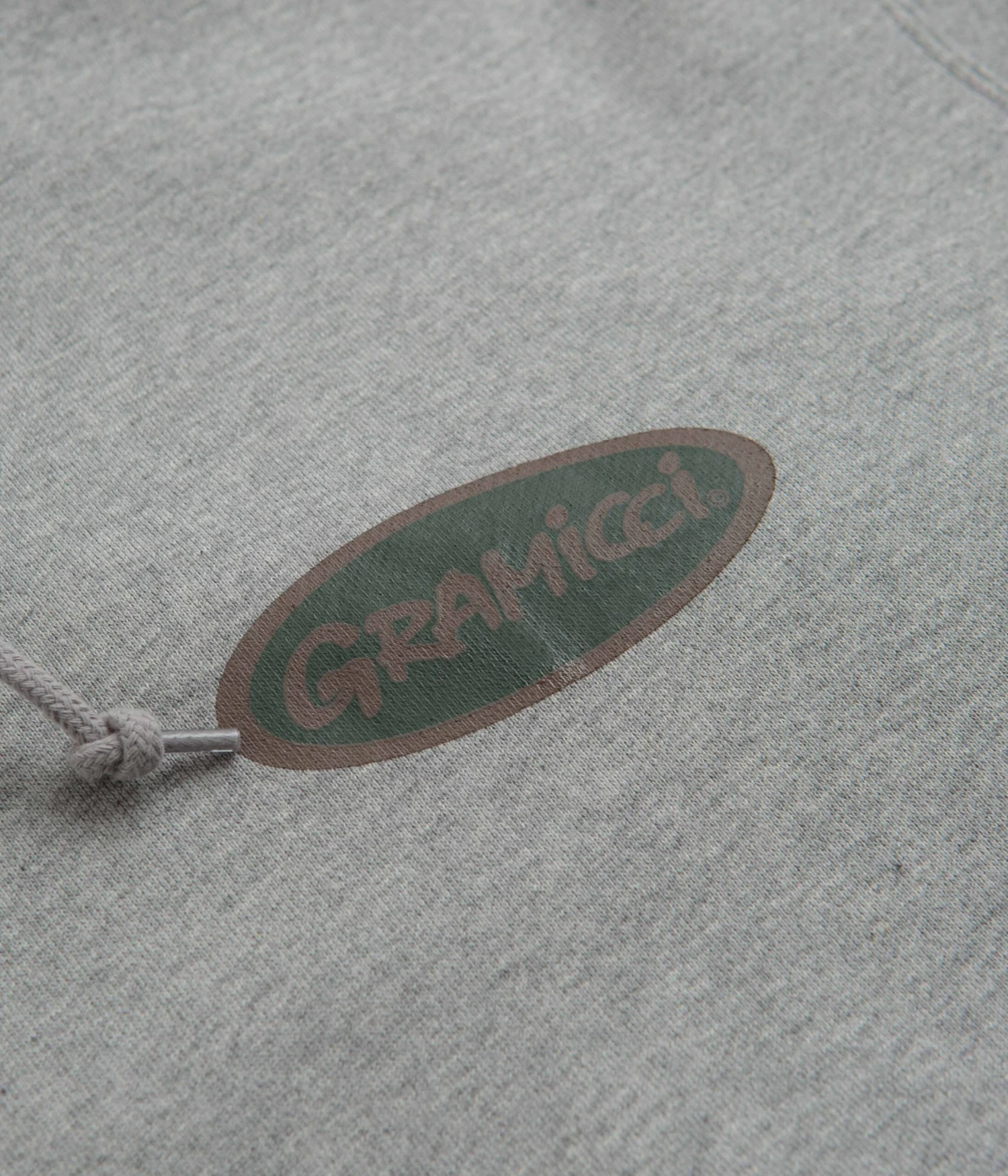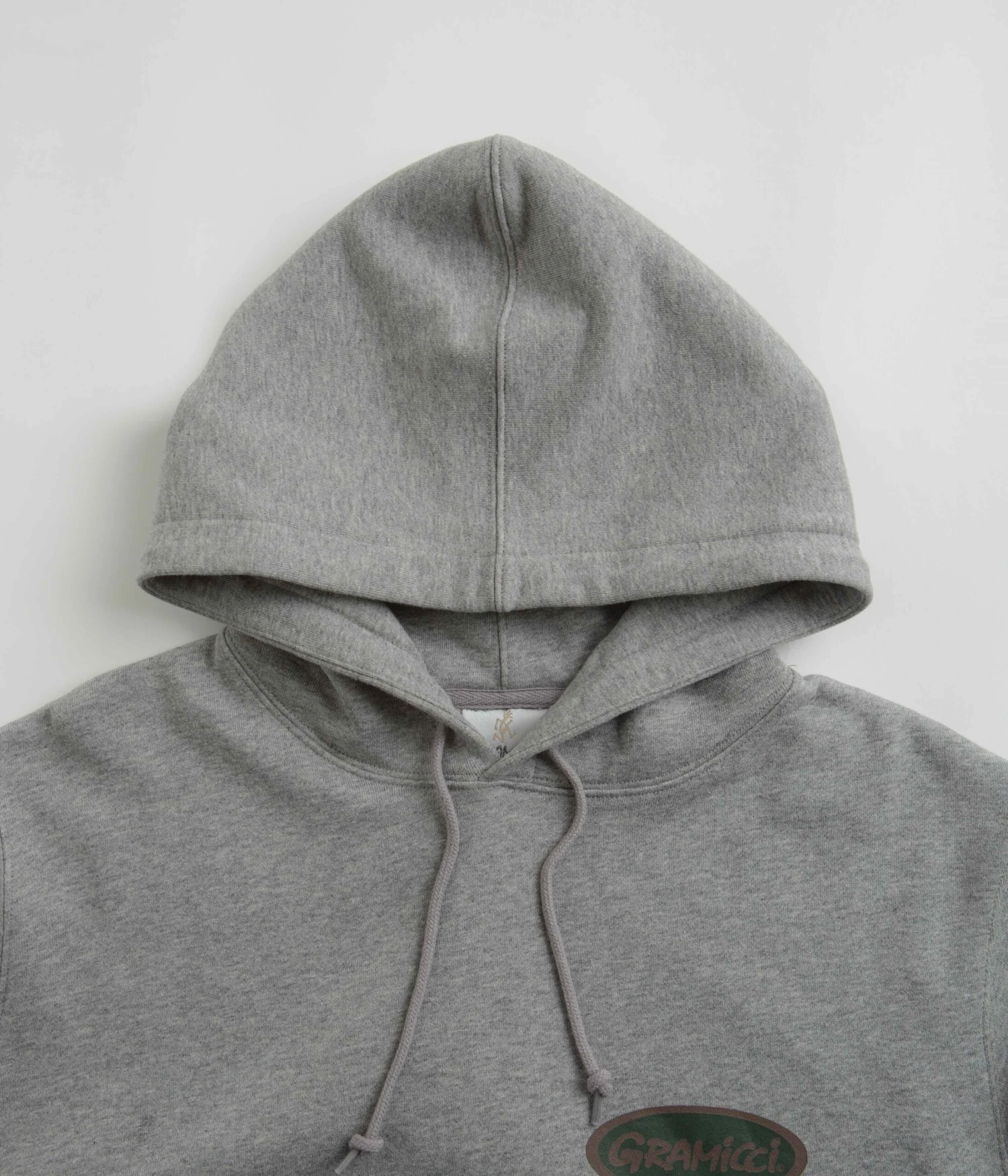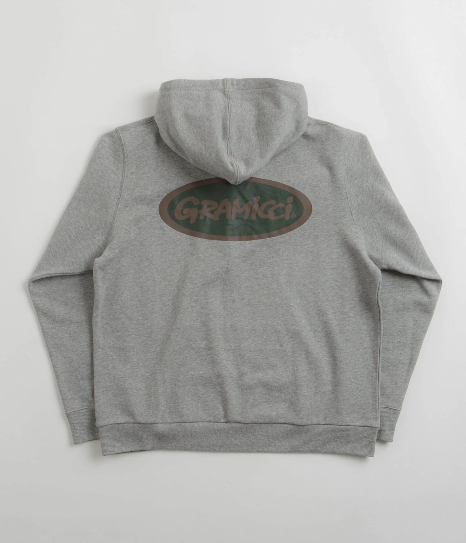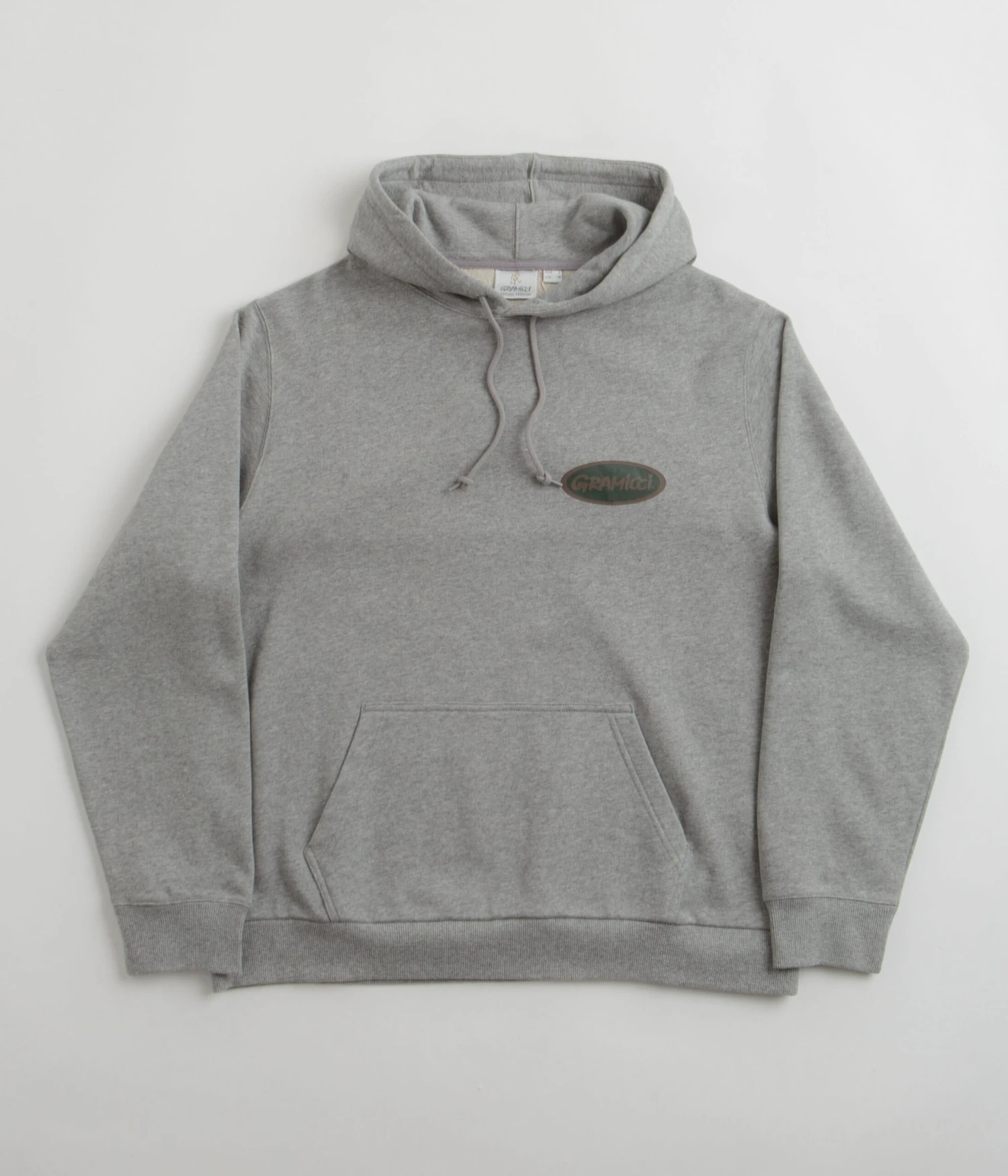 Gramicci Gramicci Oval Hoodie in Heather. Part of the brand’s latest release, this relaxed fitting Gramicci hoodie is styled with unisex sizing. Featuring a drawstring hood, ribbed cuffs and a woven elastic hem, this grey Gramicci hoodie is finished with a kangaroo front pocket and with printed front and rear graphics.