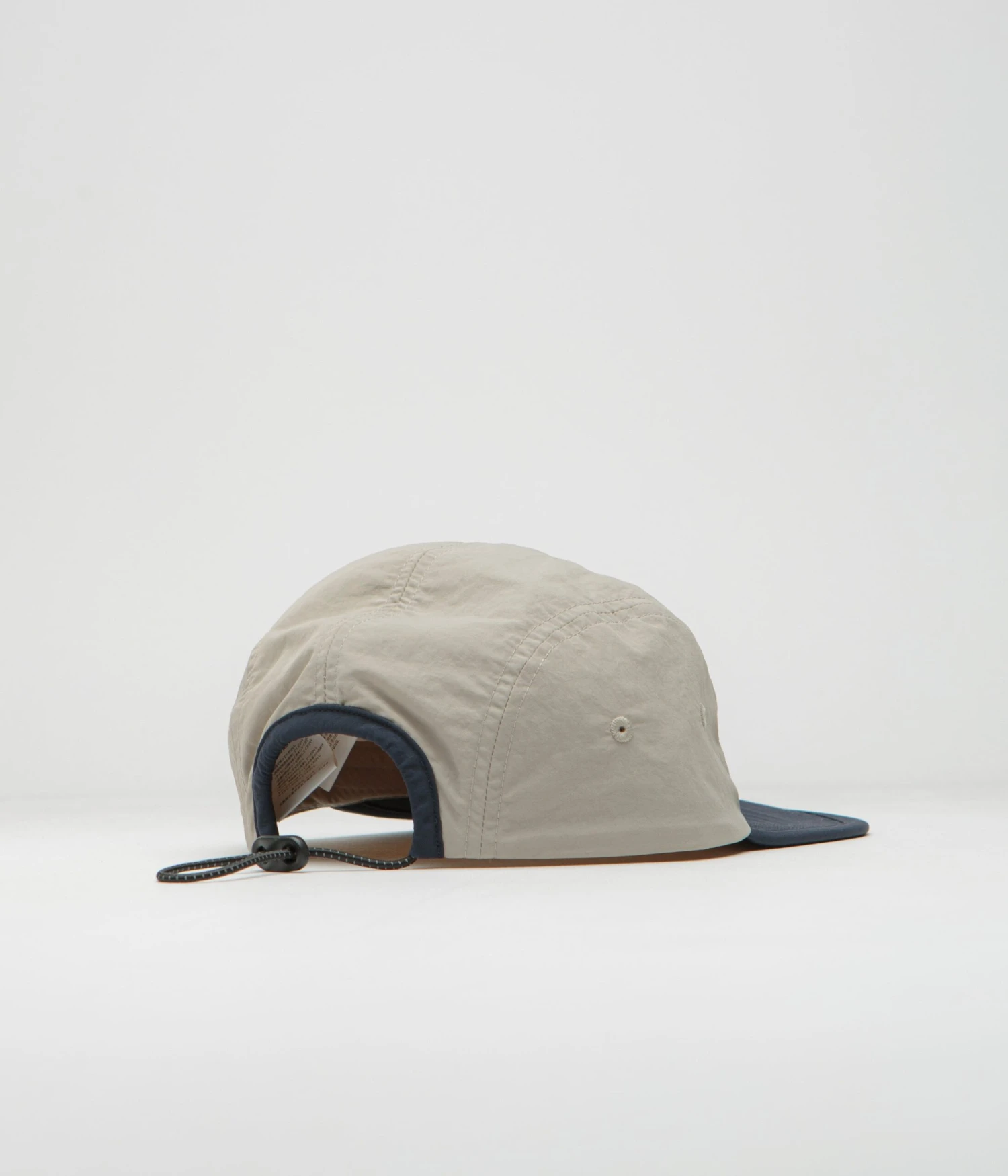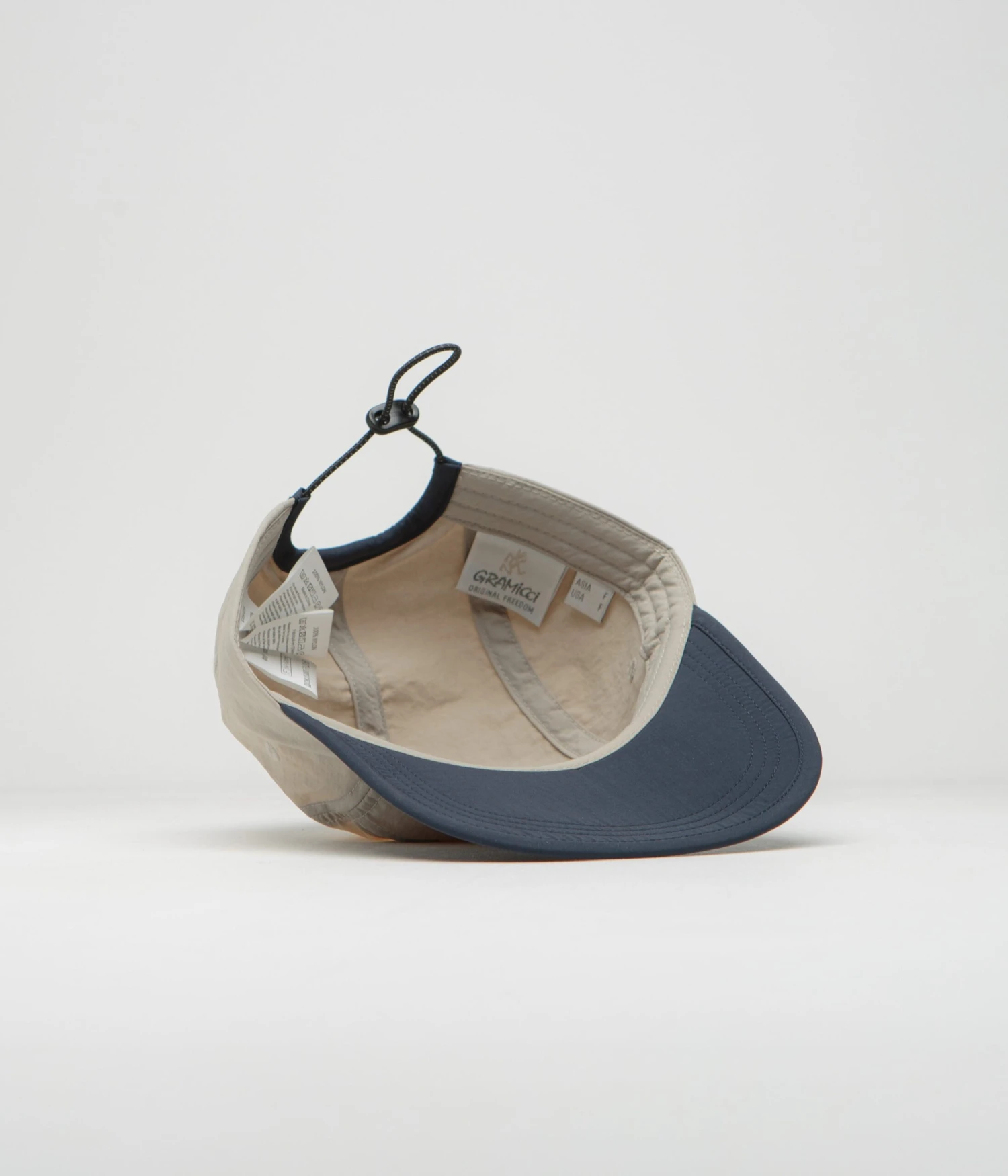 Gramicci Nylon Cap in Sand and Navy. Made from 100%m nylon with a contrasting peak, this Gramicci cap is designed with a five panel profile and enhanced water-repellency. Quick drying with embroidered eyelets and an adjustable toggle-cord rear fastening, this grey blue Gramicci cap is finished with embroidered crown branding.