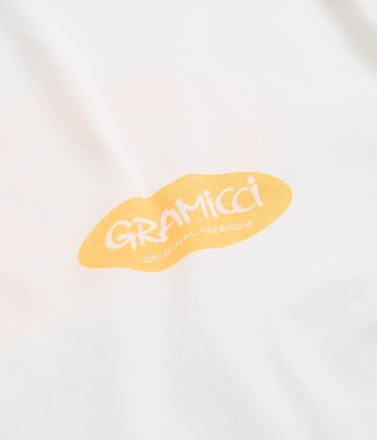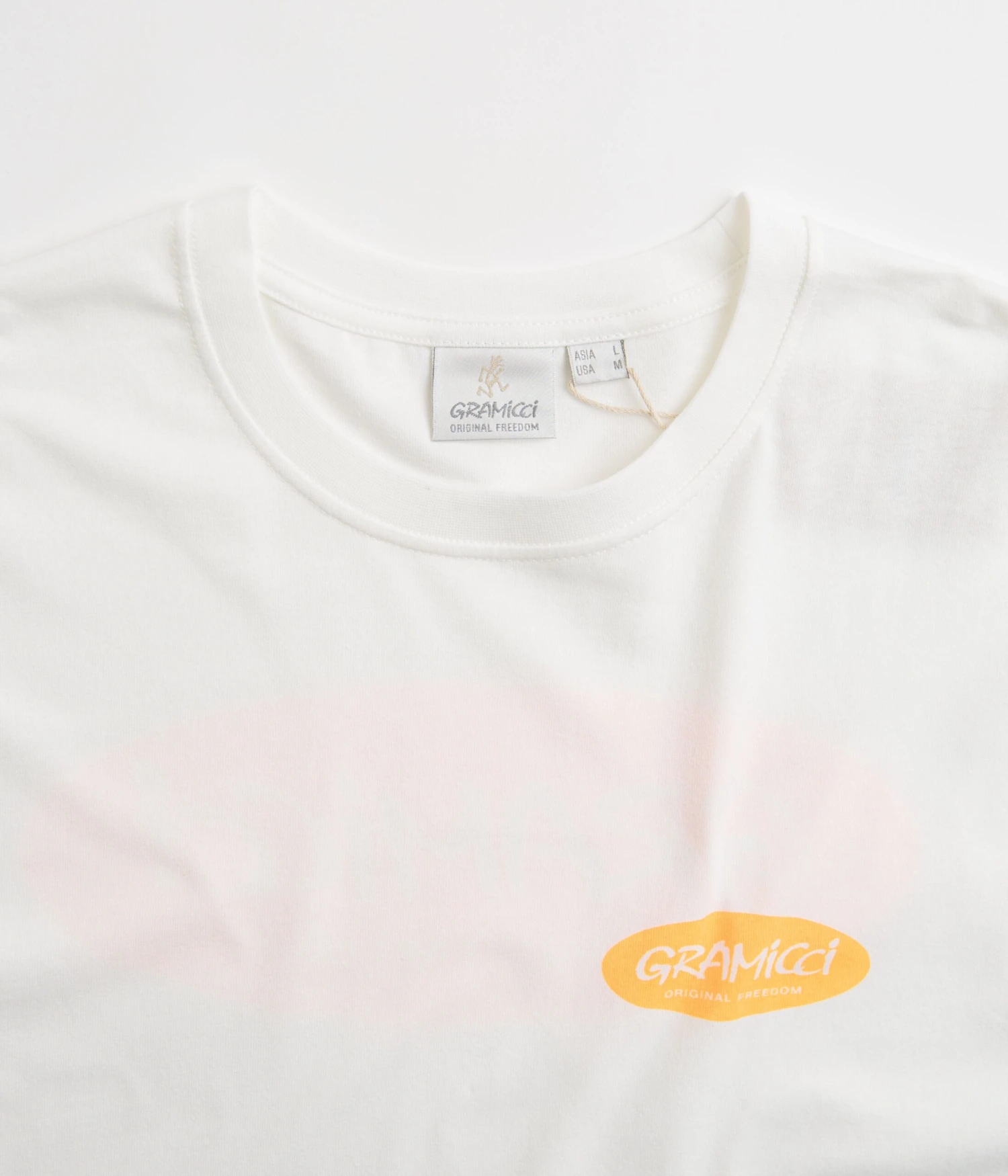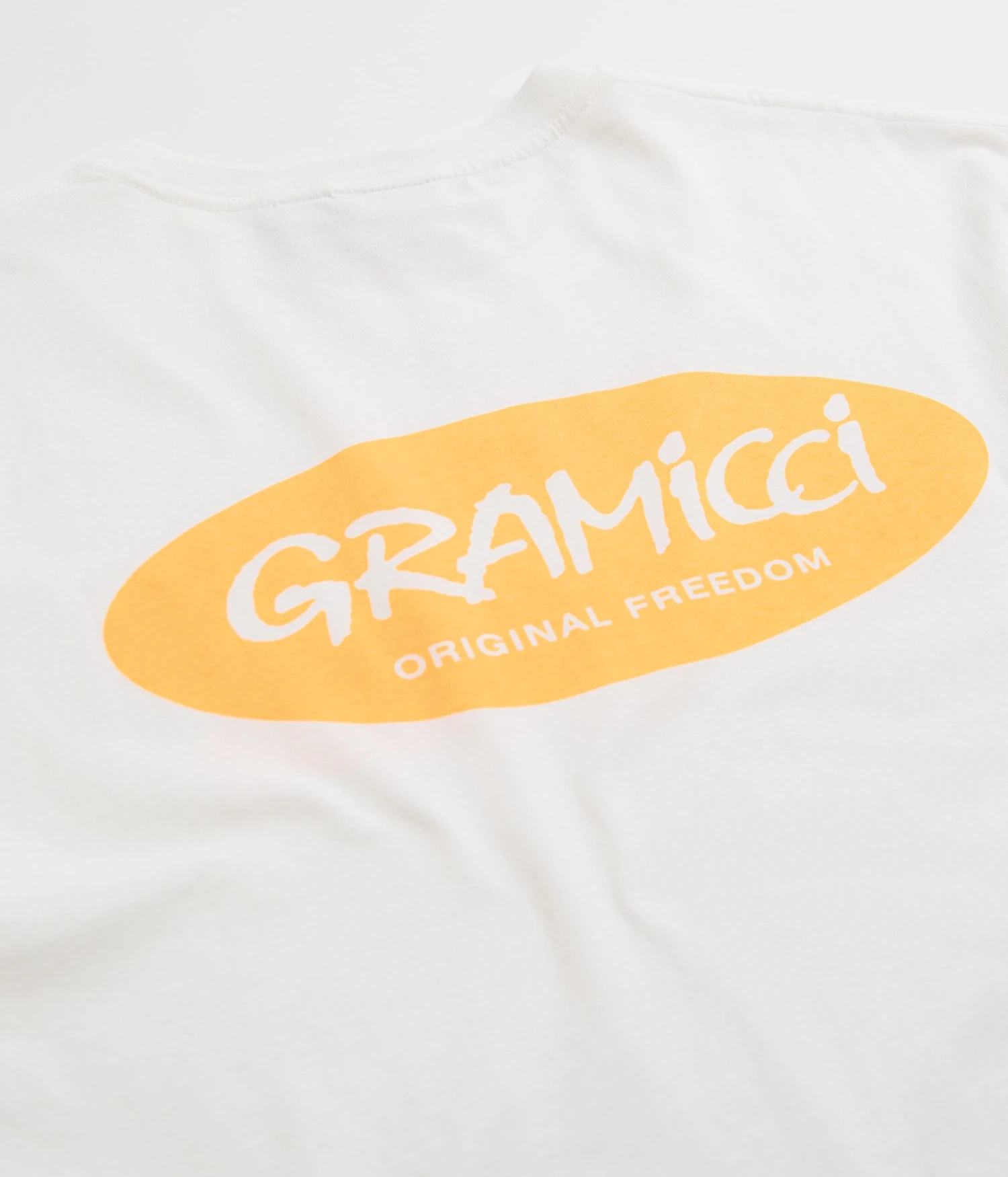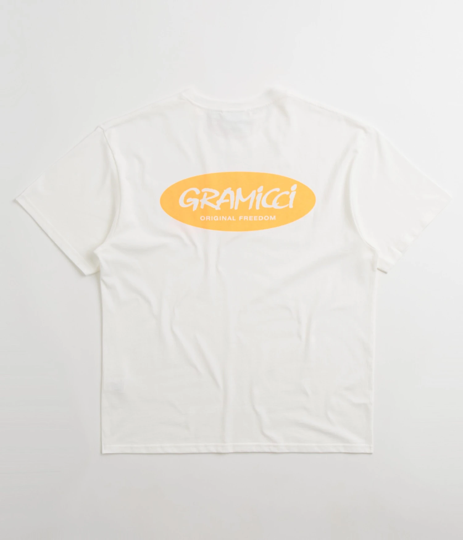 Gramicci Original Freedom Oval T-Shirt in White. Part of the brandās latest release, this regular fitting Gramicci t-shirt is styled with a rib knit collar and a straight cut hem. Finished in a shade of white with printed Original Freedom graphics displayed across both the left chest and reverse.