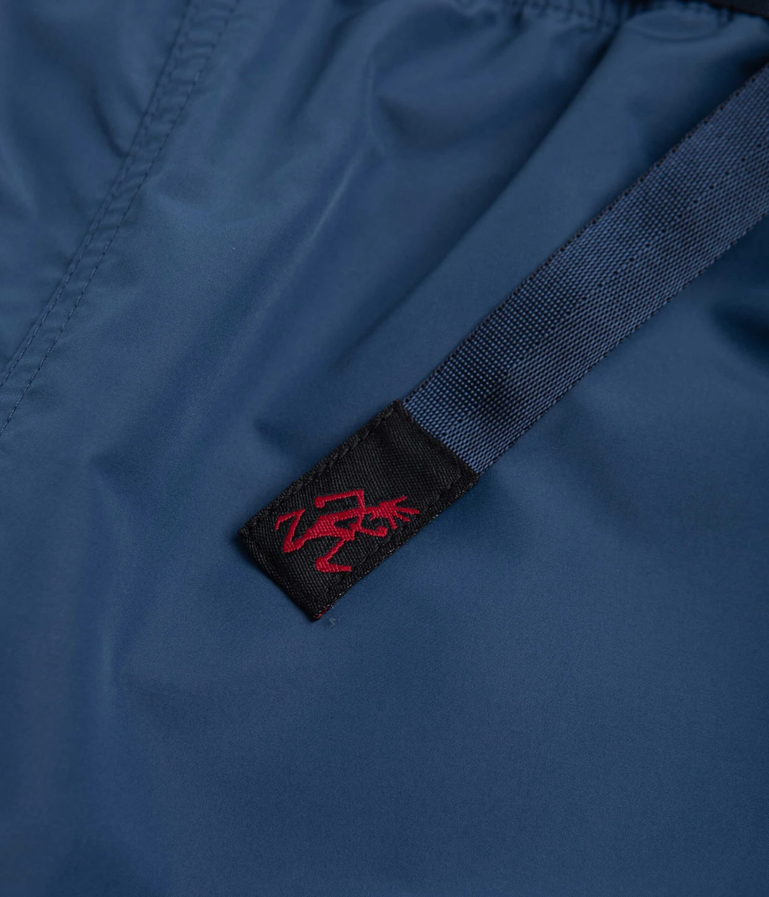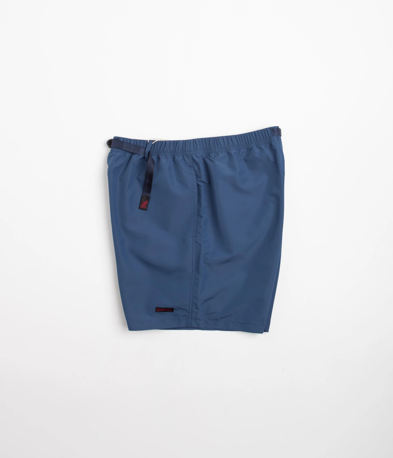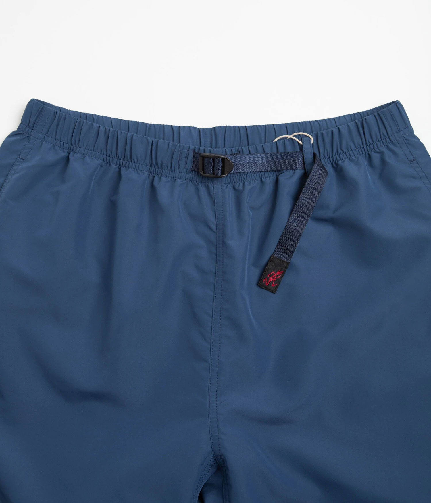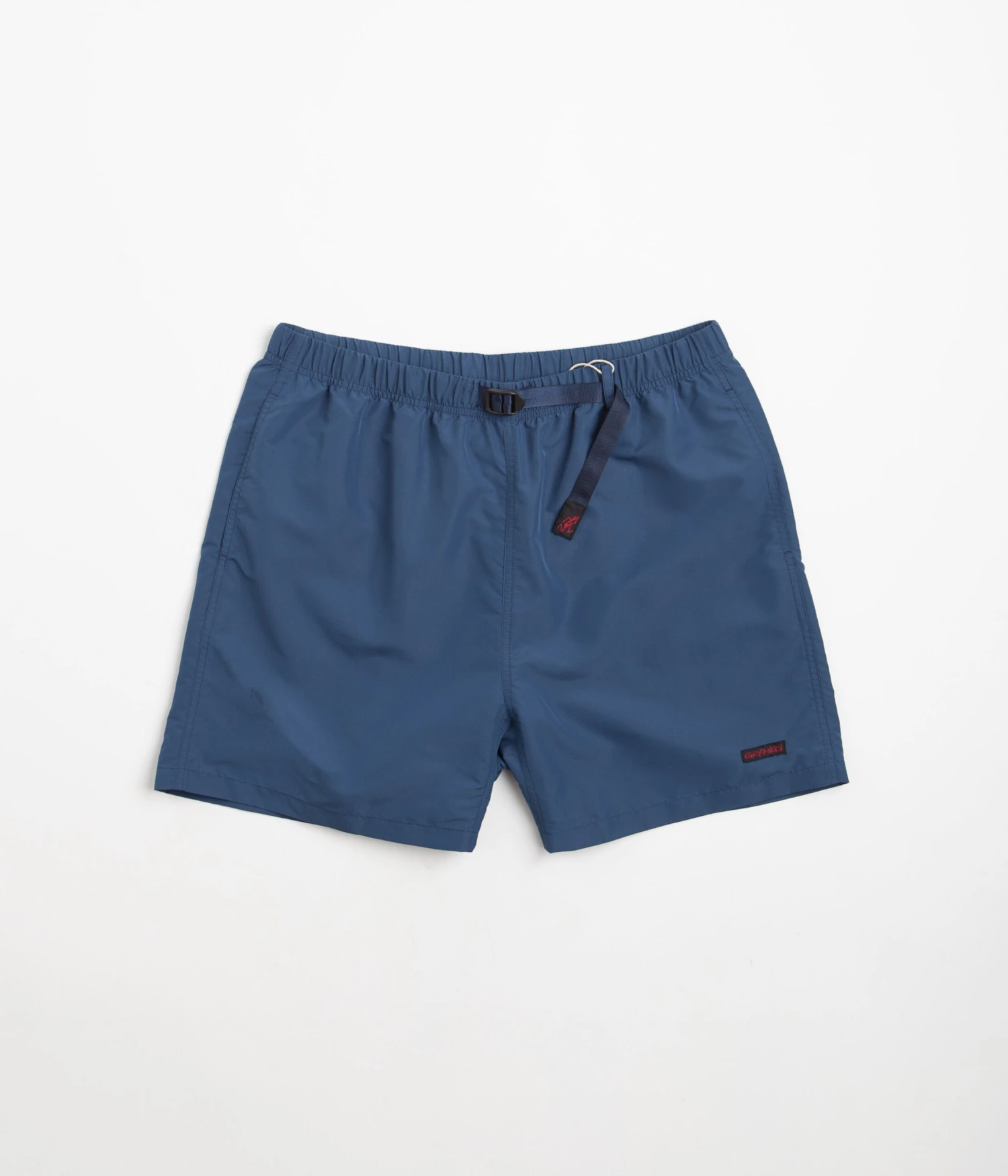 Gramicci Shell Canyon Shorts in Navy. Arriving as part of the brand’s latest collection, these relaxed fitting Gramicci shorts are designed with a water-resistant Active Shell. Featuring a woven elastic waistband, an integrated webbing belt and tonal stitched seams, these navy Gramicci shorts are cut to an above-knee length with two side pockets, a single rear flap pocket and embroidered flag label branding.Â