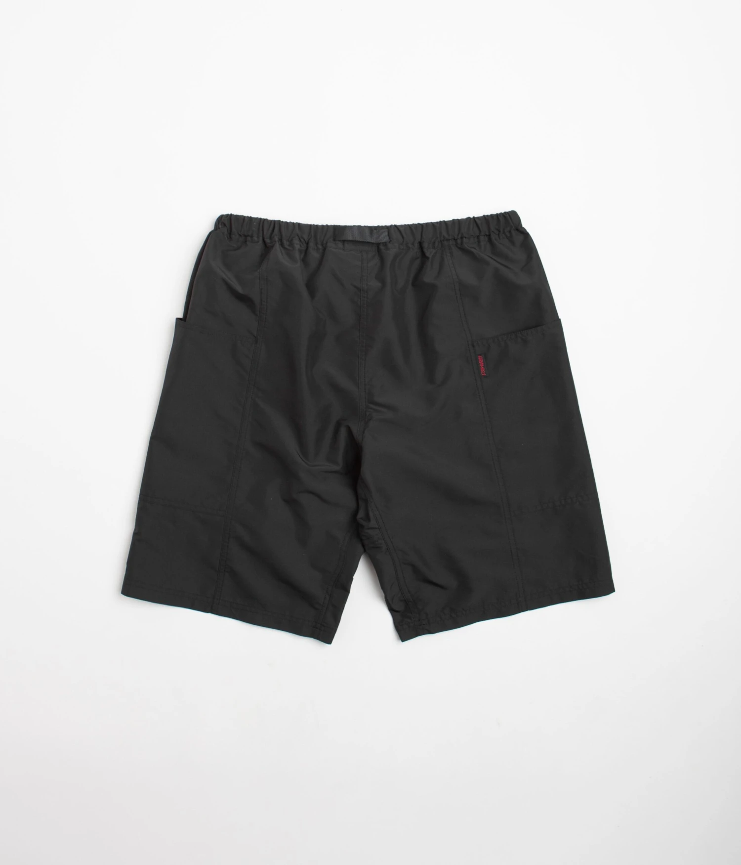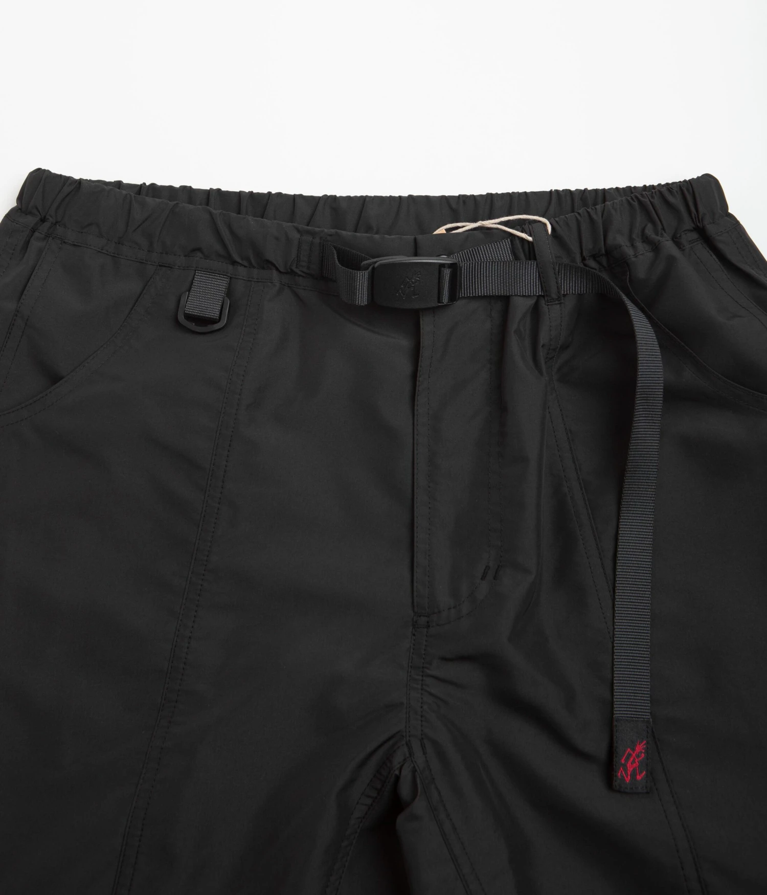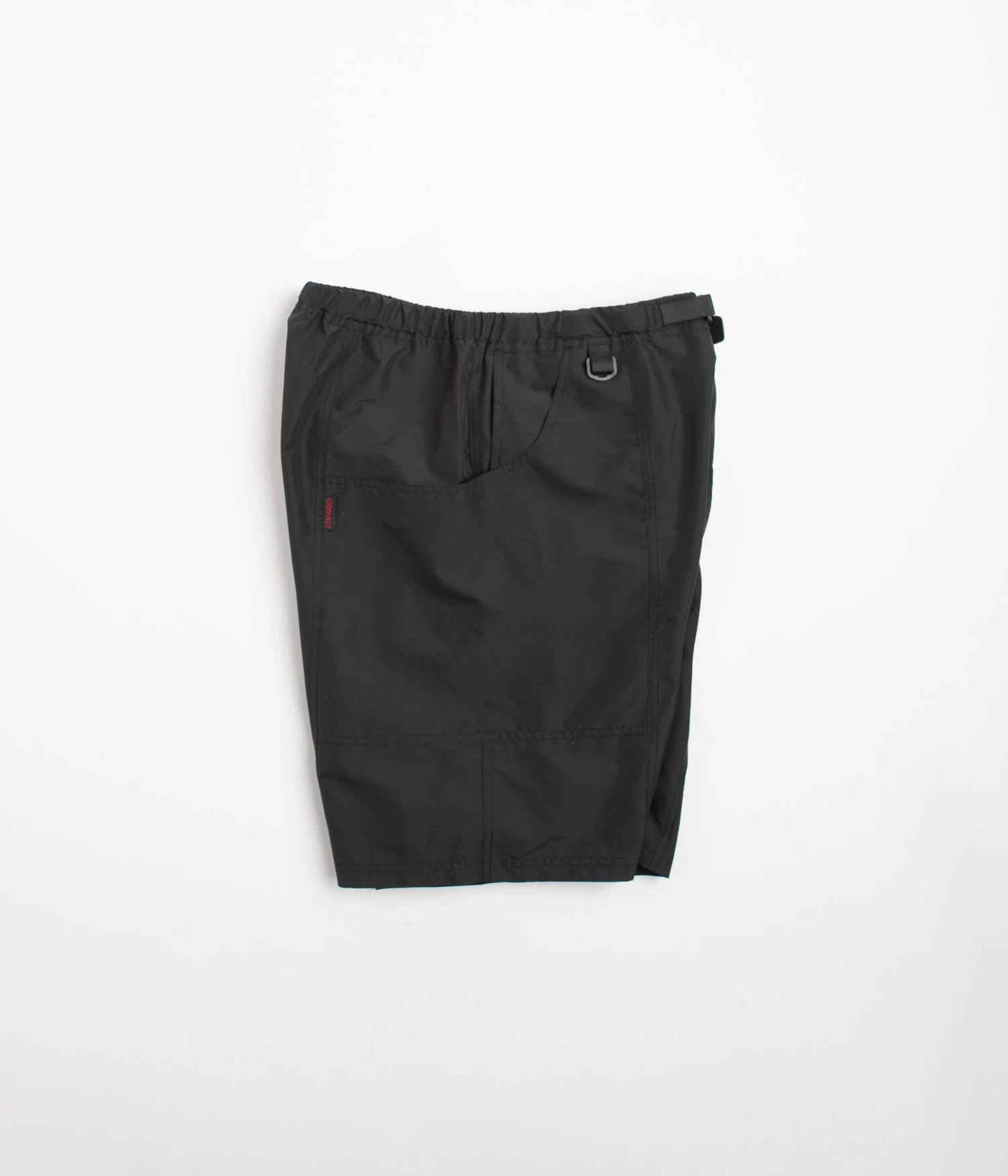 Gramicci Shell Gear Shorts in Black. Made from 100% polyester with a water-proof and windproof shell, these above-knee Gramicci shorts are tailored to a relaxed fitting with a 9” inseam. Featuring a gusseted crotch, an elasticated waist, an integrated webbing belt and an Active Shell fabrication, these black Gramicci shorts are finished with large double-layer pockets, a D-ring attachment and with woven flag label branding.