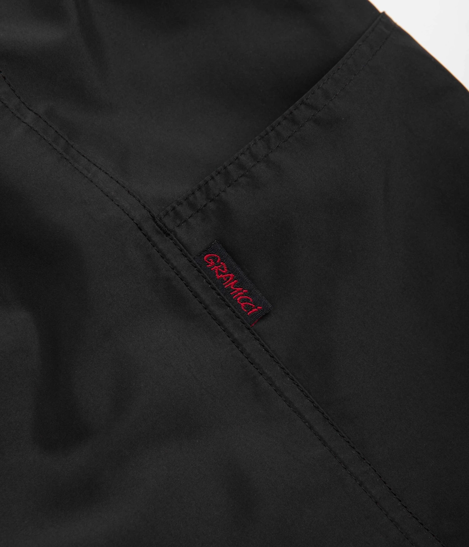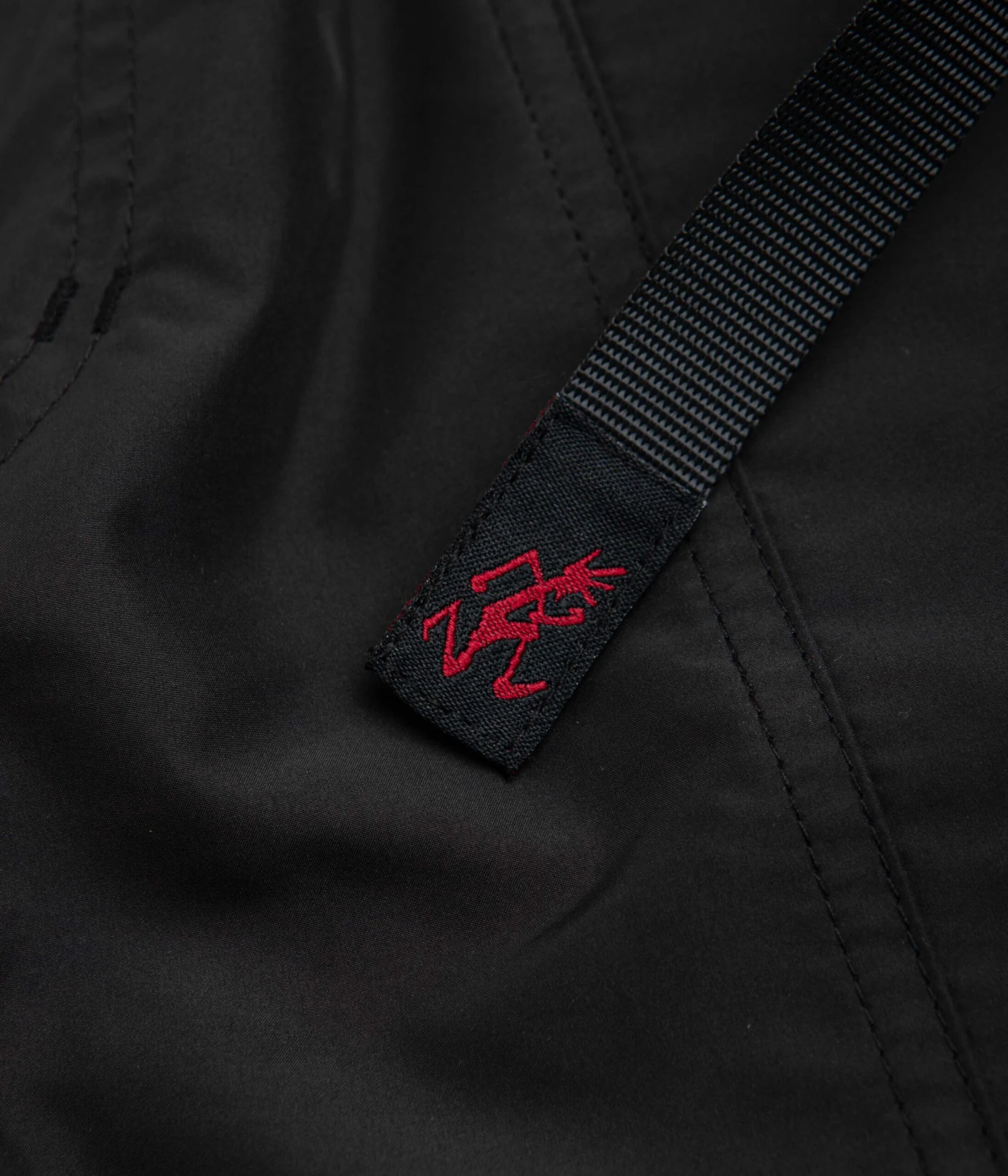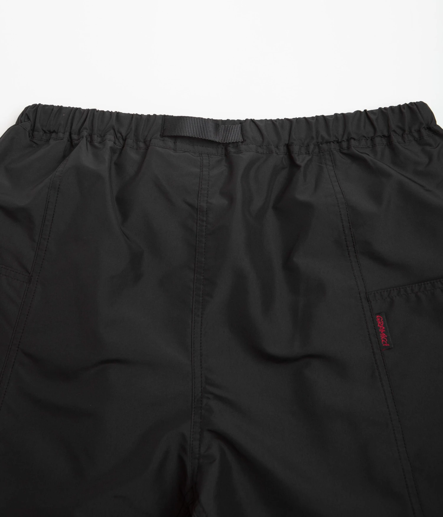 Gramicci Shell Gear Shorts in Black. Made from 100% polyester with a water-proof and windproof shell, these above-knee Gramicci shorts are tailored to a relaxed fitting with a 9” inseam. Featuring a gusseted crotch, an elasticated waist, an integrated webbing belt and an Active Shell fabrication, these black Gramicci shorts are finished with large double-layer pockets, a D-ring attachment and with woven flag label branding.
