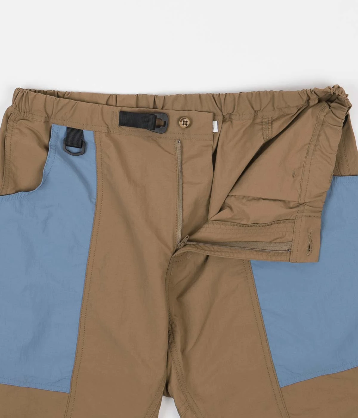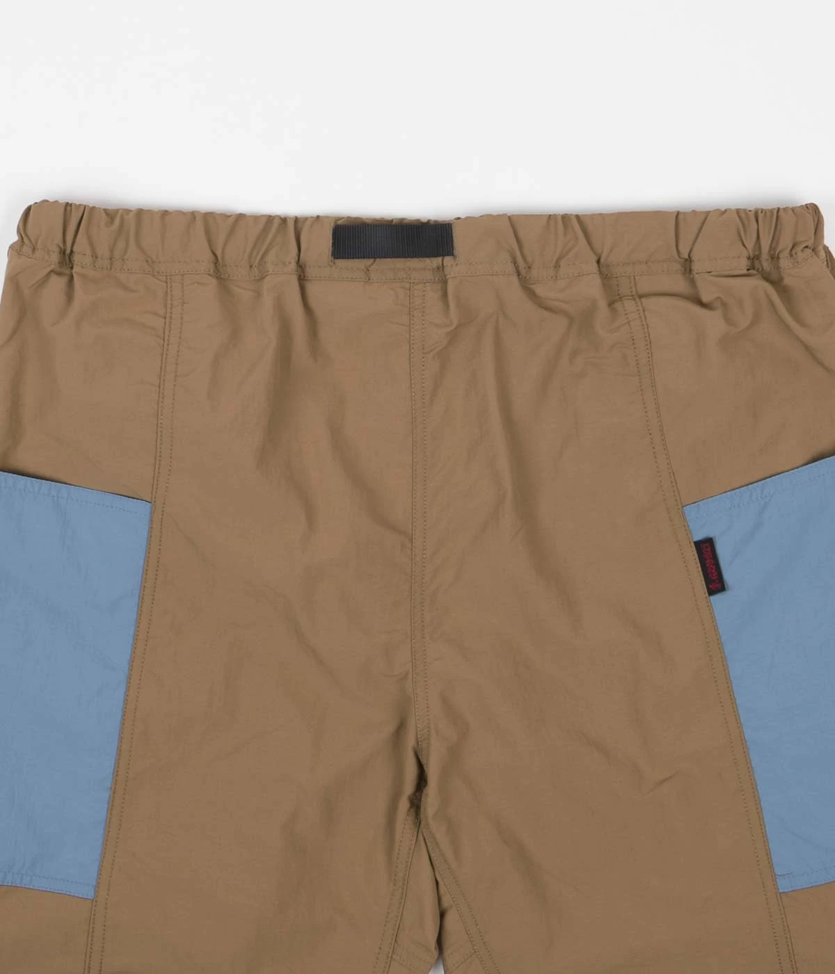 Gramicci Shell Gear Shorts in Tan and Sax. An evolution of the classic ST-short design and styled with a patchwork twist, these chlorine-safe durable nylon Gramicci shorts arrive as part of the brand’s latest instalment for SS21. Tailored to a classic fitting for comfortable looseness that’s wearable both on land and in the water, these above-knee shorts feature an elasticated waistband, a 9” inseam, an integrated nylon-cinch webbed belt and traditional gusseted crotch that allows for 180-degree splits. Tonal bartack stitchings complement the two-tone design, whilst the washed-blue front-facing pockets feature water pass-through internal pockets for added in-water function. A handy D-ring attachment can be found on the right front-pocket.