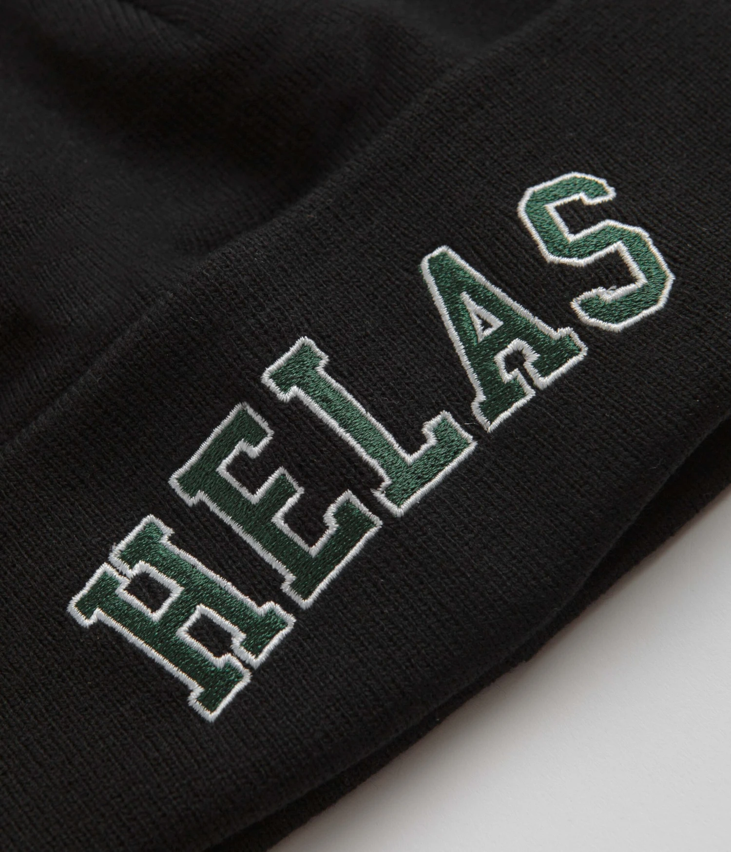 Hélas Campus Beanie in Black. Single sized with a stretchy rib knit face, this Hélas beanie is made from 100% acrylic. Finished in a shade of black with an adjustable fold-over cuff, tonal stitched seams and with embroidered Hélas front branding.